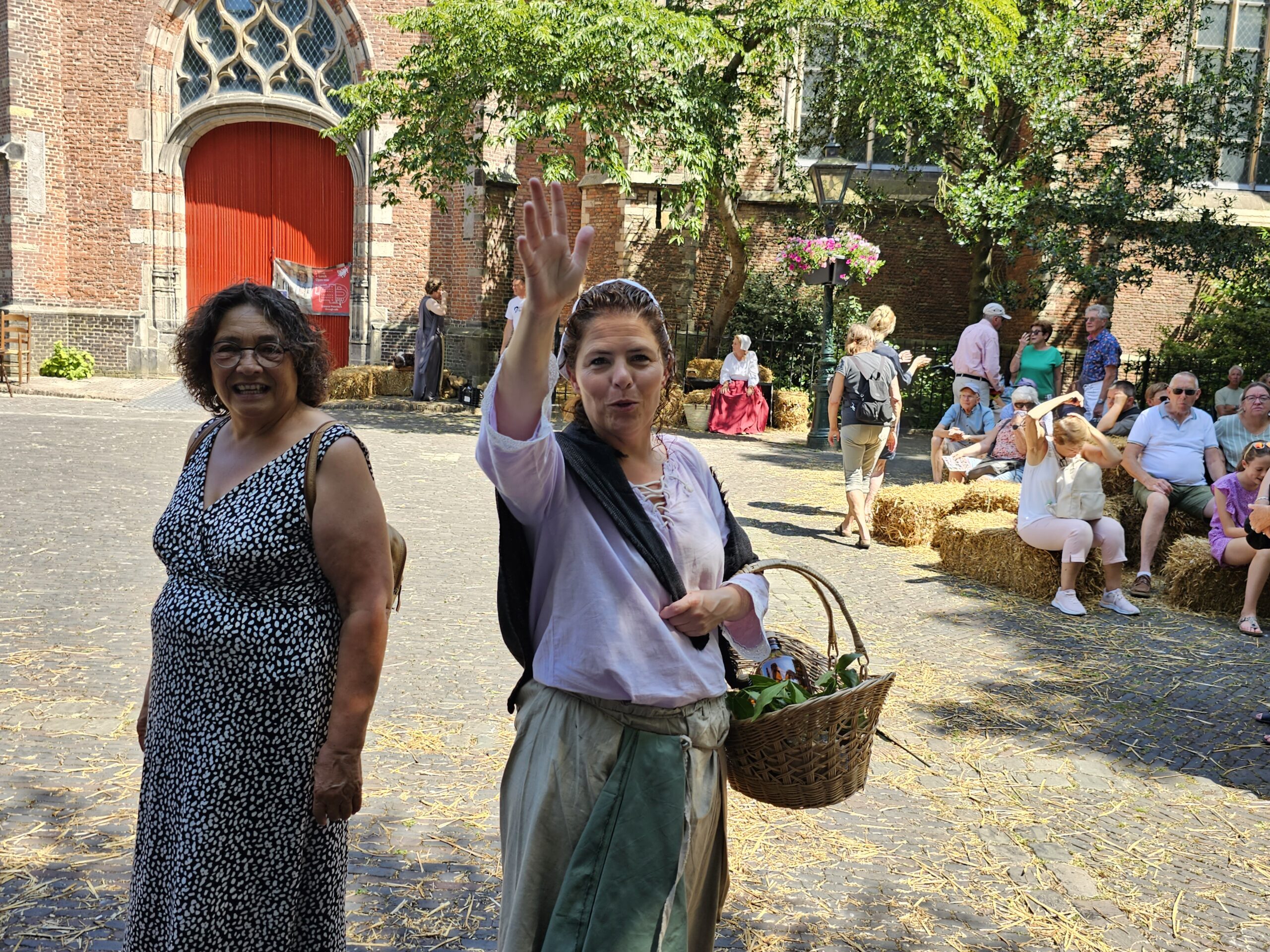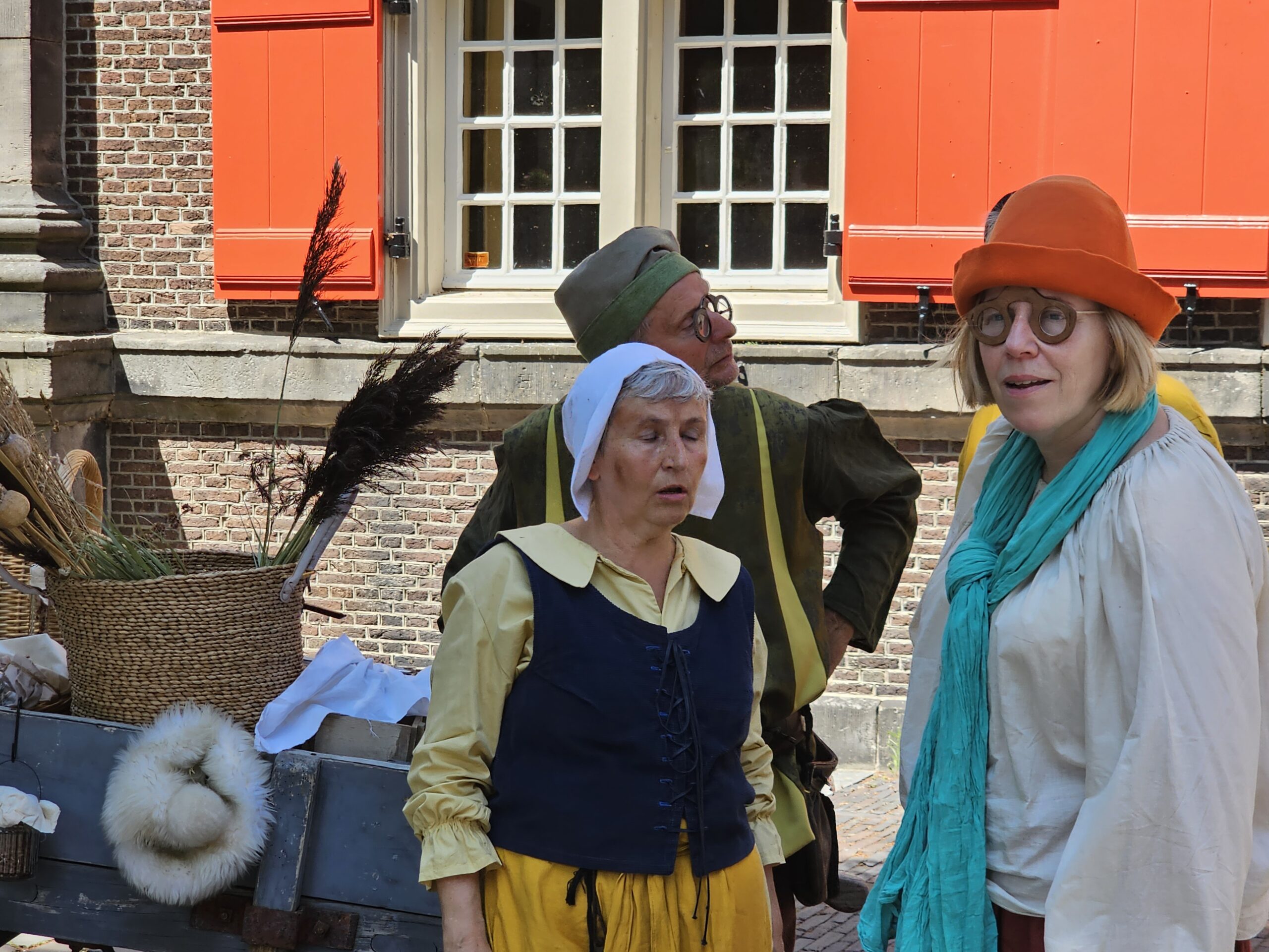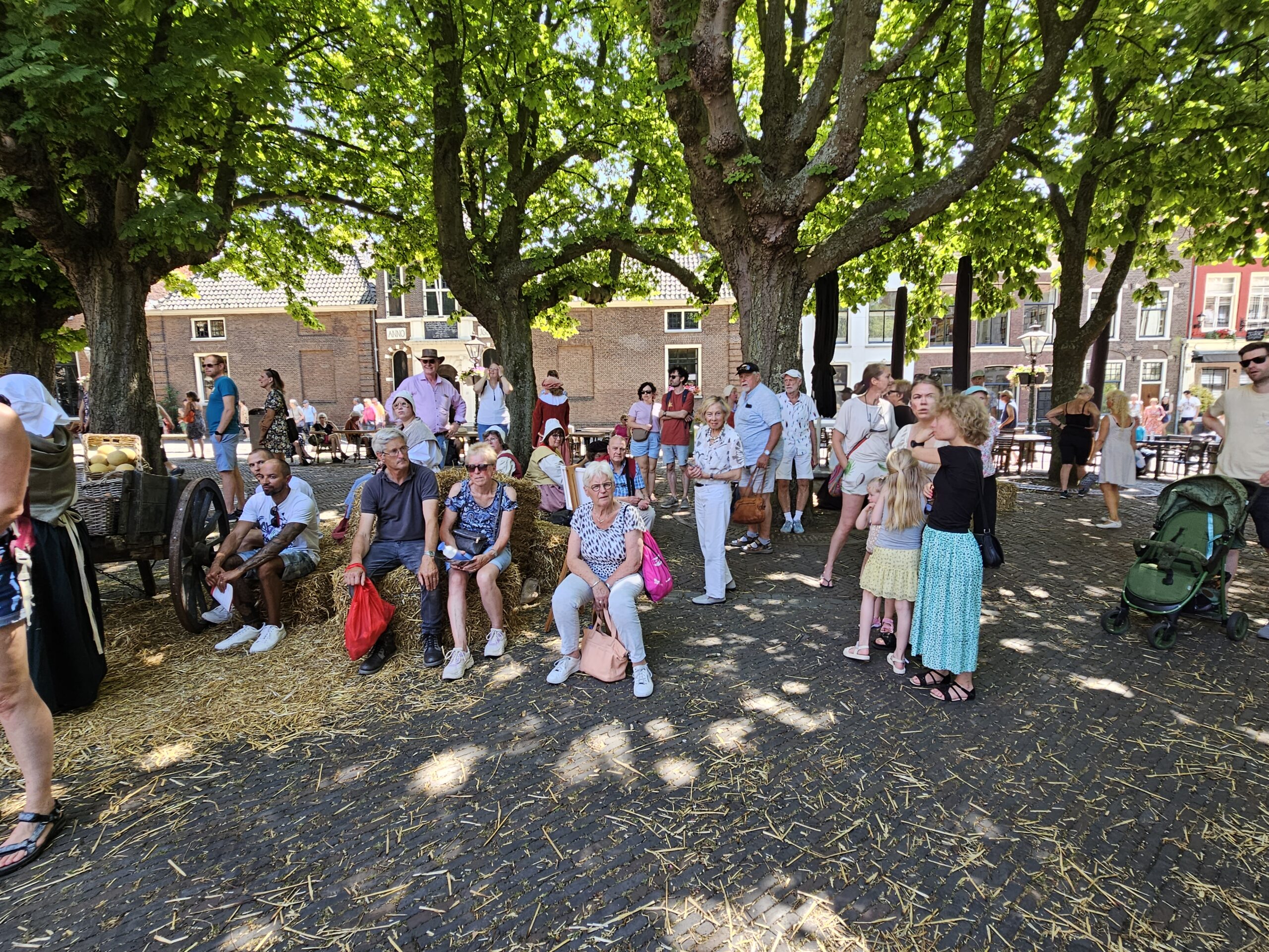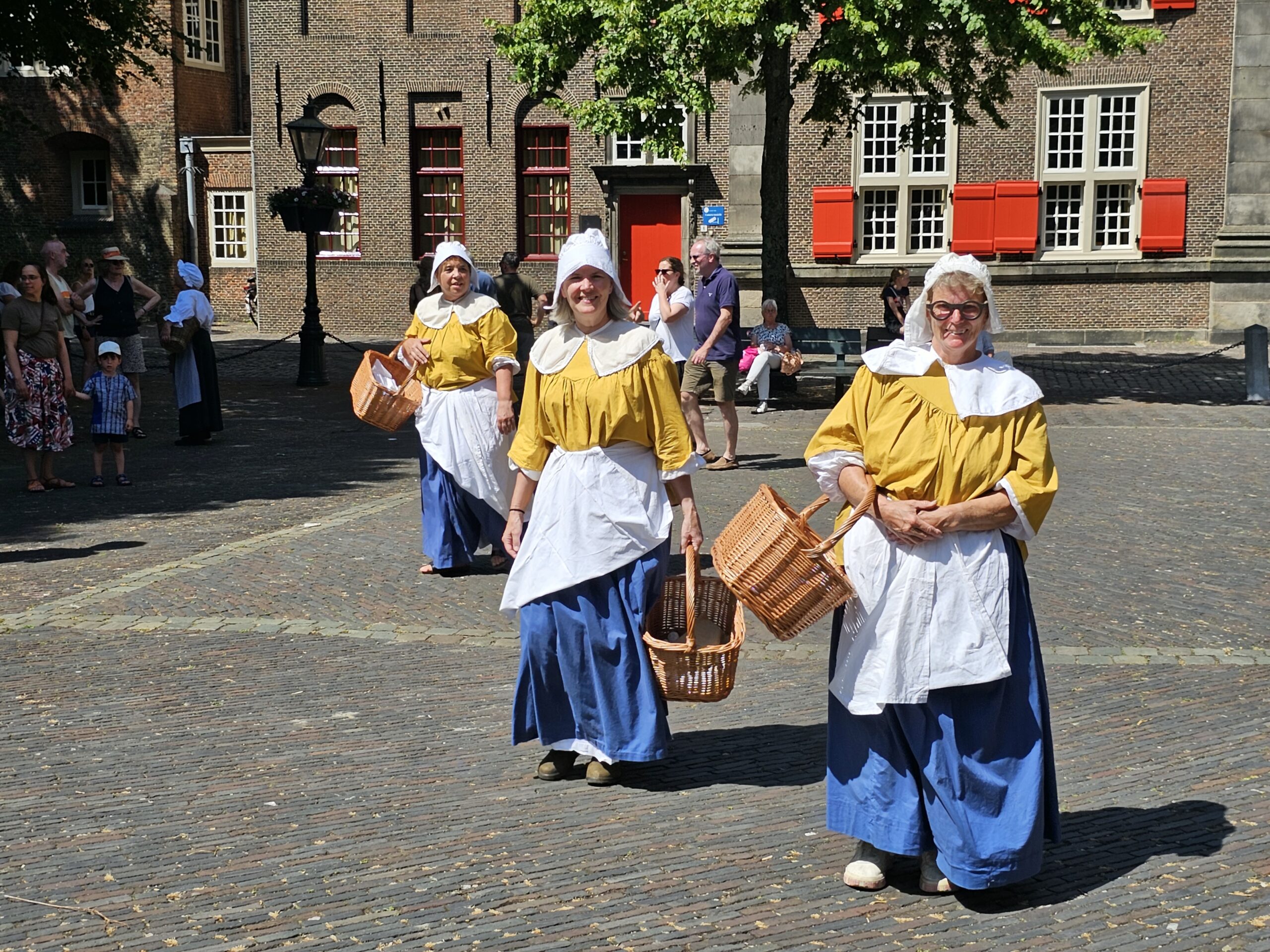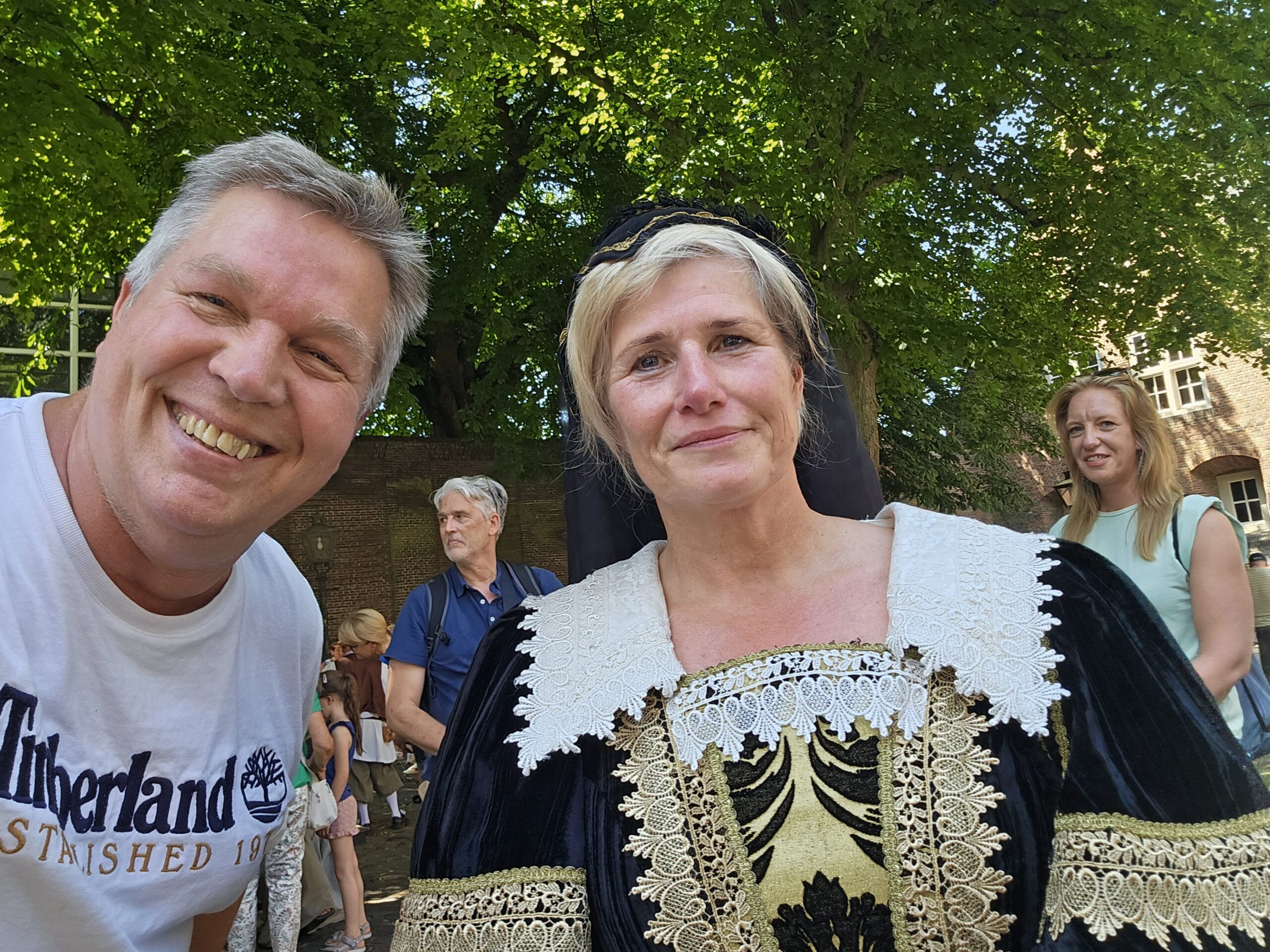 Een bijzonder tafereel speelde zich zaterdagmiddag af op het Pieterskerkhof. Daar trad het voltallige 17e eeuwse stadsbestuur aan om zich te laten portretteren. Als dank van de pelgrims die zo gastvrij in Leiden werden opgenomen.
