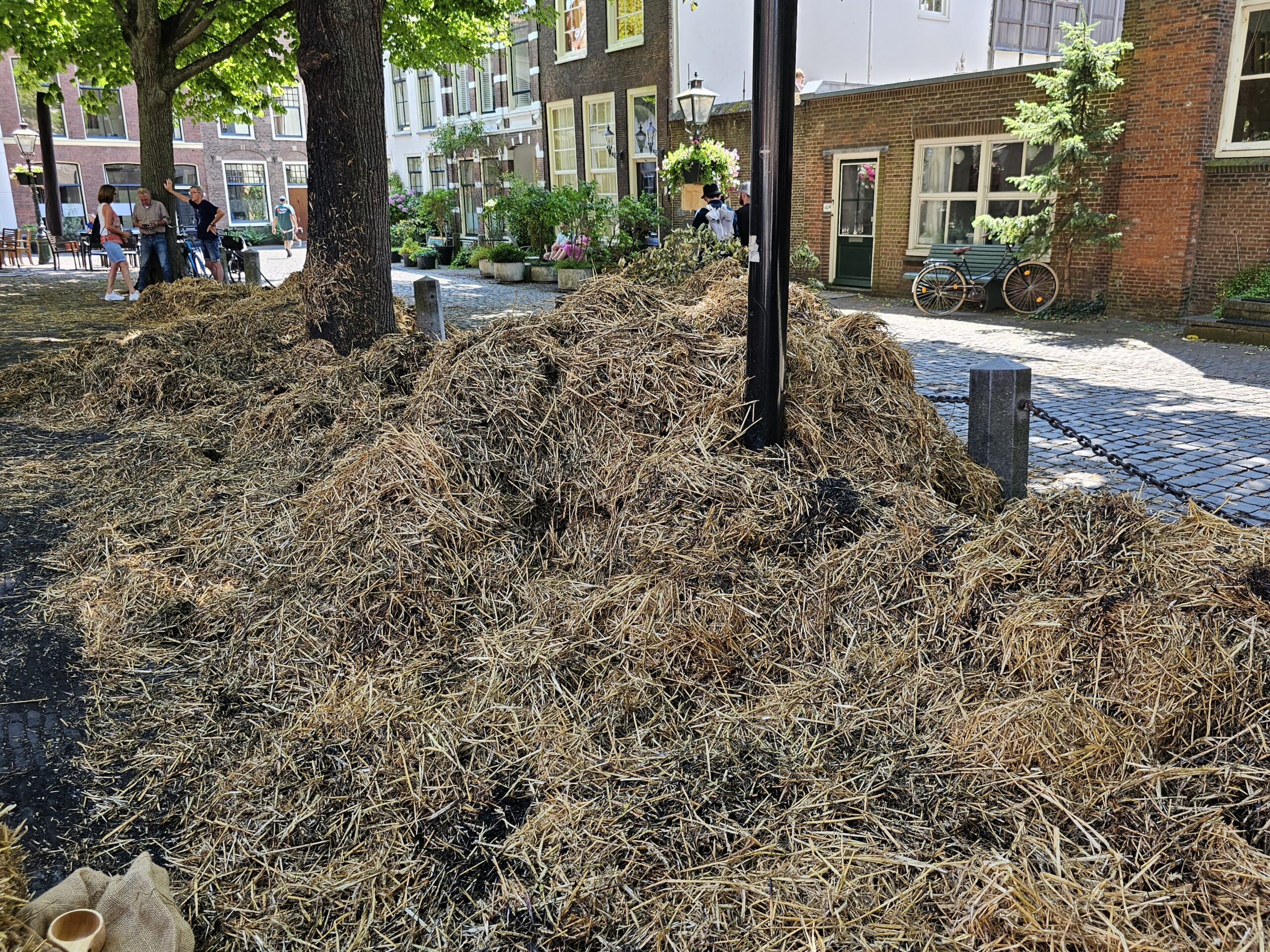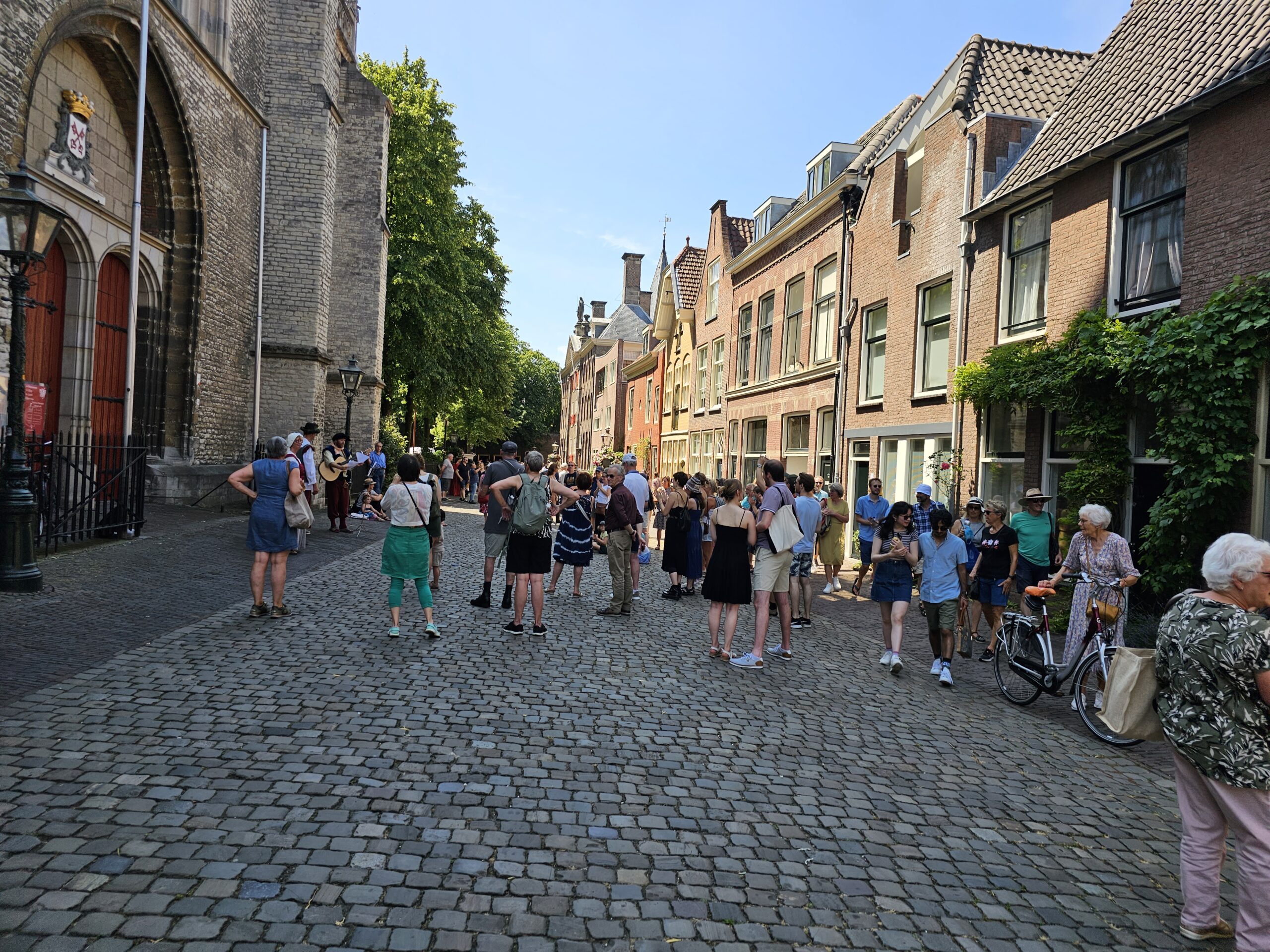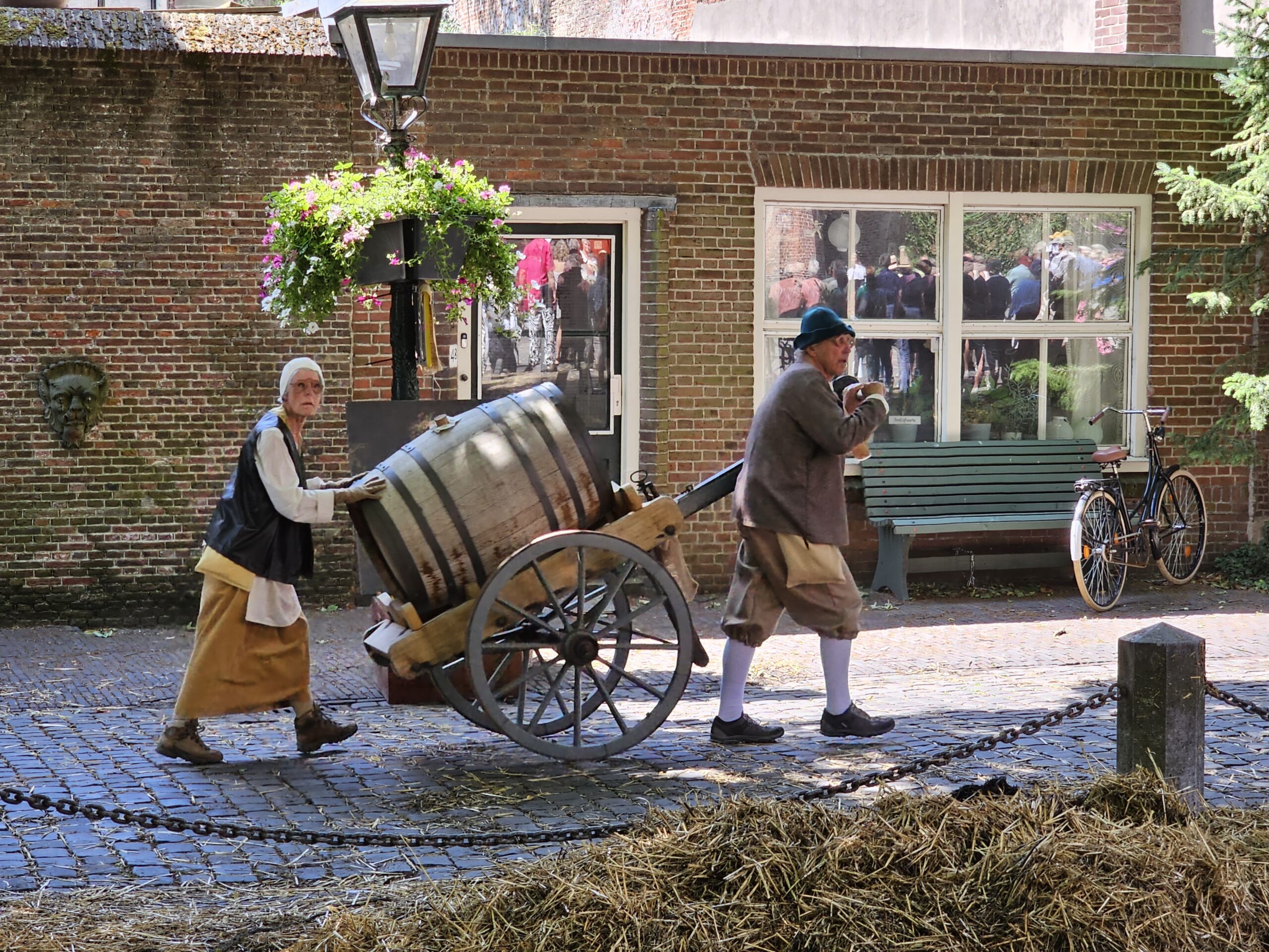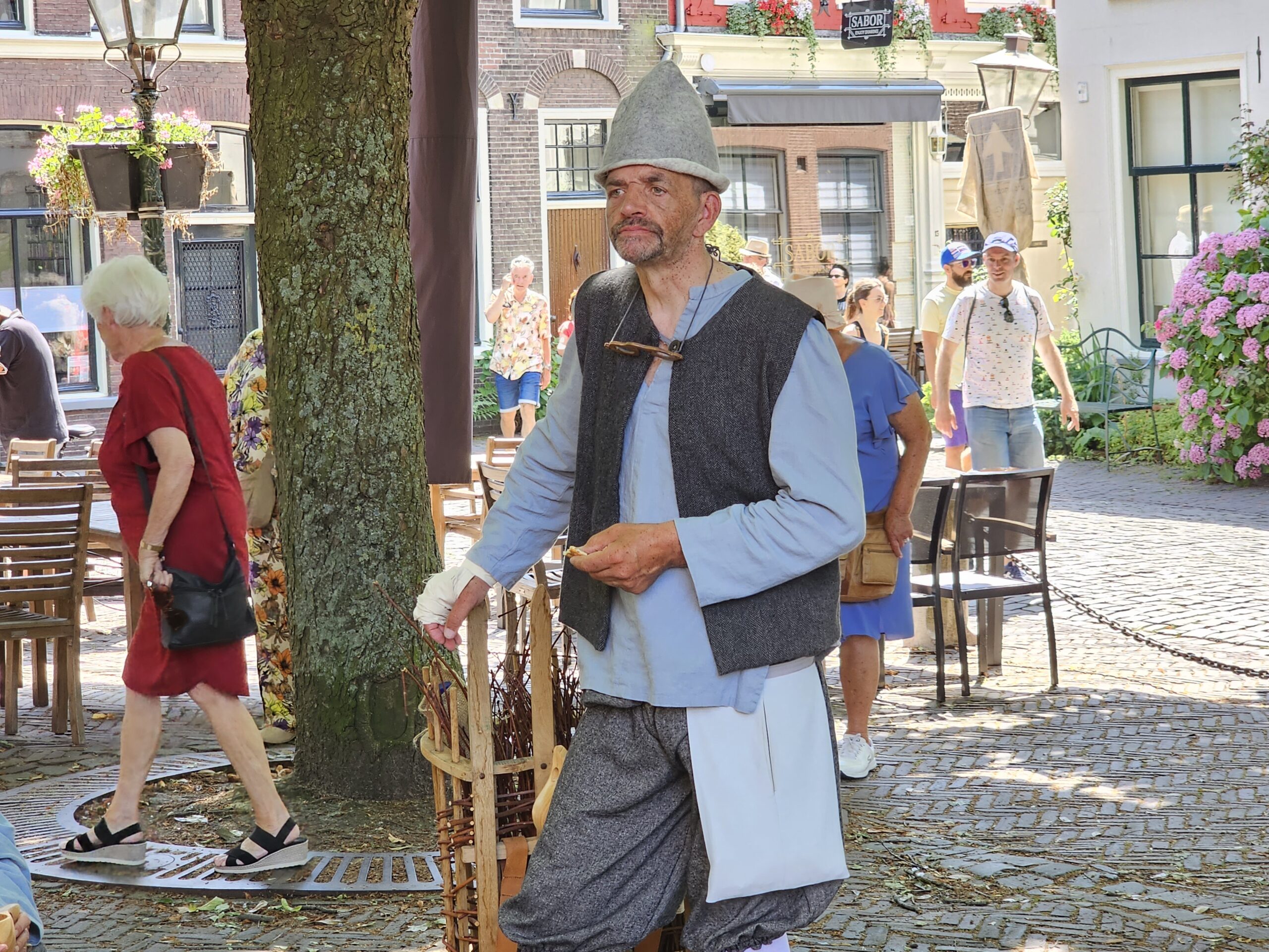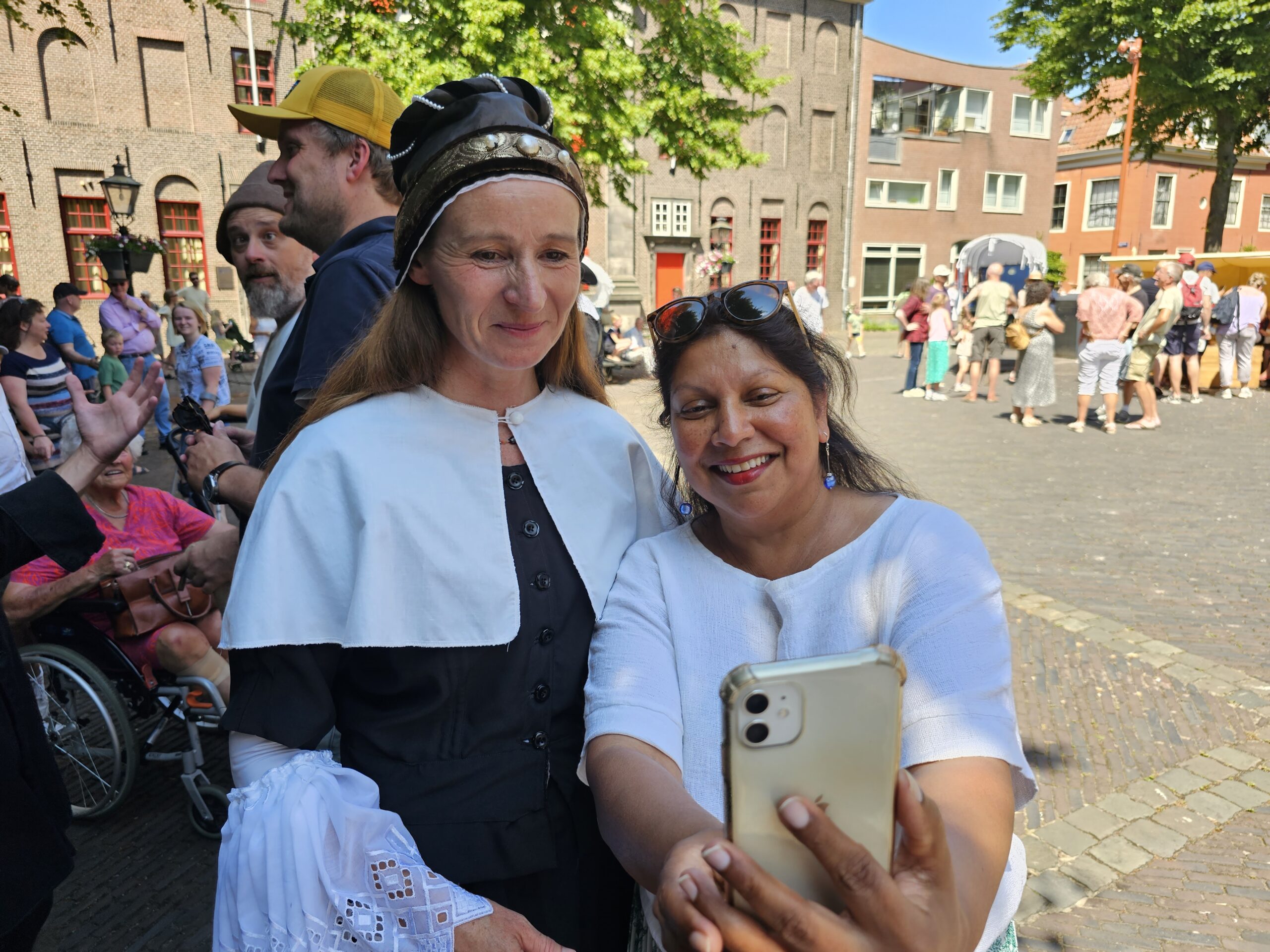 Een bijzonder tafereel speelde zich zaterdagmiddag af op het Pieterskerkhof. Daar trad het voltallige 17e eeuwse stadsbestuur aan om zich te laten portretteren. Als dank van de pelgrims die zo gastvrij in Leiden werden opgenomen.