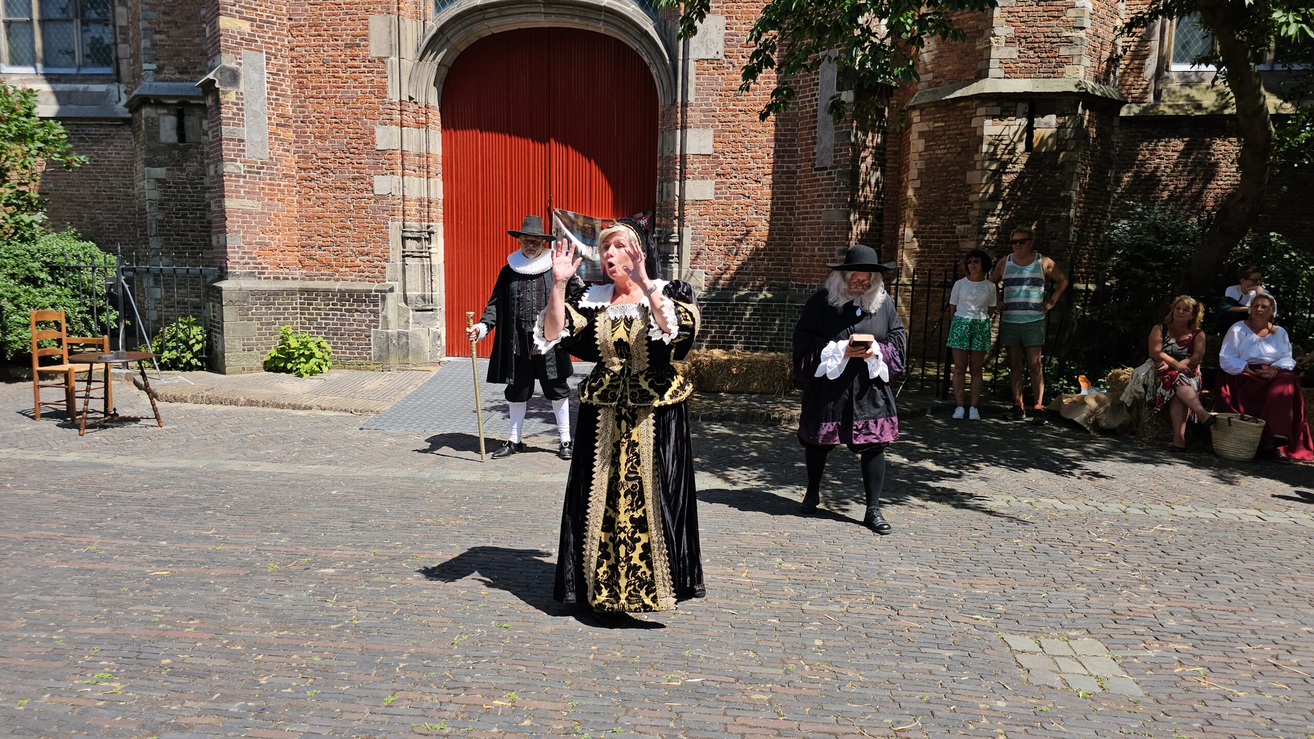 Achtereenvolgens kwamen burgemeester Heer Van Lenferink, regentes Vrouwe van Delft van het regentessencollege van de Meermansburg, Lord North, Heer Jermoumi, regentes Spijker van het regentessencollege van het Stadsweeshuis en Stadsbouwmeester Heer Terpstra naar voren. Het was een van de bijzondere onderdelen van de Rembrandt Dagen Leiden die ook zondag nog worden georganiseerd in het gebied rond de Pieterskerk en het Rapenburg.