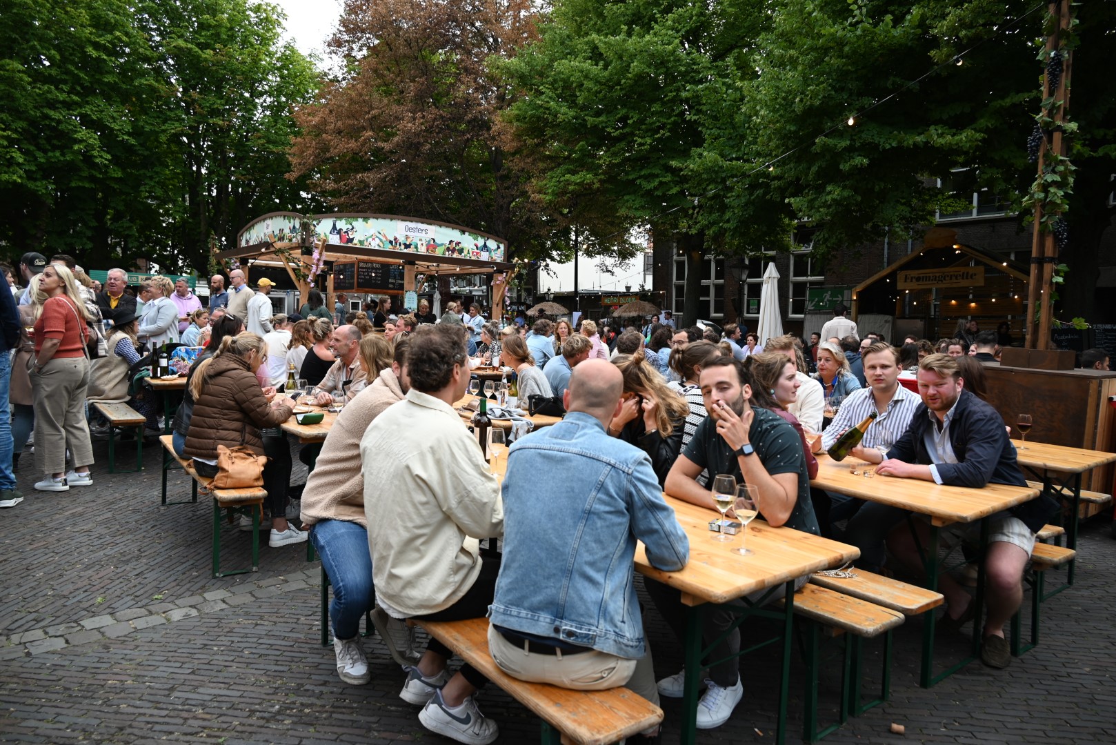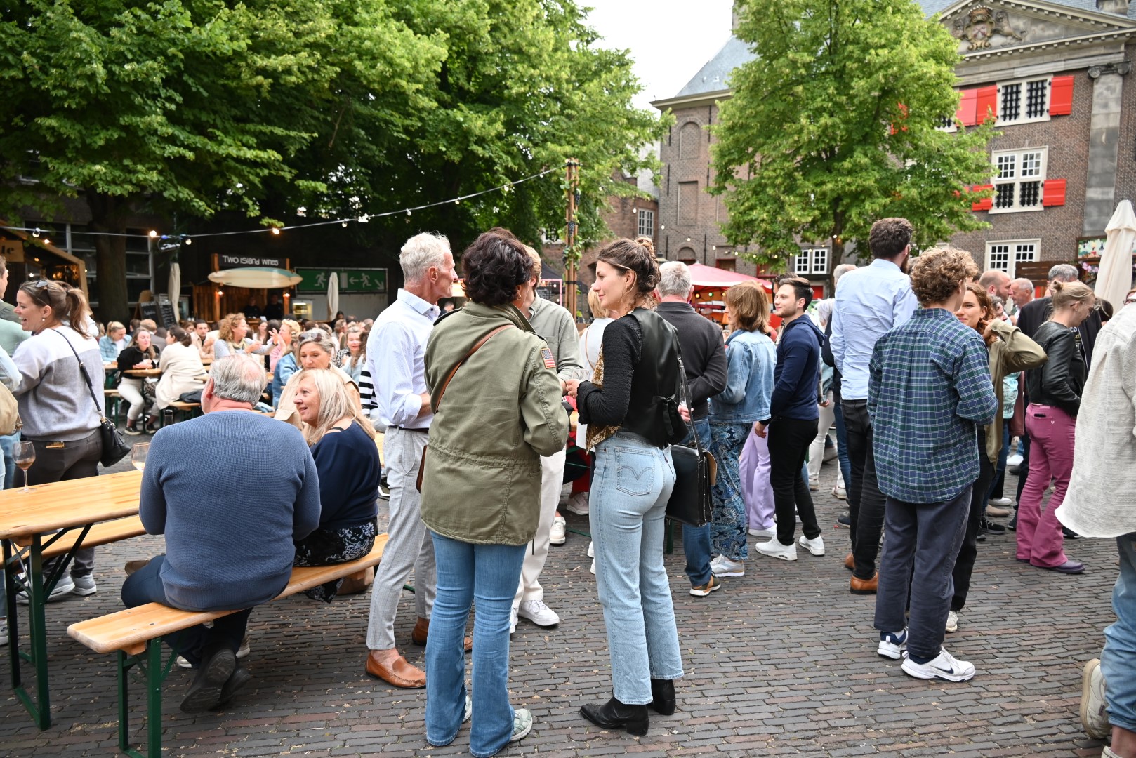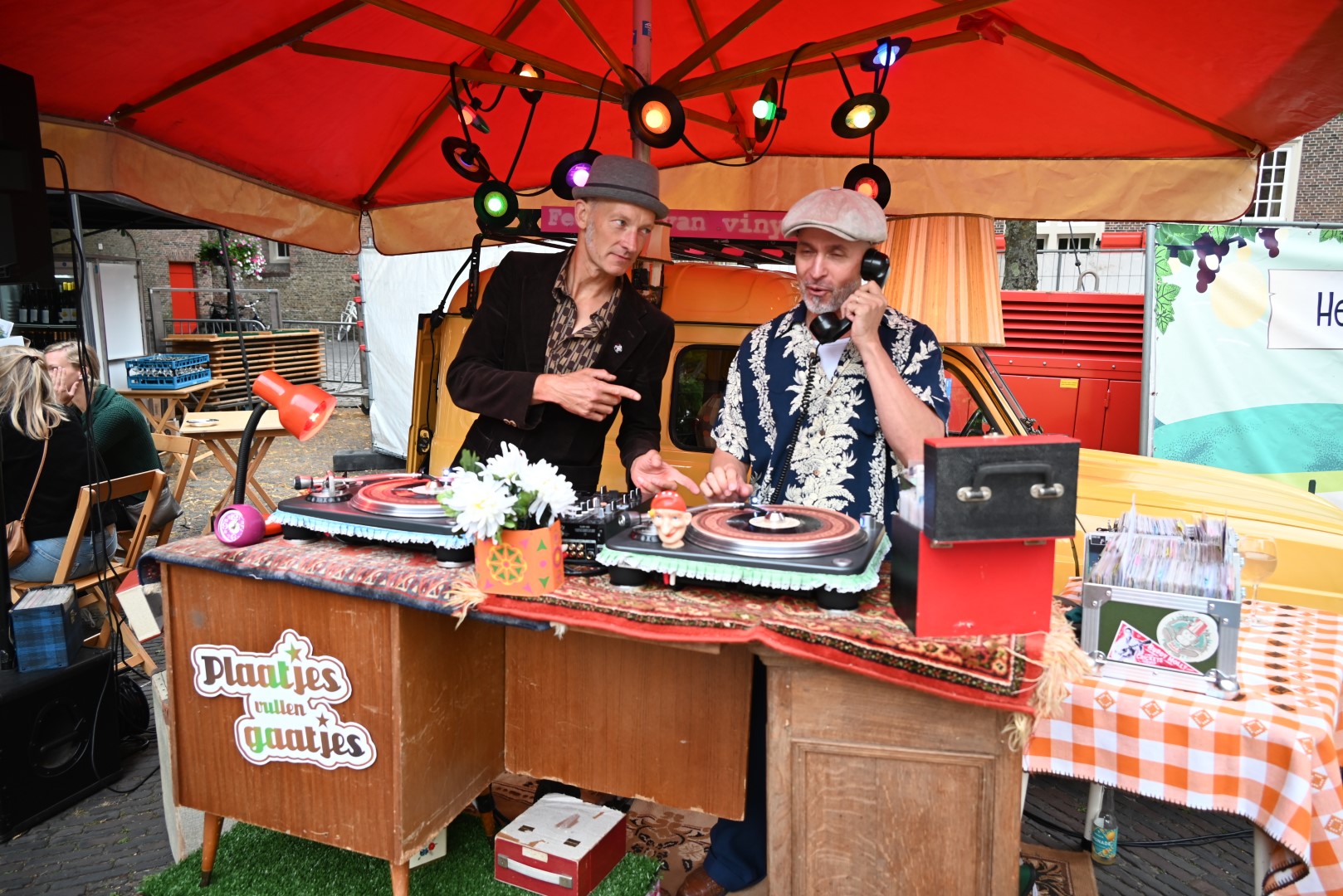 Op vrijdagavond waren bijna alle zitplaatsen op het Pieterskerkplein bezet. “Jammer dat het zaterdagavond ging regenen”, zegt Emile van Aelst. “Maar ondanks dat had iedereen het naar zijn zin.” Voor de muzikale omlijsting zorgde Pieter van Geest en Erik Oijerhoek van Plaatjes vullen Gaatjes.