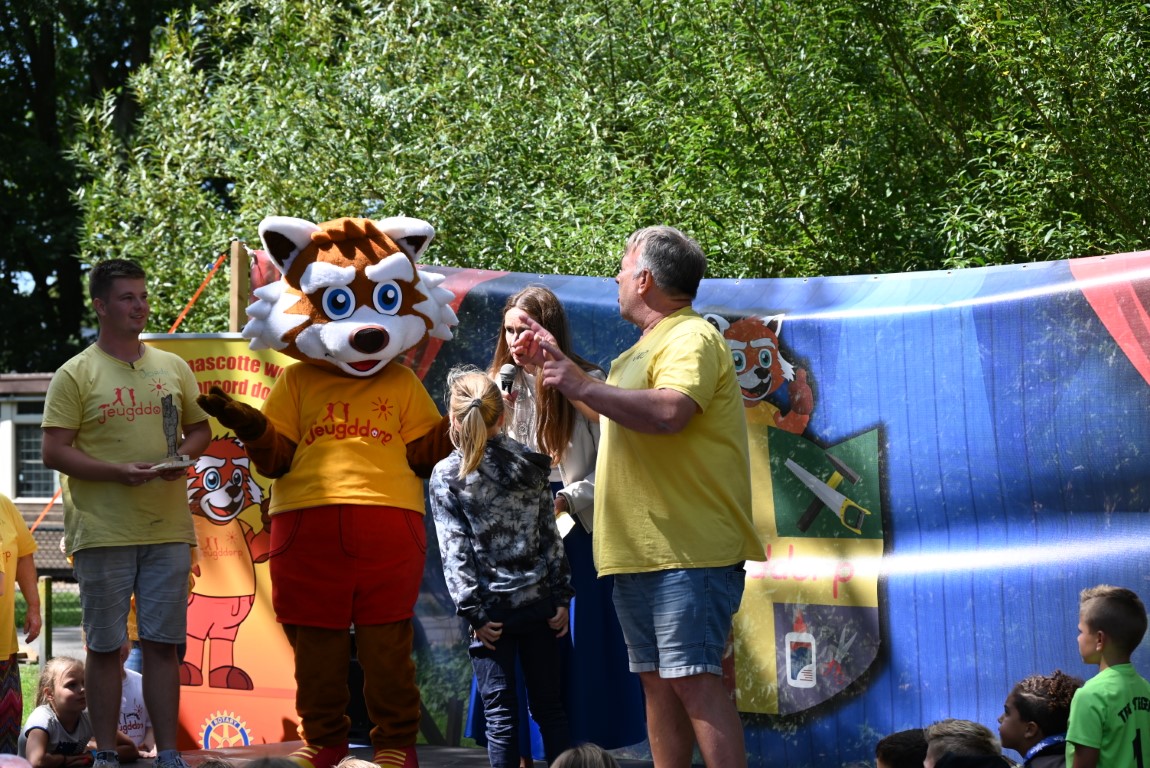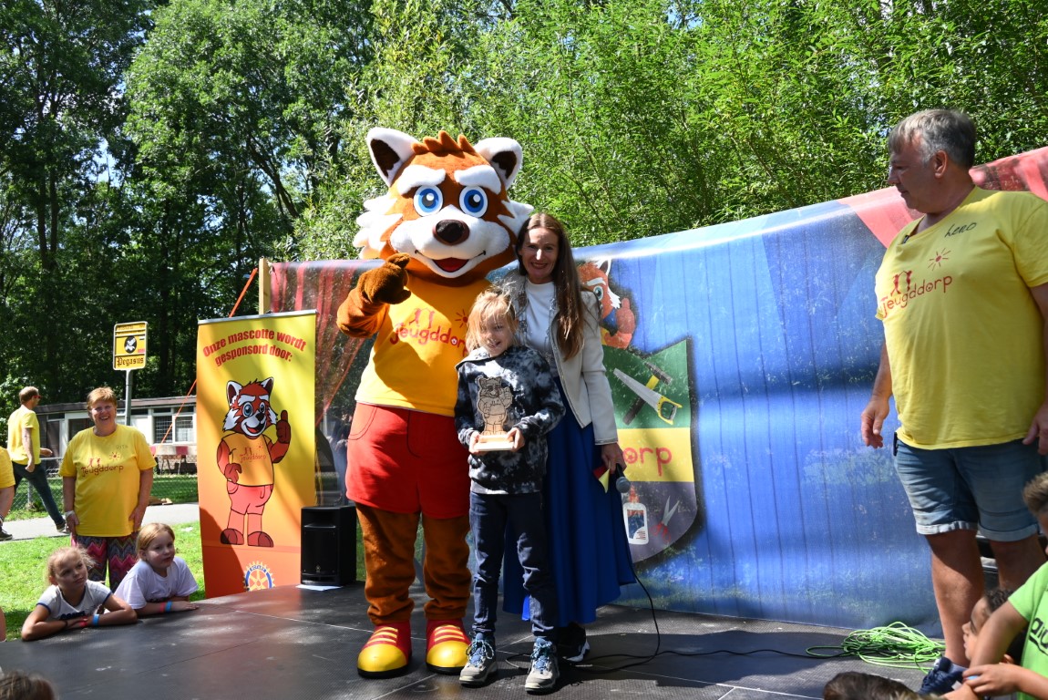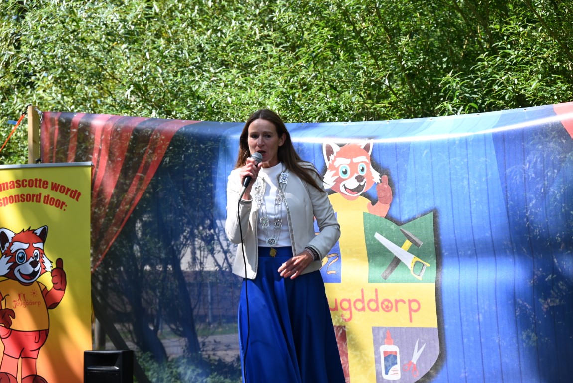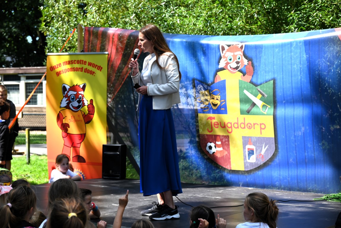 Behalve het openen van Jeugddorp had de wethouder nog een paar belangrijke taken. Ze maakte bekend dat Bo de mooiste tekening van de nieuwe mascotte had gemaakt en dat Jet en Suze de mooiste naam voor de mascotte hadden bedacht, die vanaf nu Rover gaat heten.