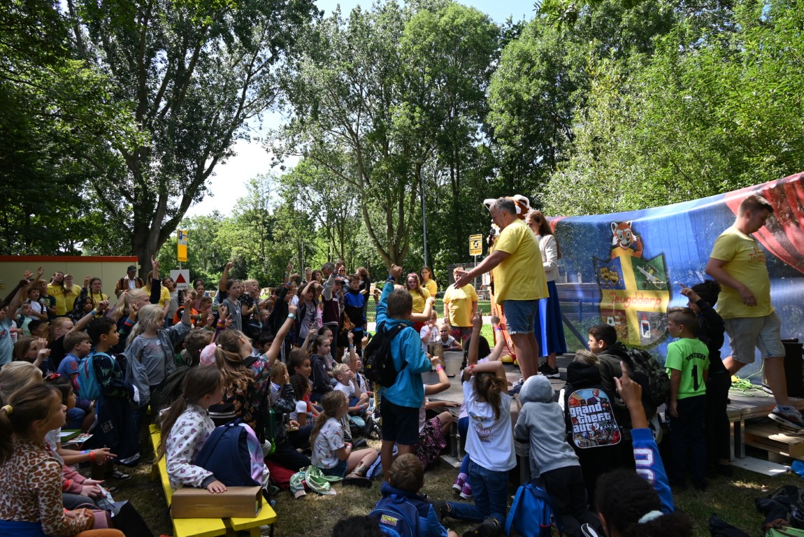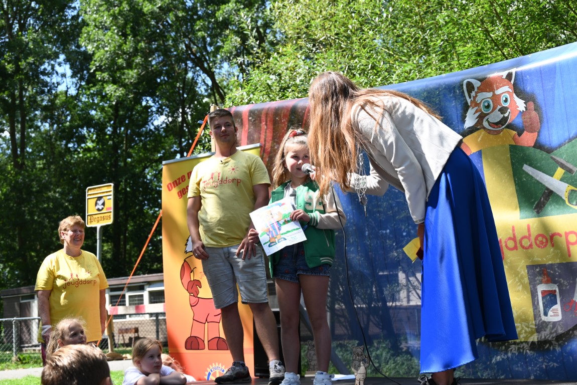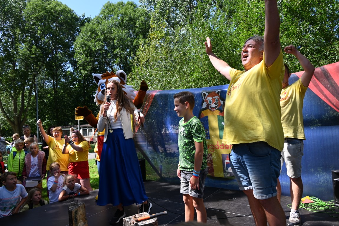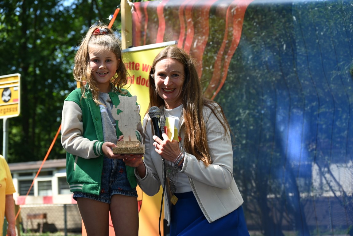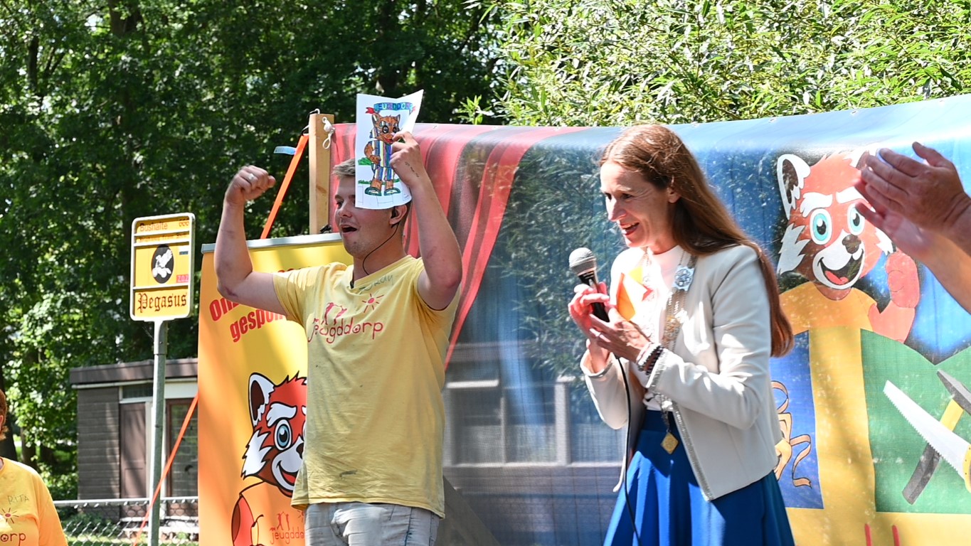 Behalve het openen van Jeugddorp had de wethouder nog een paar belangrijke taken. Ze maakte bekend dat Bo de mooiste tekening van de nieuwe mascotte had gemaakt en dat Jet en Suze de mooiste naam voor de mascotte hadden bedacht, die vanaf nu Rover gaat heten.