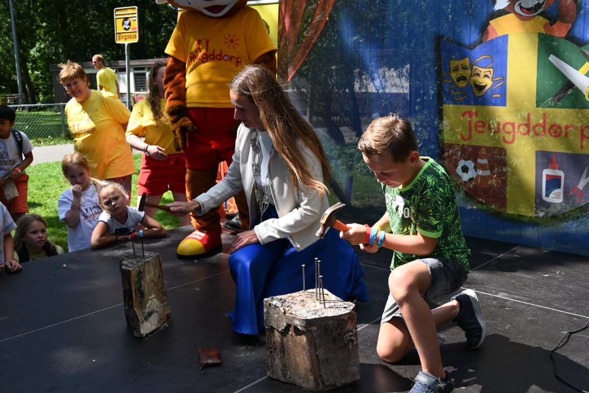 Dagelijks komen er tussen de 220 en 250 kinderen naar Jeugddorp Leiden. Woensdag kwam ook locoburgemeester Fleur Spijker langs om een kijkje te nemen en Jeugddorp officieel te openen. De wethouder genoot van alle spelende en bouwende kinderen en vertelde dat ze vroeger, toen ze nog een klein meisje met vlechtjes was, ook graag hutten bouwde.