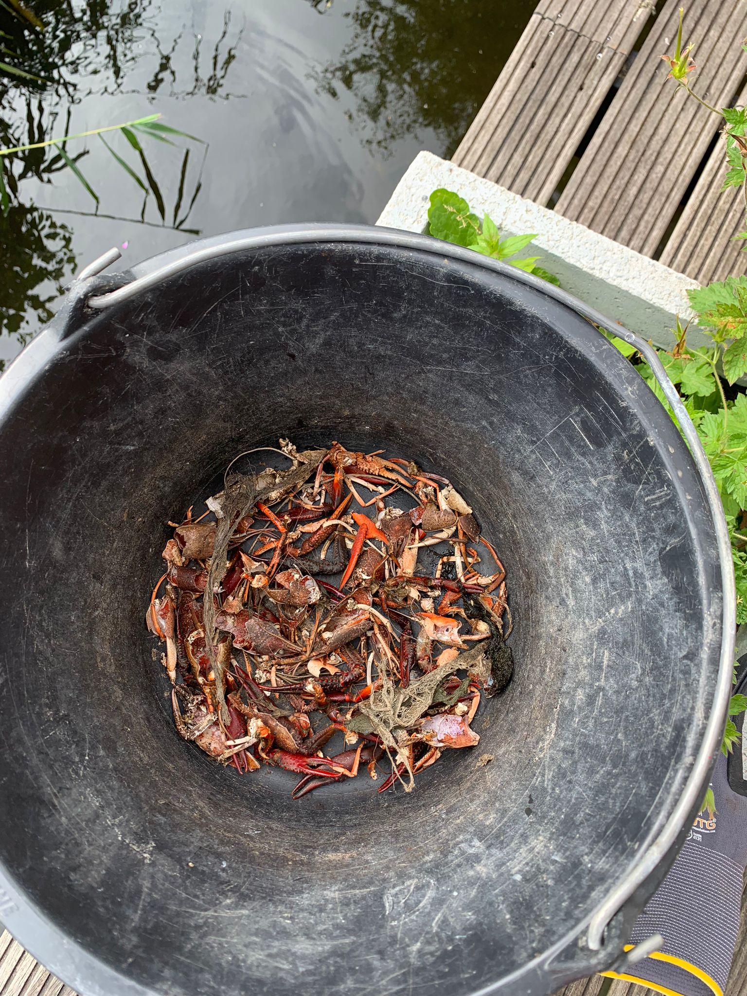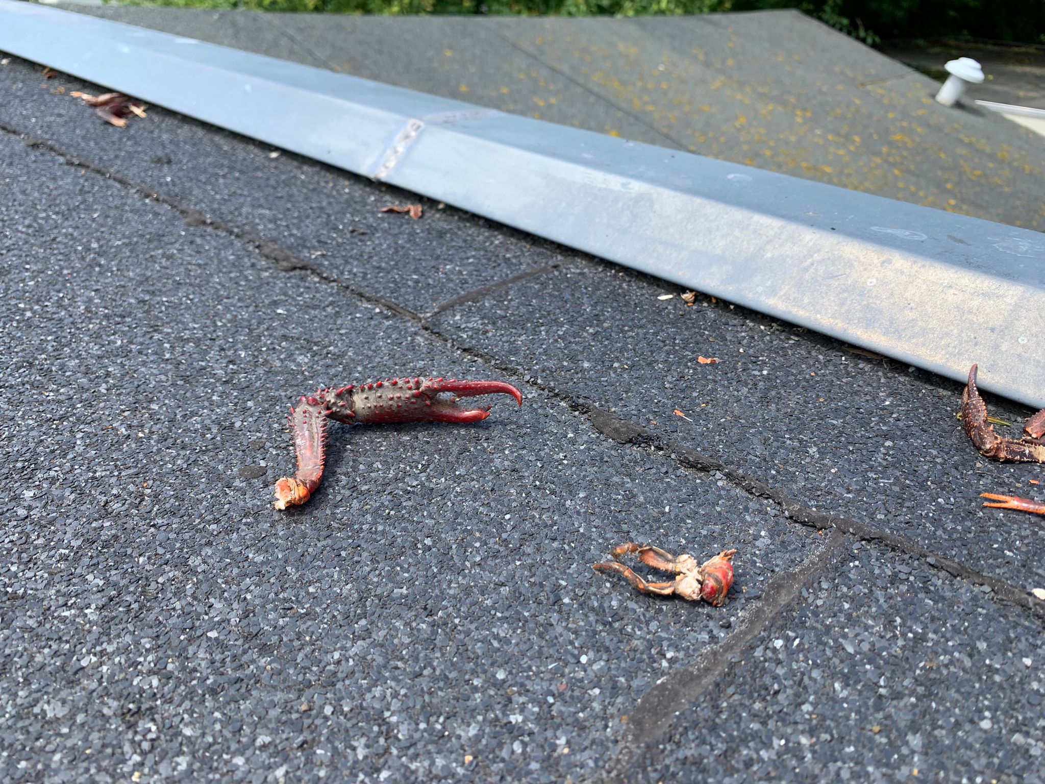 Dat het niet om een toevallige kreeft gaat die een meeuw op het dak heeft laten vallen, blijkt wel uit het feit dat Sloos dagelijks een emmer vol kreeftresten van zijn schuurdakje haalt. “Voor zover die niet zijn opgegeten door de eksters. Dat zijn blijkbaar aaseters, want ze zijn dol op de restjes.”