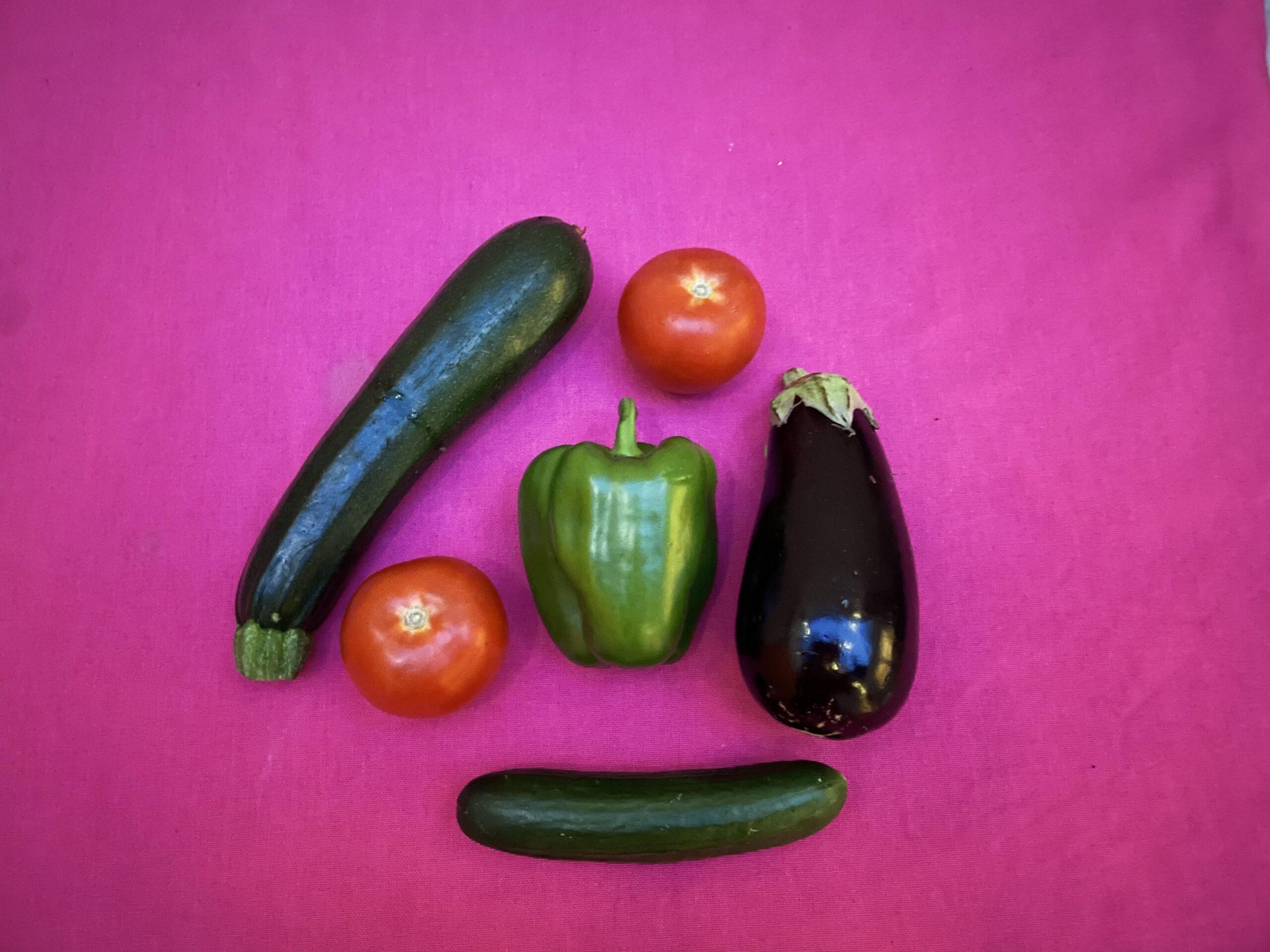 Was de groenten en snijd alles in kleine stukjes. Let erop dat je de hardere groenten eerst in de pan doet (courgette, aubergine, paprika). Als de courgette en aubergine zachter beginnen te worden doe je de komkommer en tomaten in de pan.