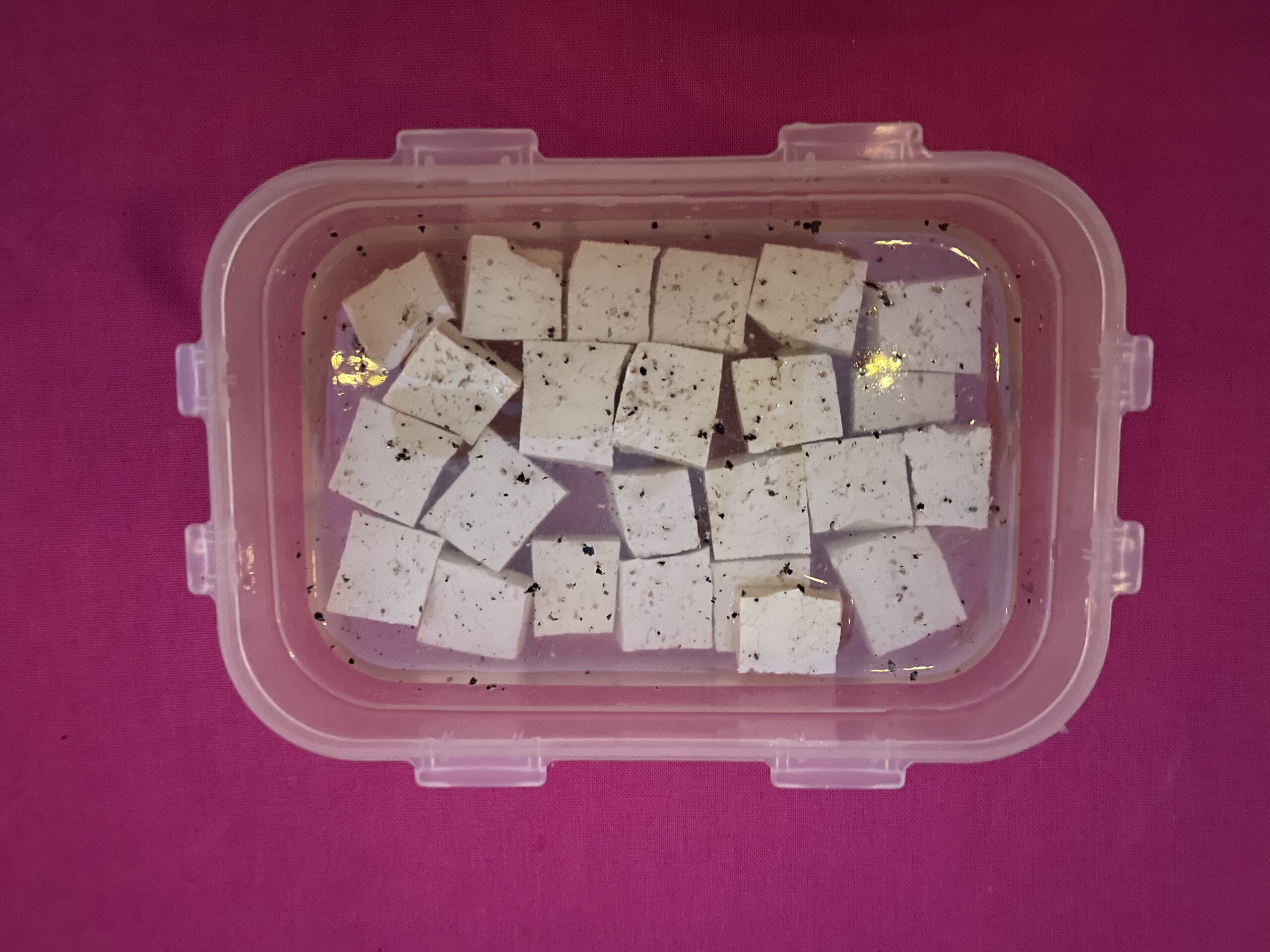 Snijd de tofu in blokjes en laat ongeveer 15 minuten weken in een bakje met water. Voeg zout en peper toe om de tofu op smaak te brengen. Bak de tofu vervolgens in een laagje olie. Als je van pittig houdt, voeg dan twee lepels chili-olie toe en bak de tofu tot dat deze goudbruin is. Vervolgens voeg je de ui en knoflook toe en laat je het geheel sudderen.