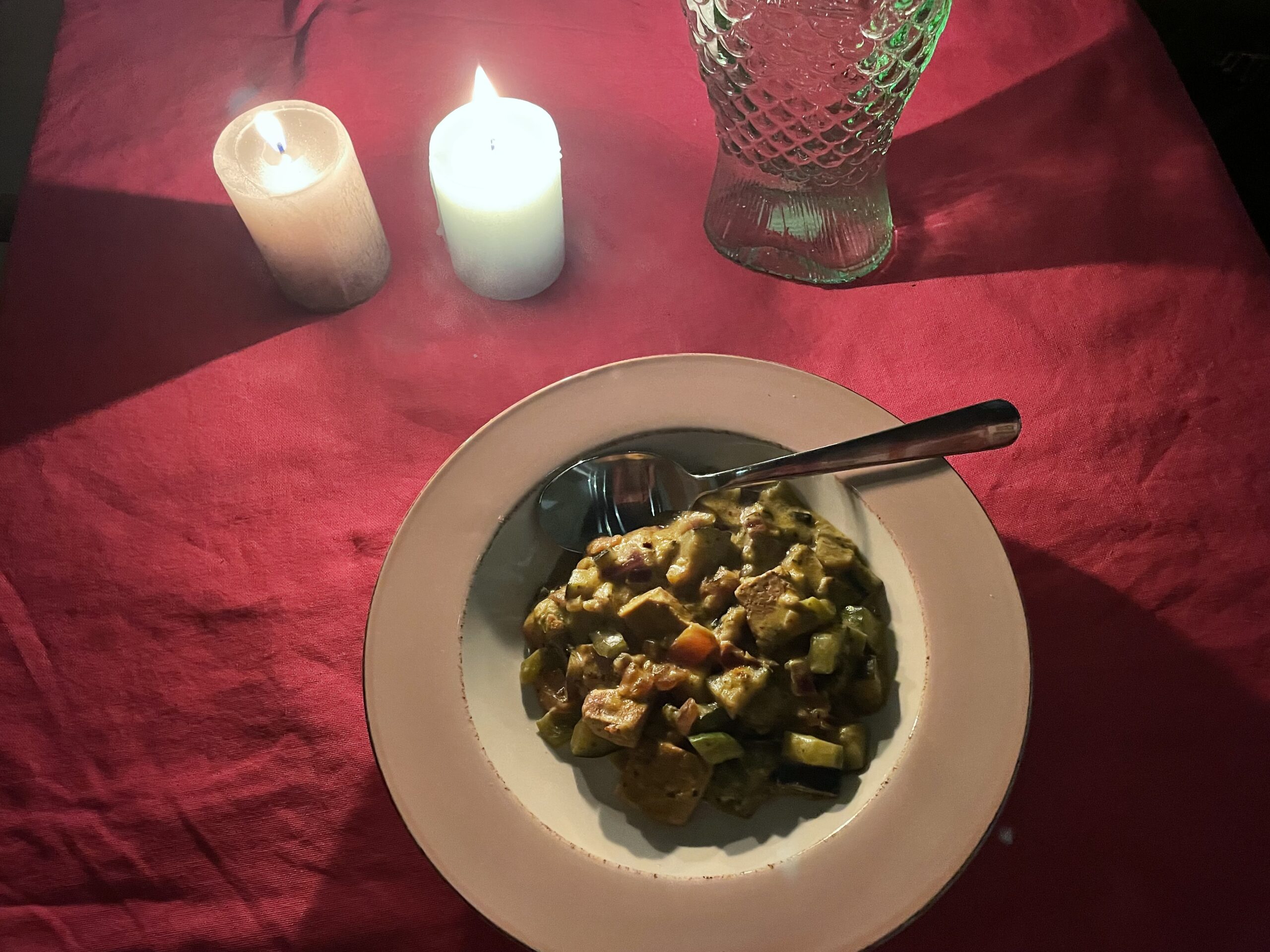 Curry is vaak lekker in combinatie met rijst of brood. Dit keer heb ik alleen de curry gegeten omdat het van zichzelf al best machtig is.