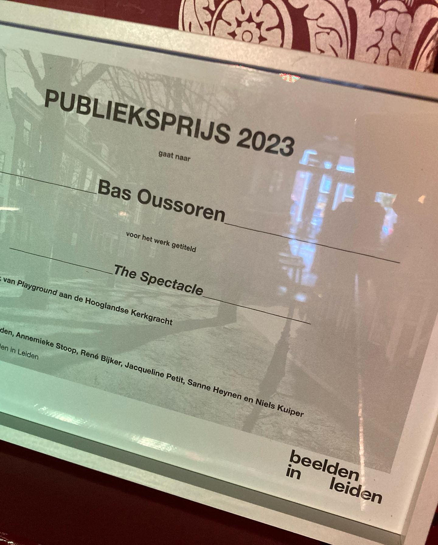 Het kunstwerk The Spectacle van Bas Oussoren heeft de publieksprijs gewonnen van Beelden in Leiden. De openlucht beeldententoonstelling ‘Playground’ aan de Hooglandse Kerkgracht beleefde zondag de laatste dag.