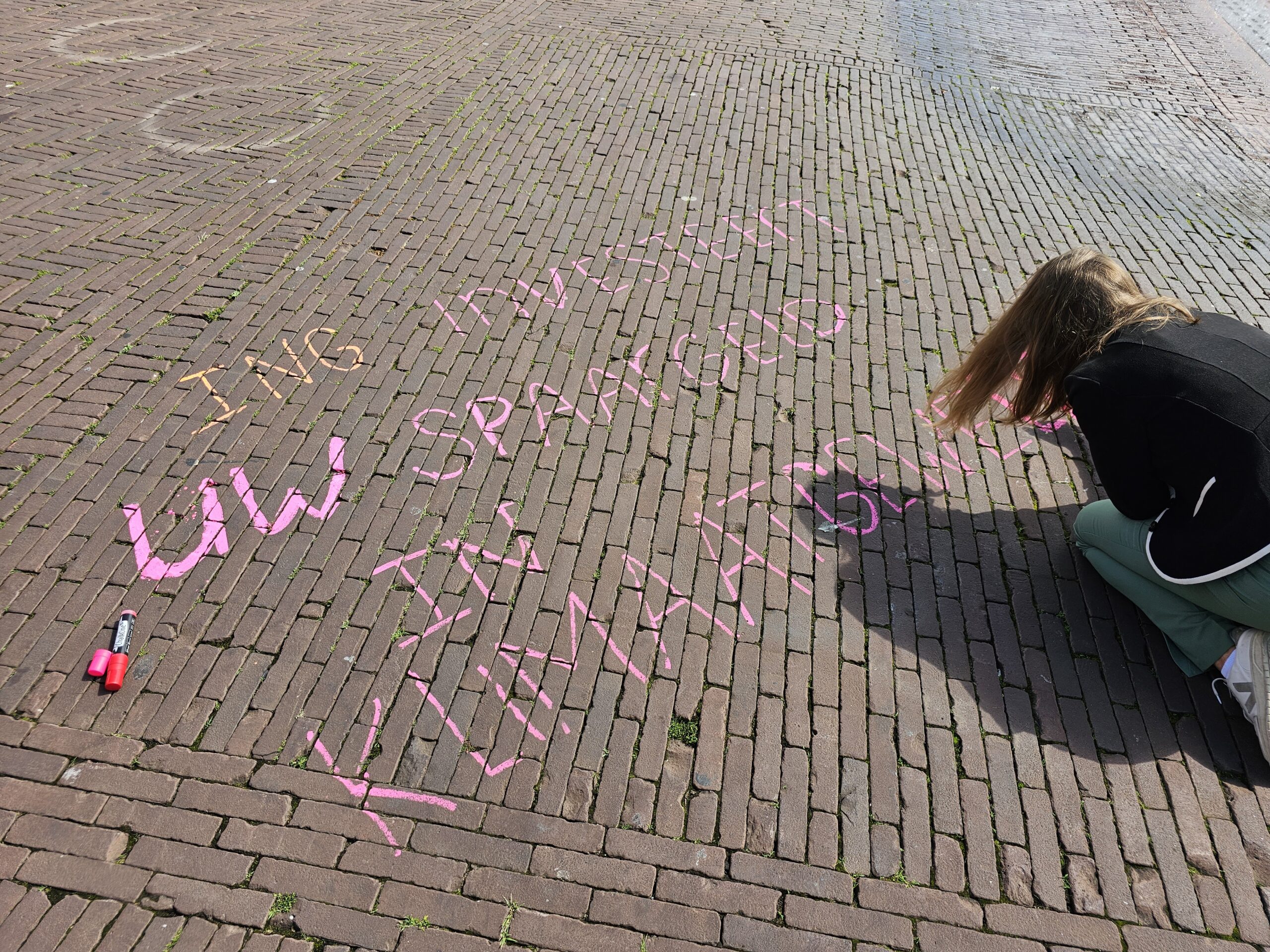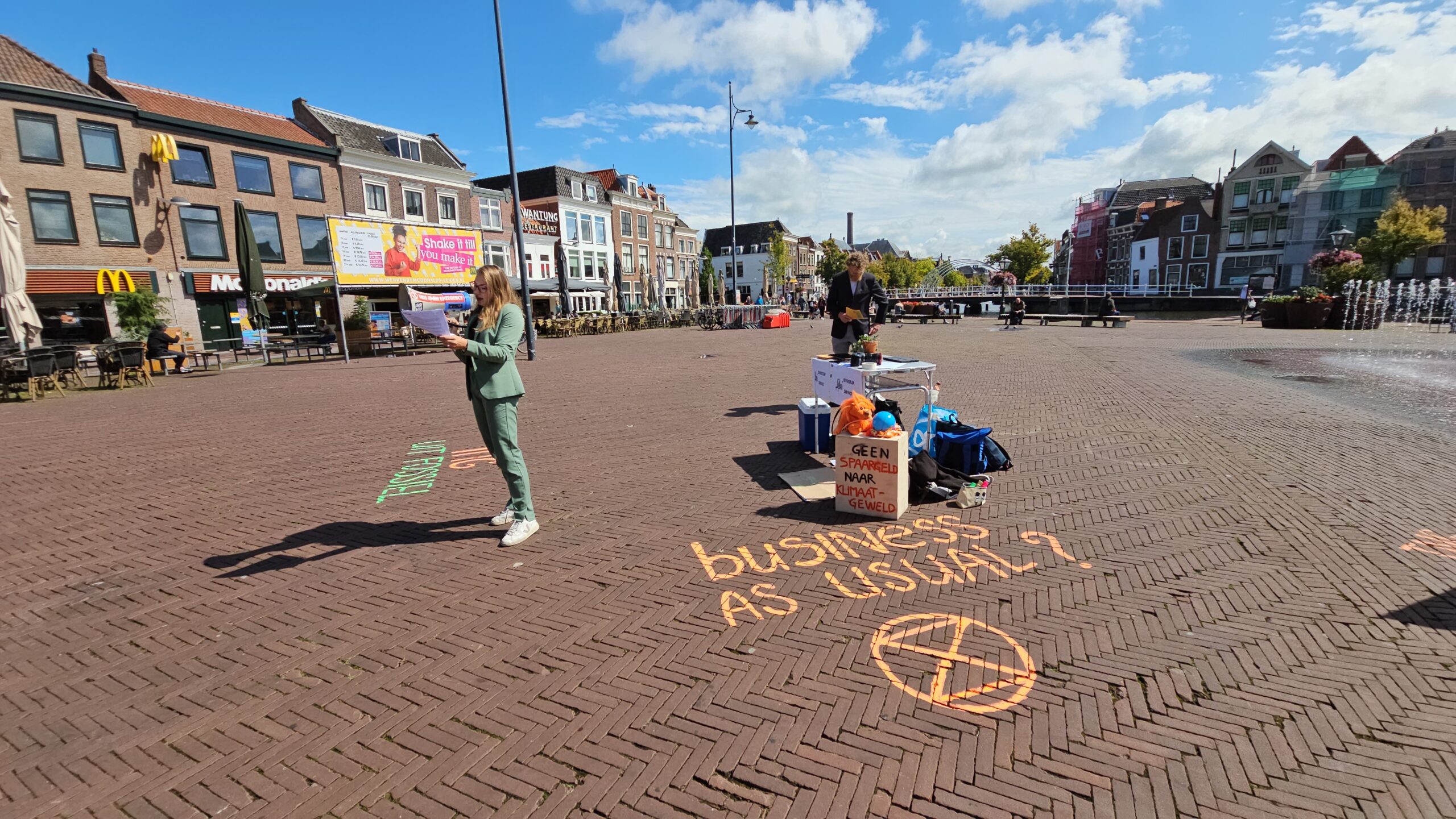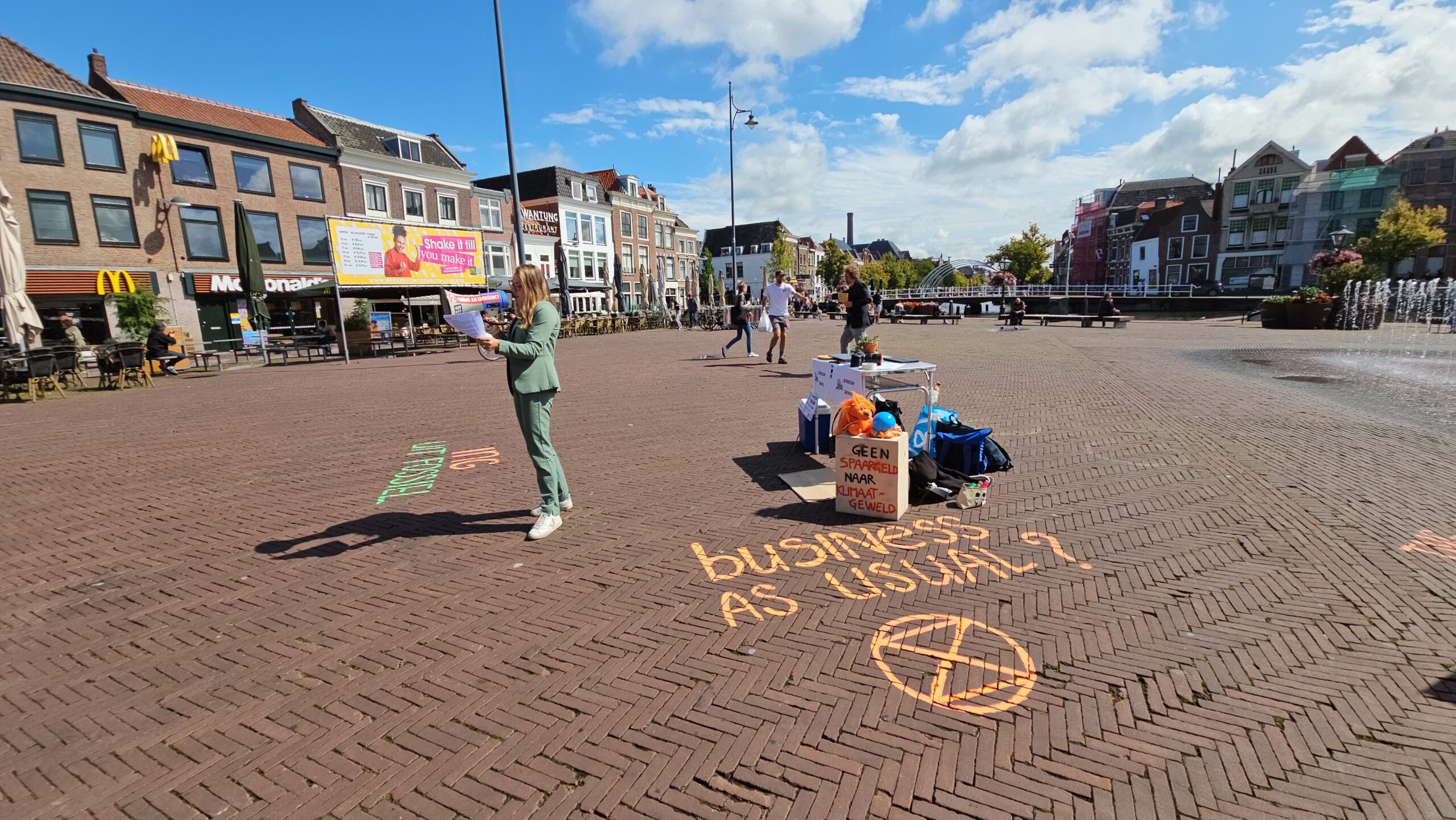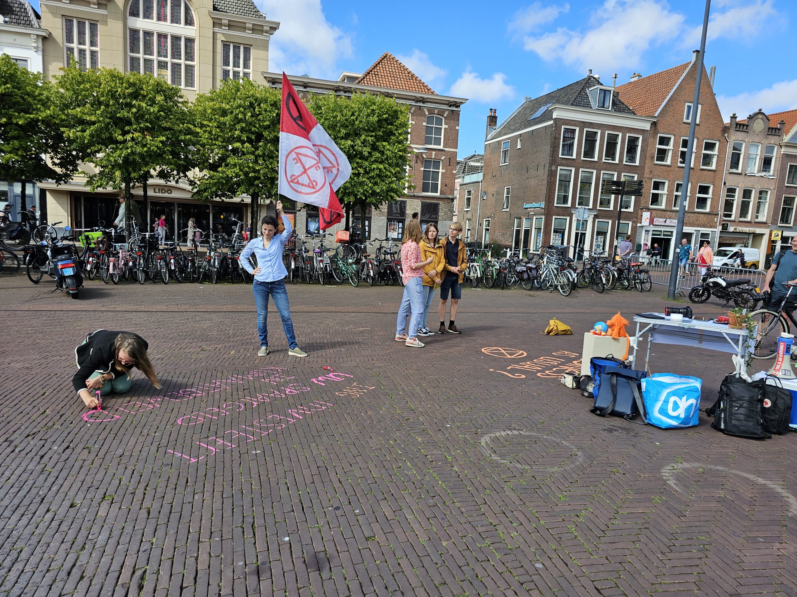 Met flyers, stoepkrijt en een megafoon werd de boodschap overgebracht op de voorbijgangers die ook werden opgeroepen om op zaterdag 9 september naar Den Haag te komen. Daar wordt dan opnieuw actie gevoerd door het blokkeren van de Utrechtse Baan (A12). Die actie wordt volgens Extinction Rebellion niet alleen de grootste tot nu toe, maar ook de langste. “Dit keer blijven we namelijk net zolang zitten tot de regering het beleid aanpast. Iedere dag weer.”