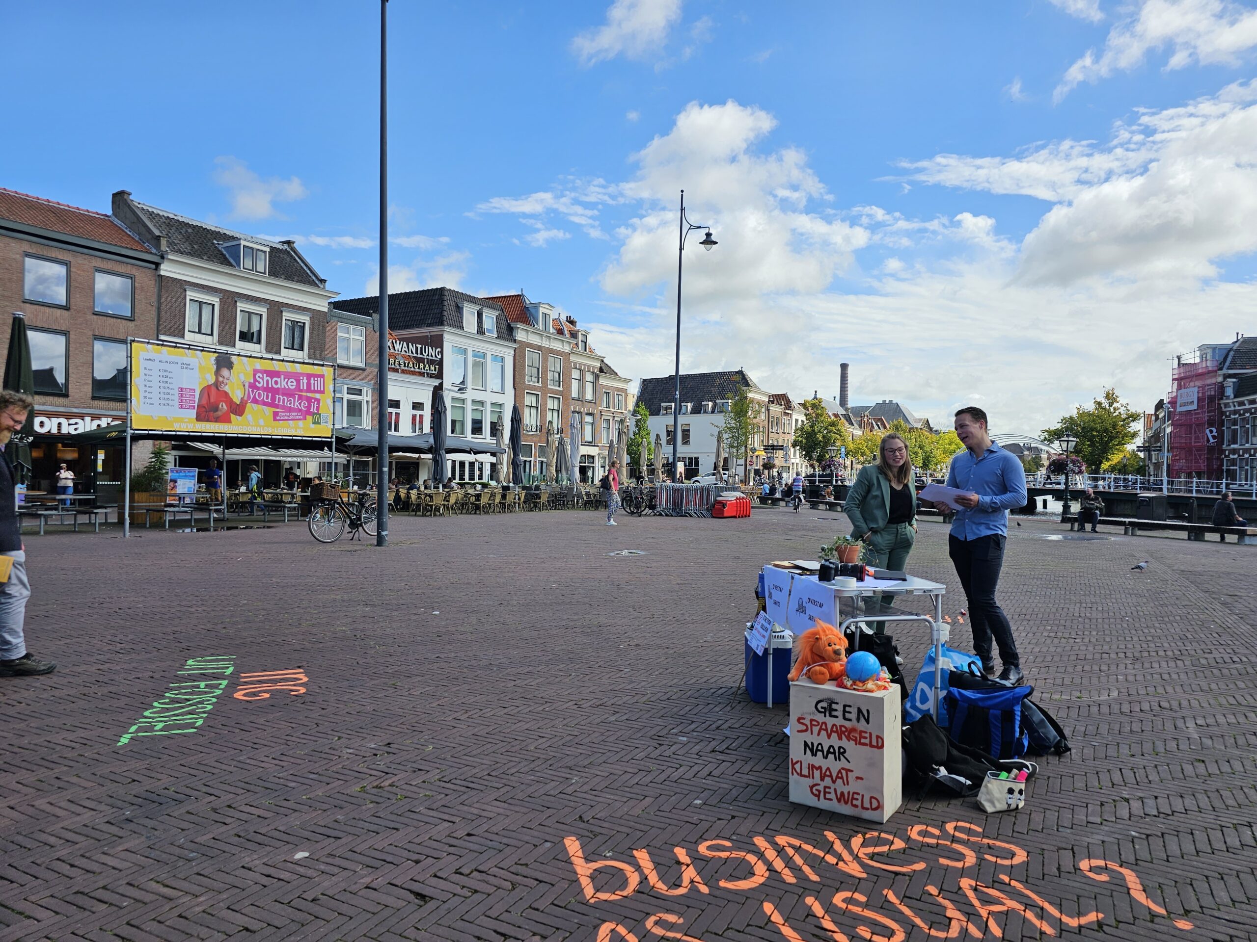 Leden van Extinction Rebellion Leiden hebben zaterdag aan het eind van de ochtend actie gevoerd tegen het beleid van de ING bank. De actie begon precies om 11.55 uur. “Want het is vijf voor twaalf voor het klimaat”, aldus de actievoerders.
