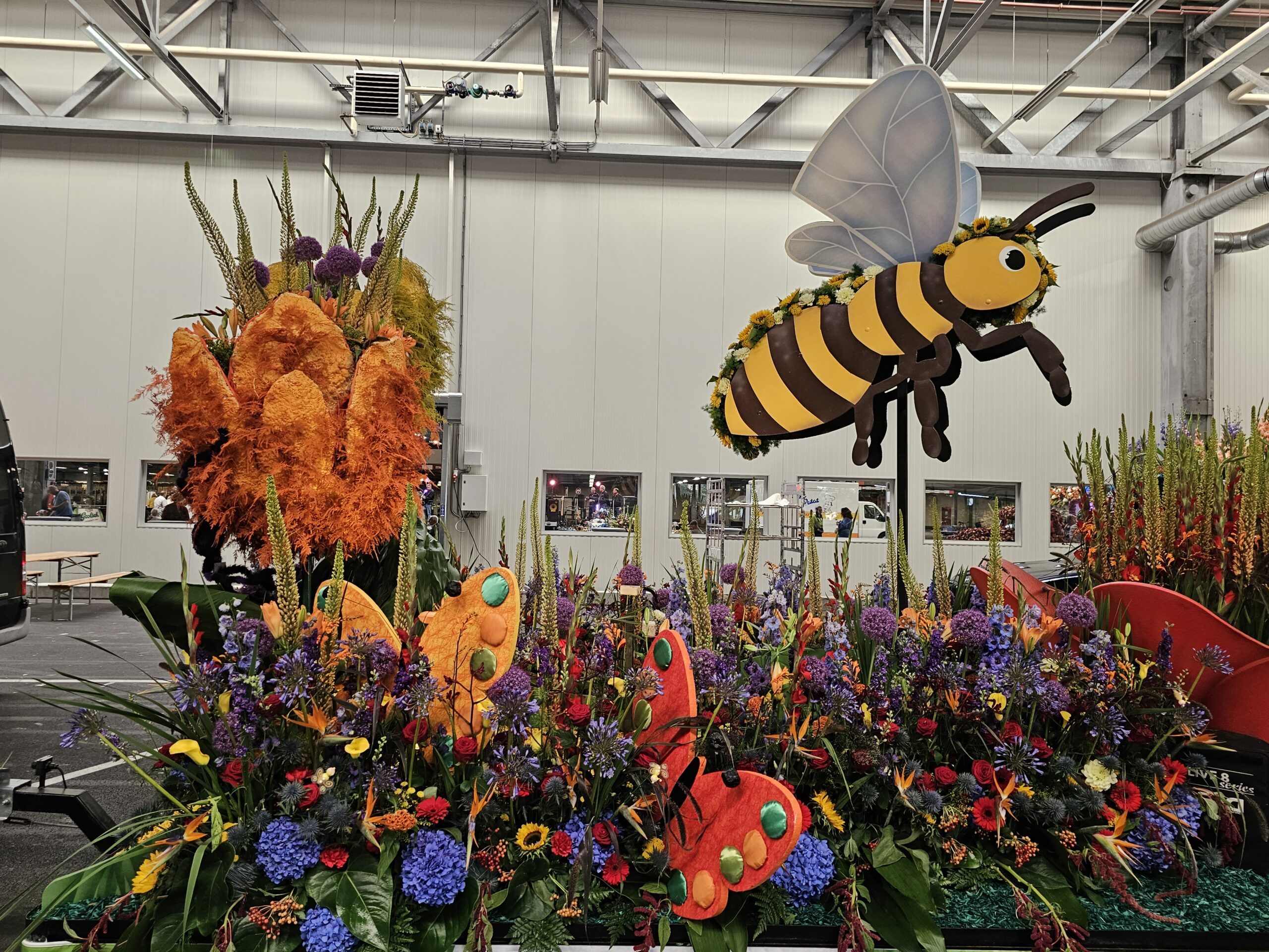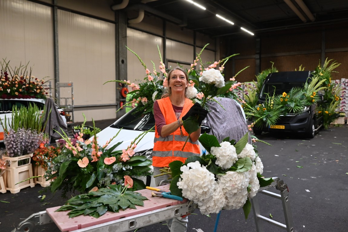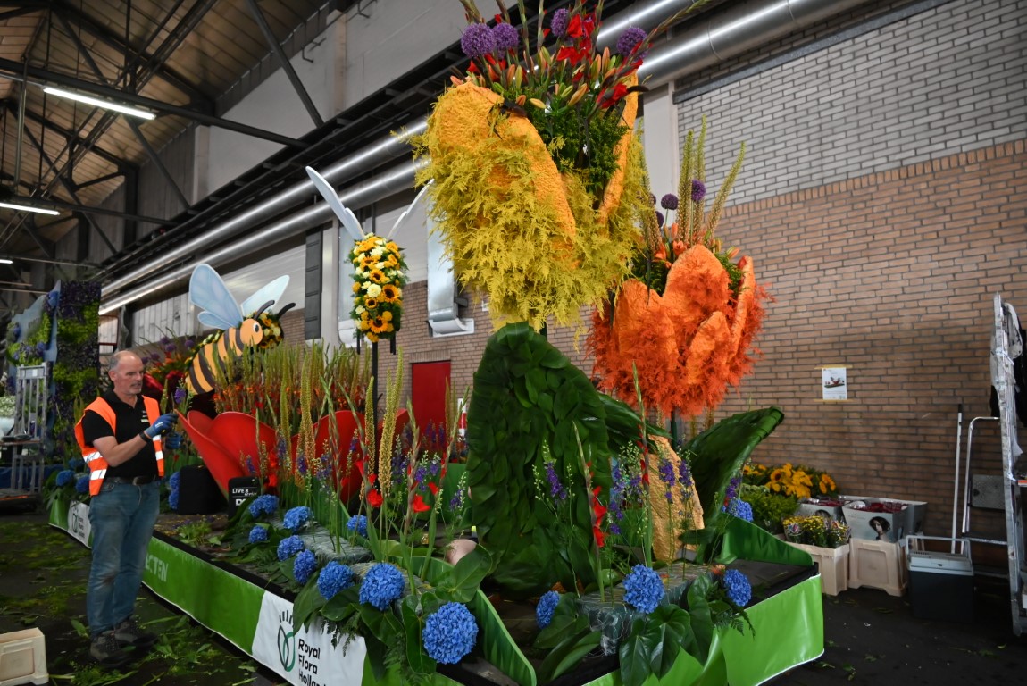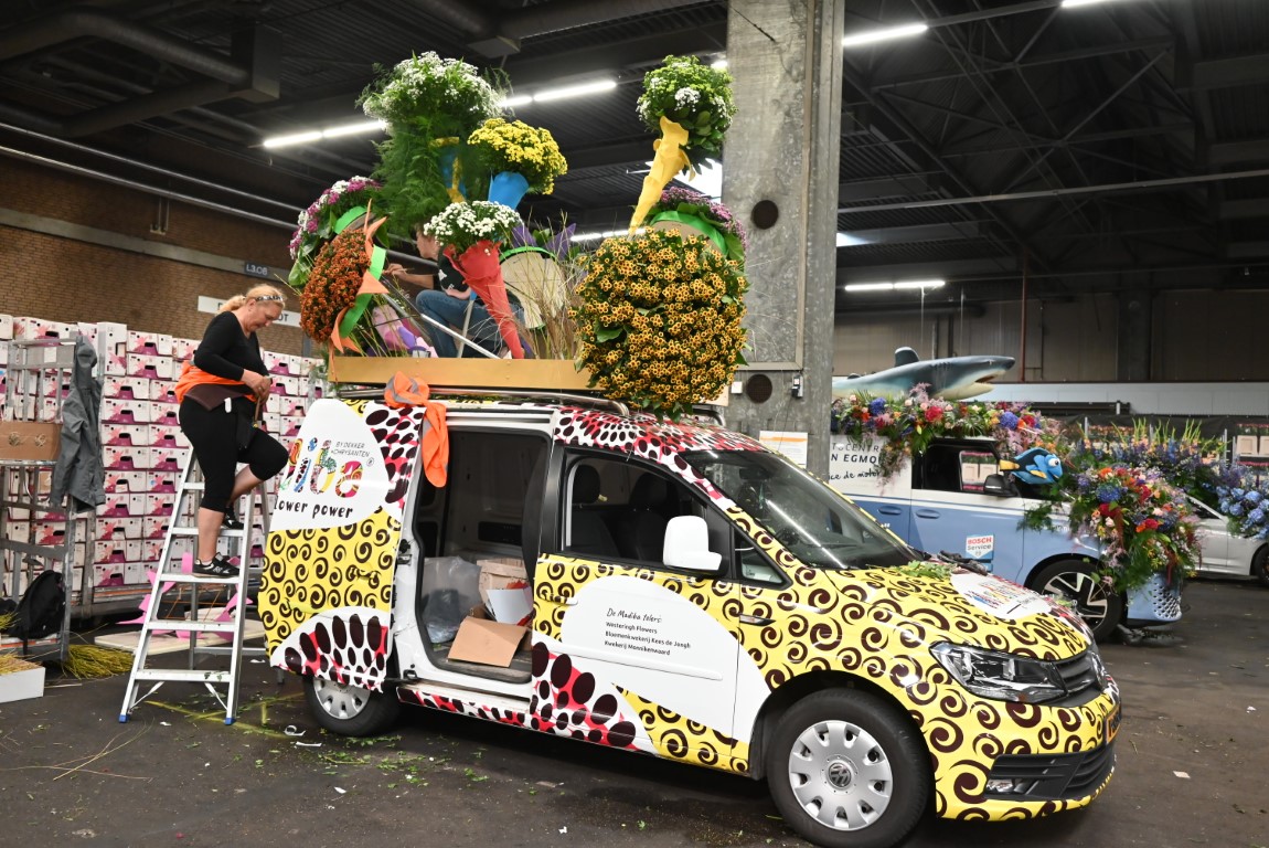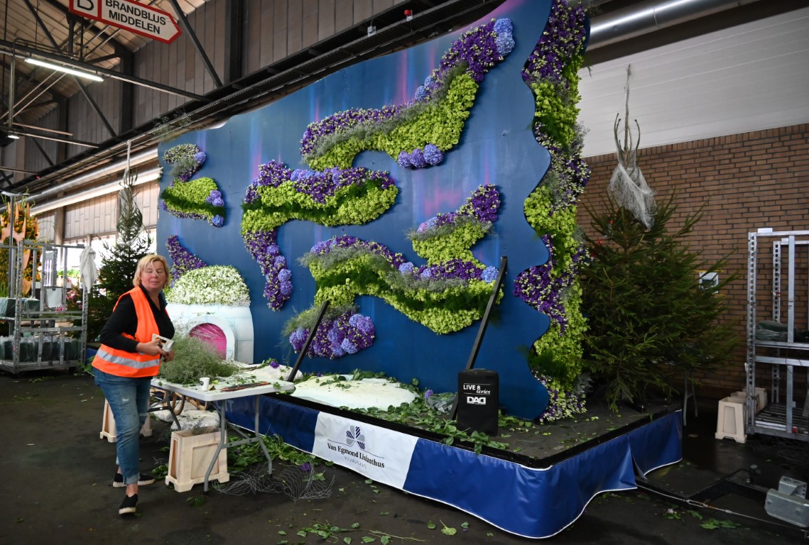 Hieronder het opsteken van bloemen op de praalwagens. (Foto’s: Emile van Aelst)