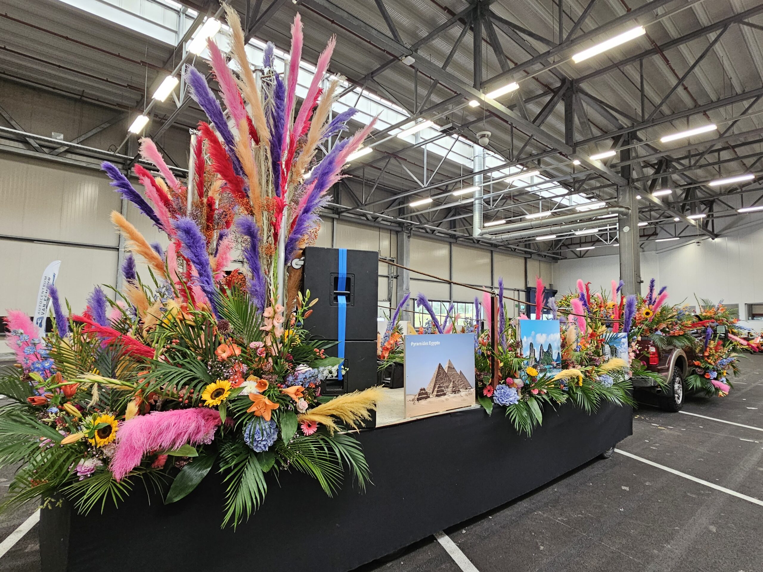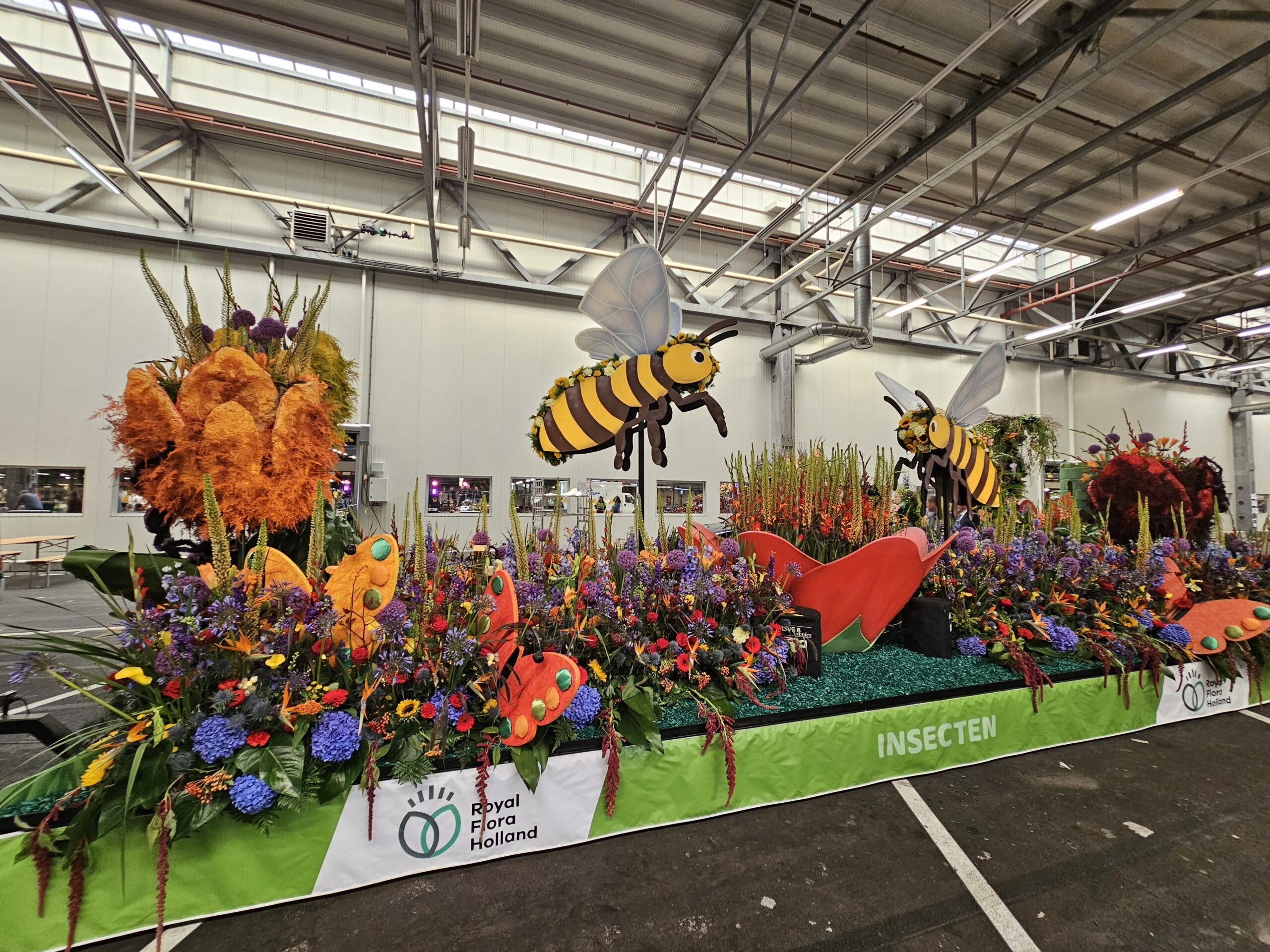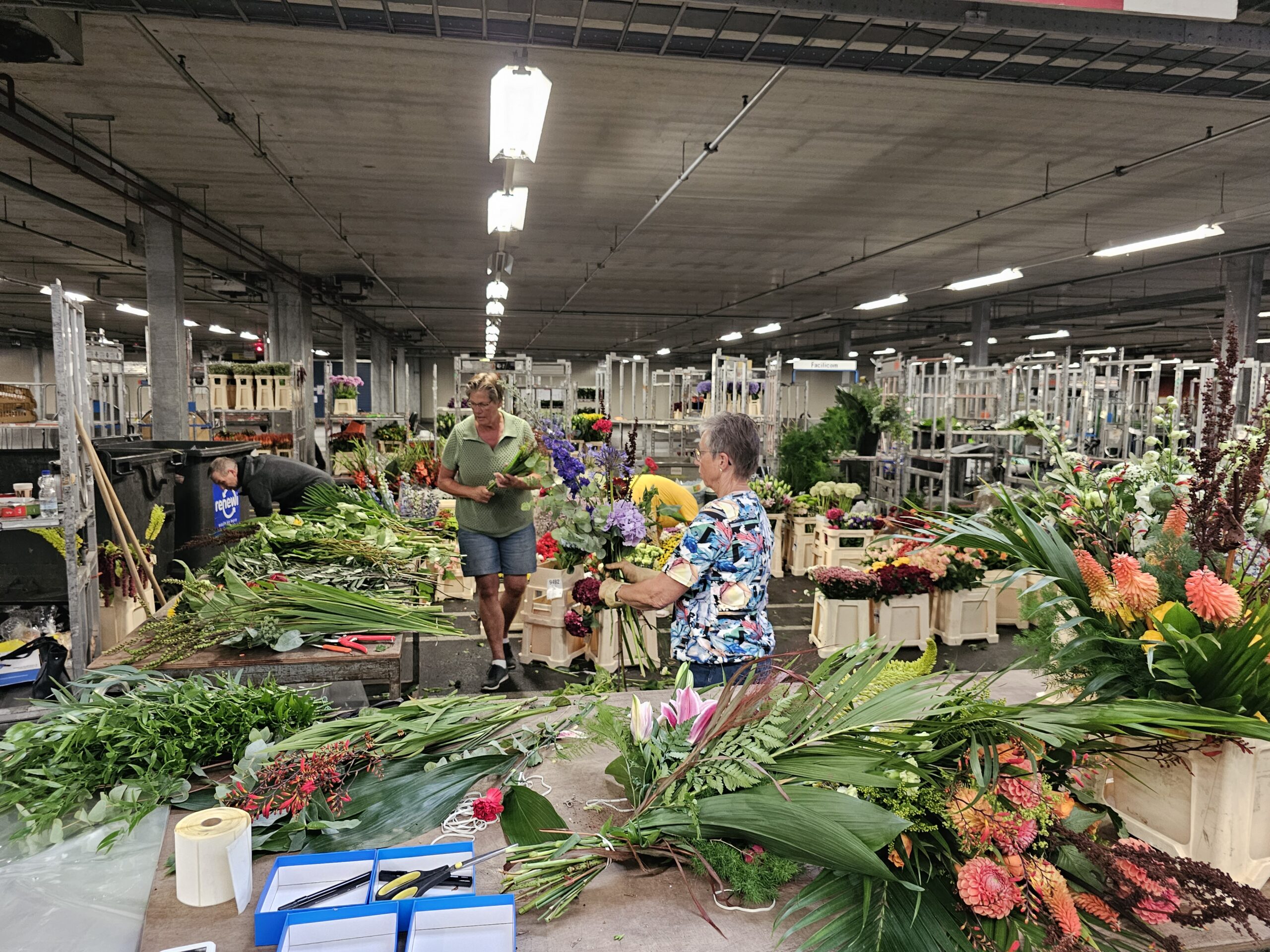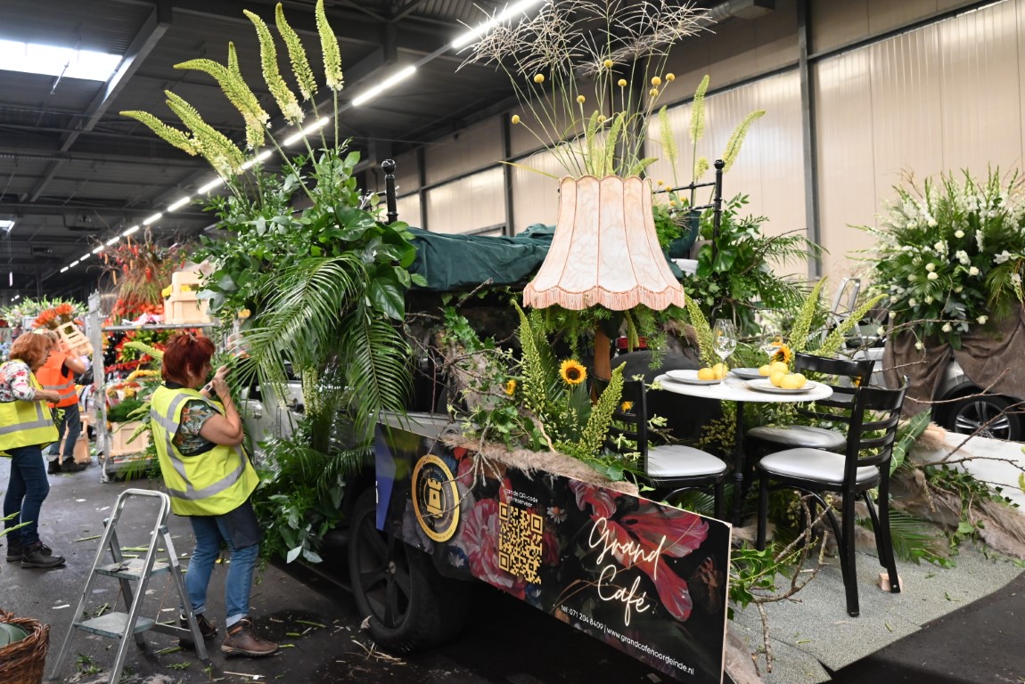 Hieronder het opsteken van bloemen op de praalwagens. (Foto’s: Emile van Aelst)