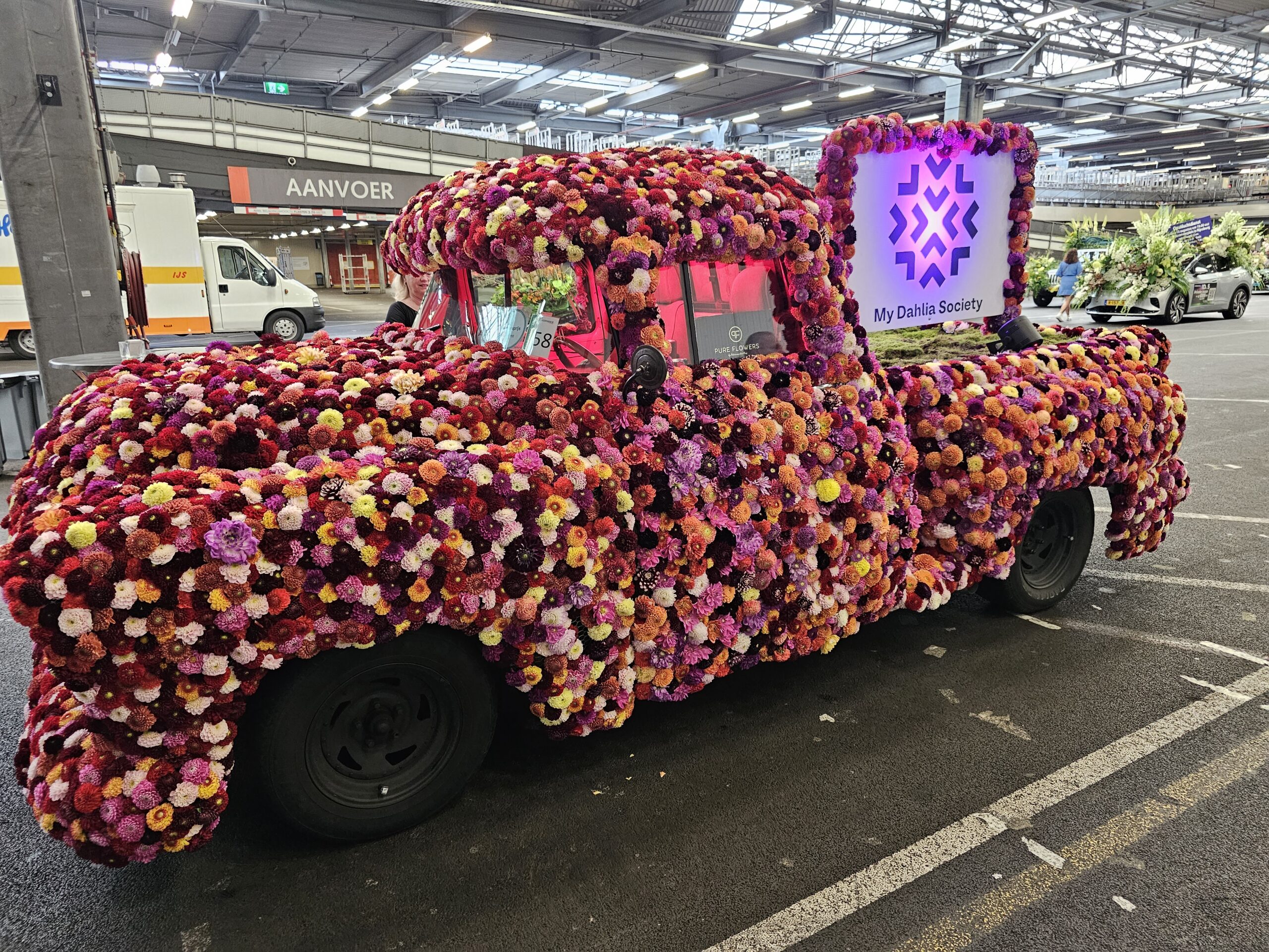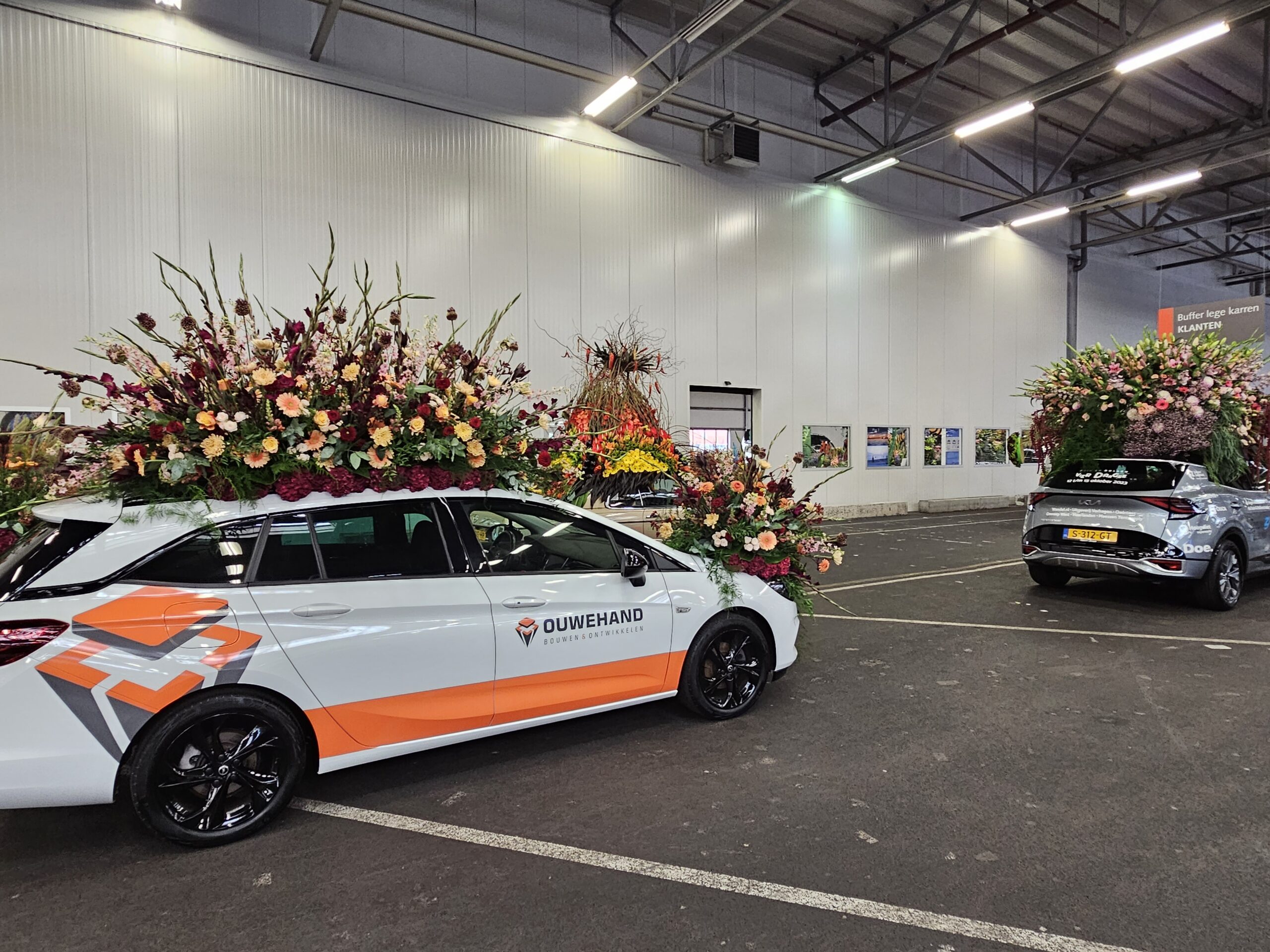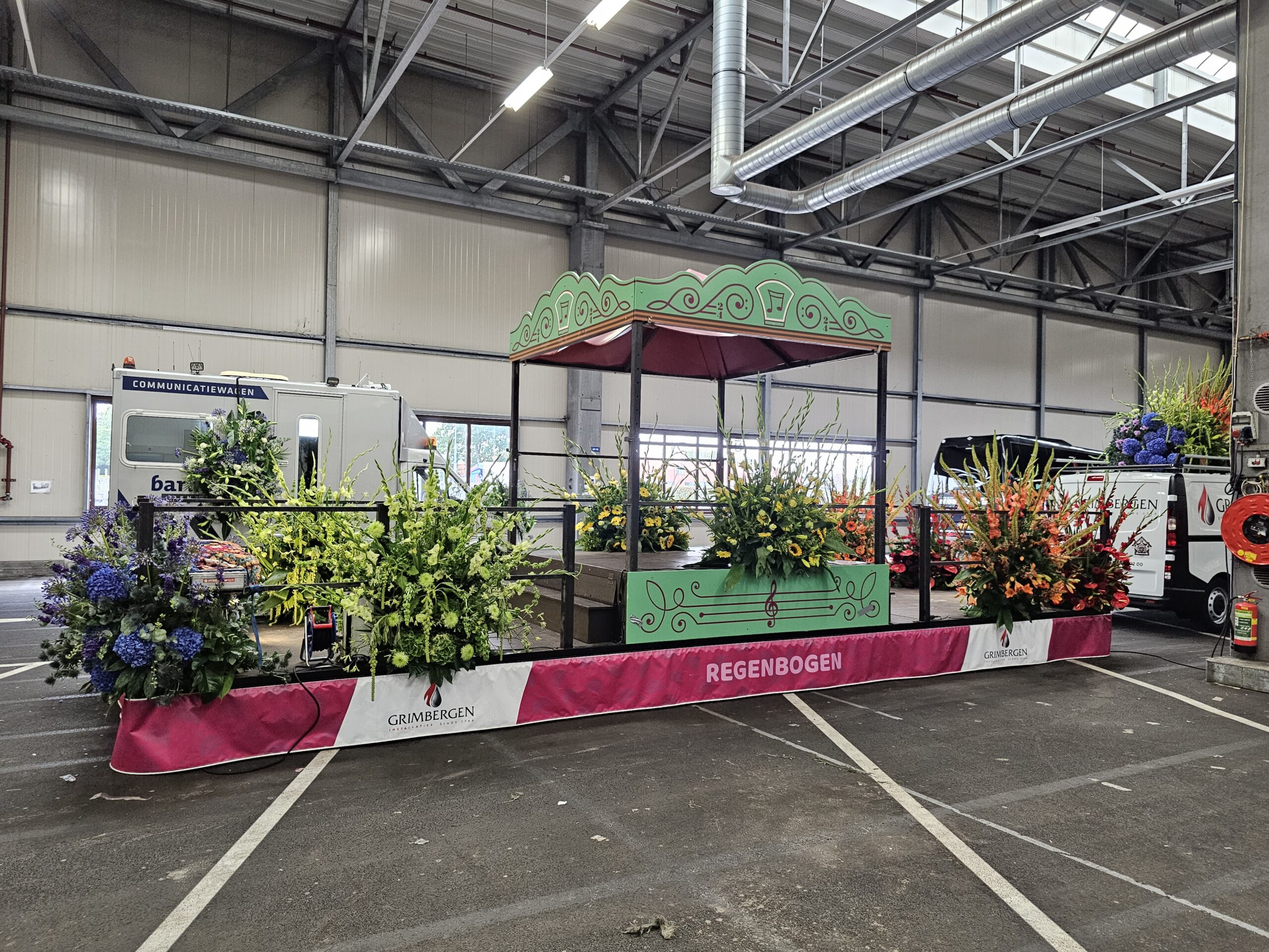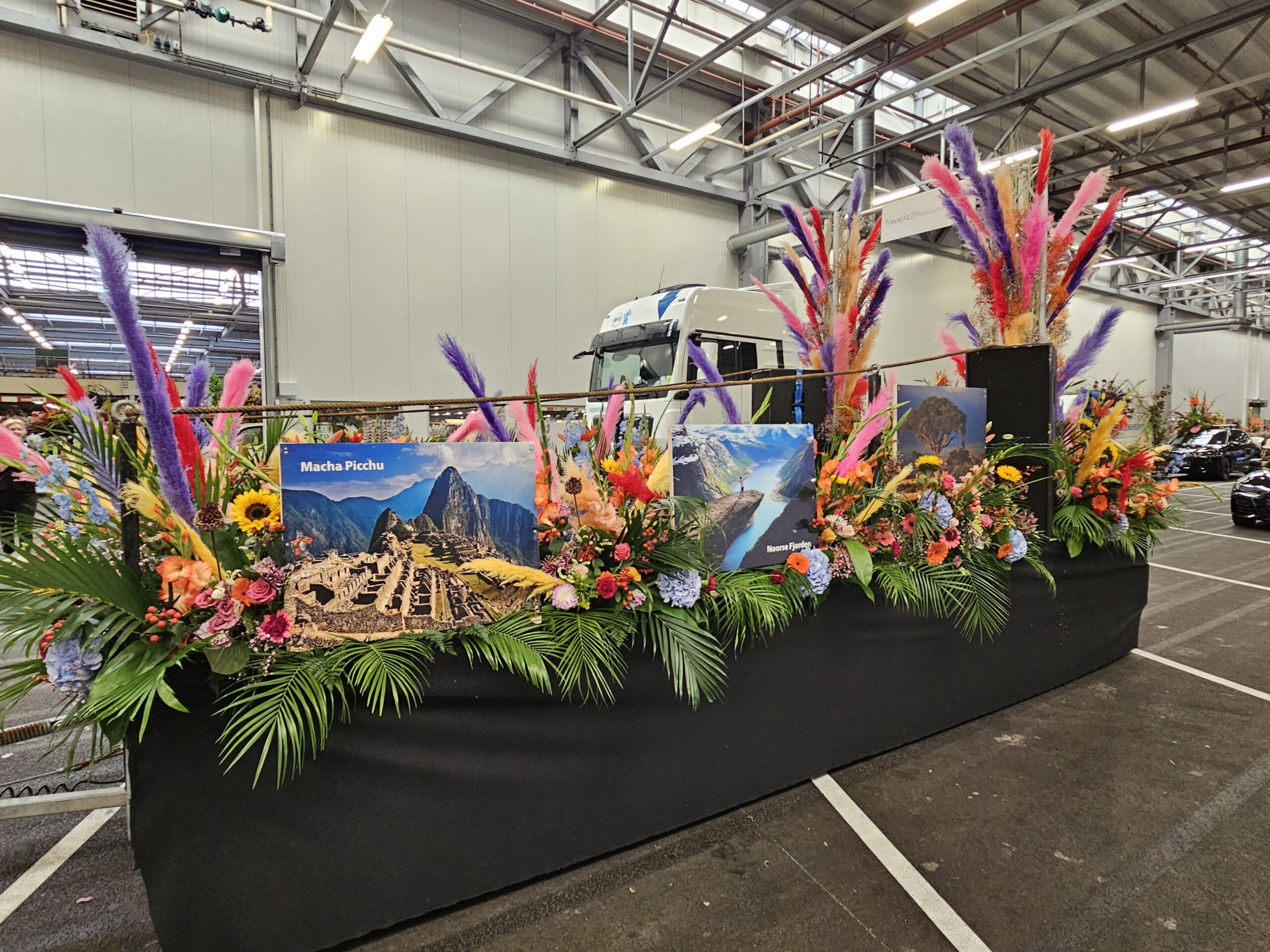 Hieronder het opsteken van bloemen op de praalwagens. (Foto’s: Emile van Aelst)