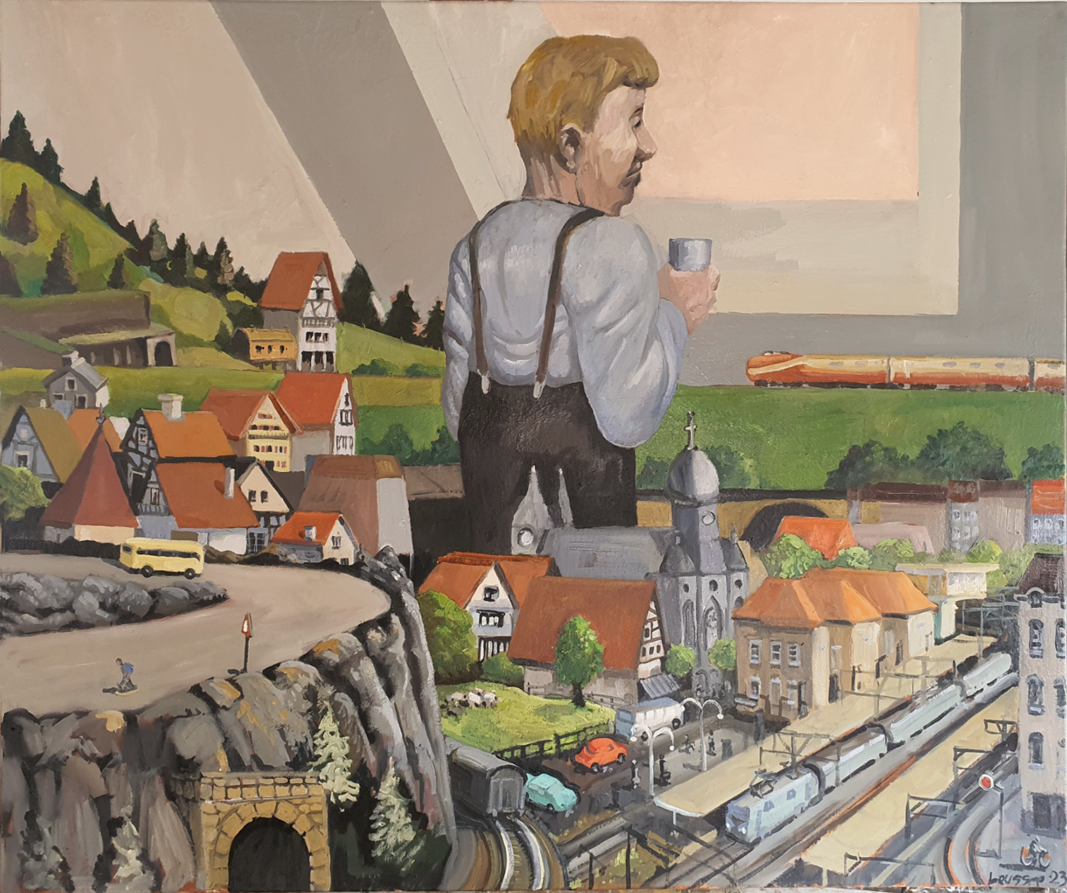 “Mijn keuze voor dat ‘lullige’ karton, is een bewuste. Ik vind dat de essentie van een schilderij is, dat je van iets wat eigenlijk geen waarde heeft, iets heel waardevols maakt.” Op de tentoonstelling zijn niet alleen kleine werken te zien van Brussee, maar ook grote. “Er hangt een groot schilderij van een flat. Je ziet wat zich in de kamertjes afspeelt. In de ene kamer zie je een heel druk gezin met kinderen op een glijbaan en een grote hond. In een andere kamer is een koppel bezig om een maagdelijke ruimte met rollers wit te verven.”