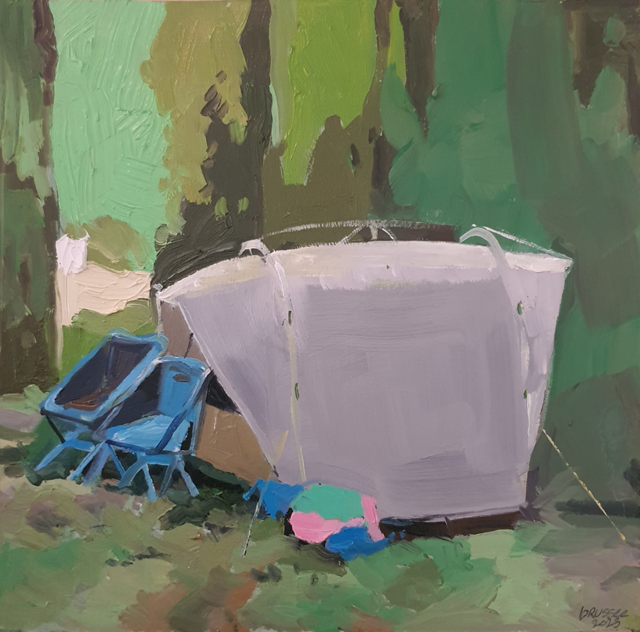 “Het standaardformaat waarop ik schilder, is 19×24 cm. Het is de afmeting van een pak cornflakes met chocoladevlokken van de supermarkt. En dat is ook het materiaal waar ik op schilder. Elk pak heeft een voor- en achterkant. En die snijd ik er altijd uit. Het is licht en je kunt het efficiënt op de fiets meenemen”, aldus Brussee.