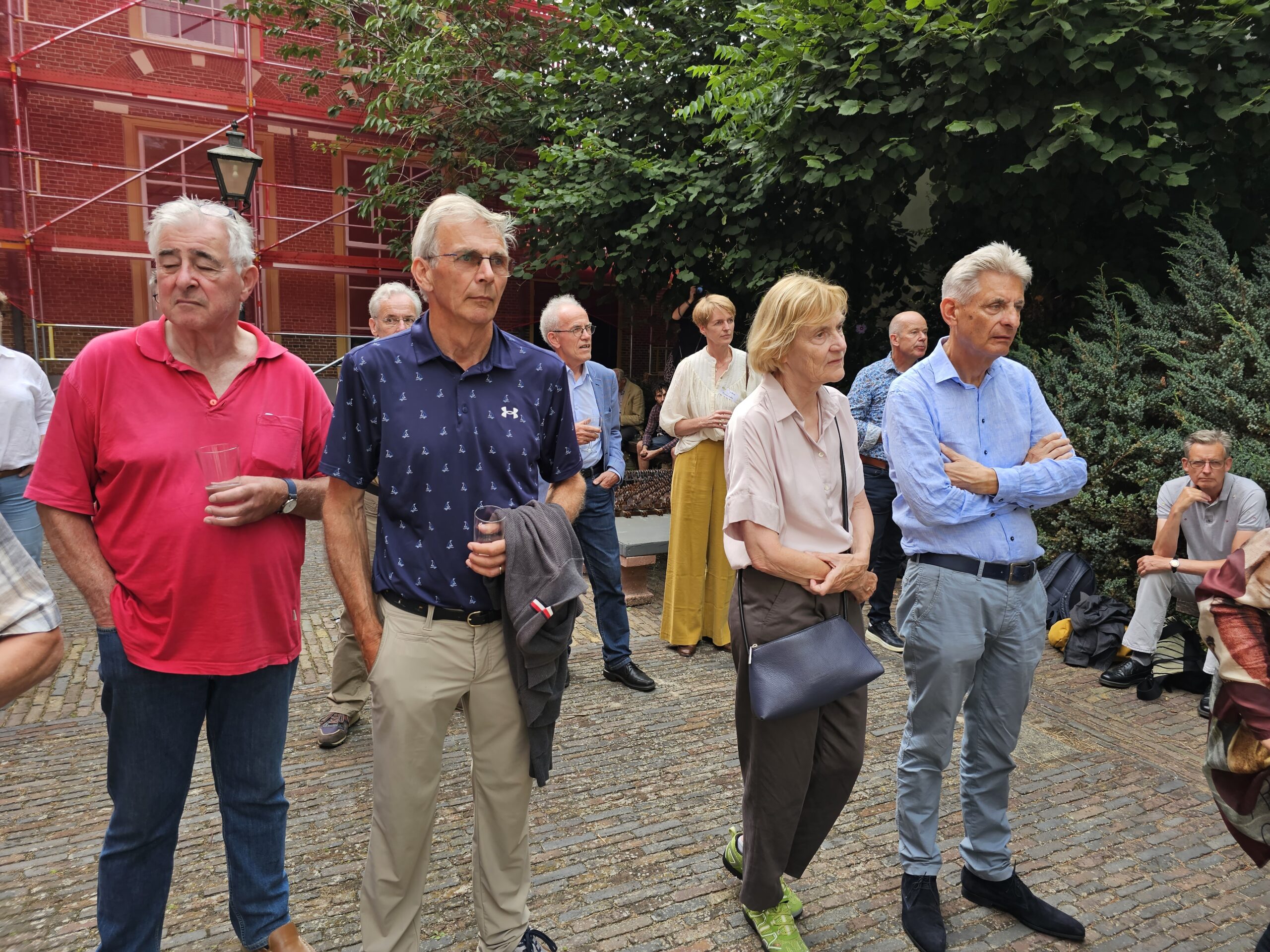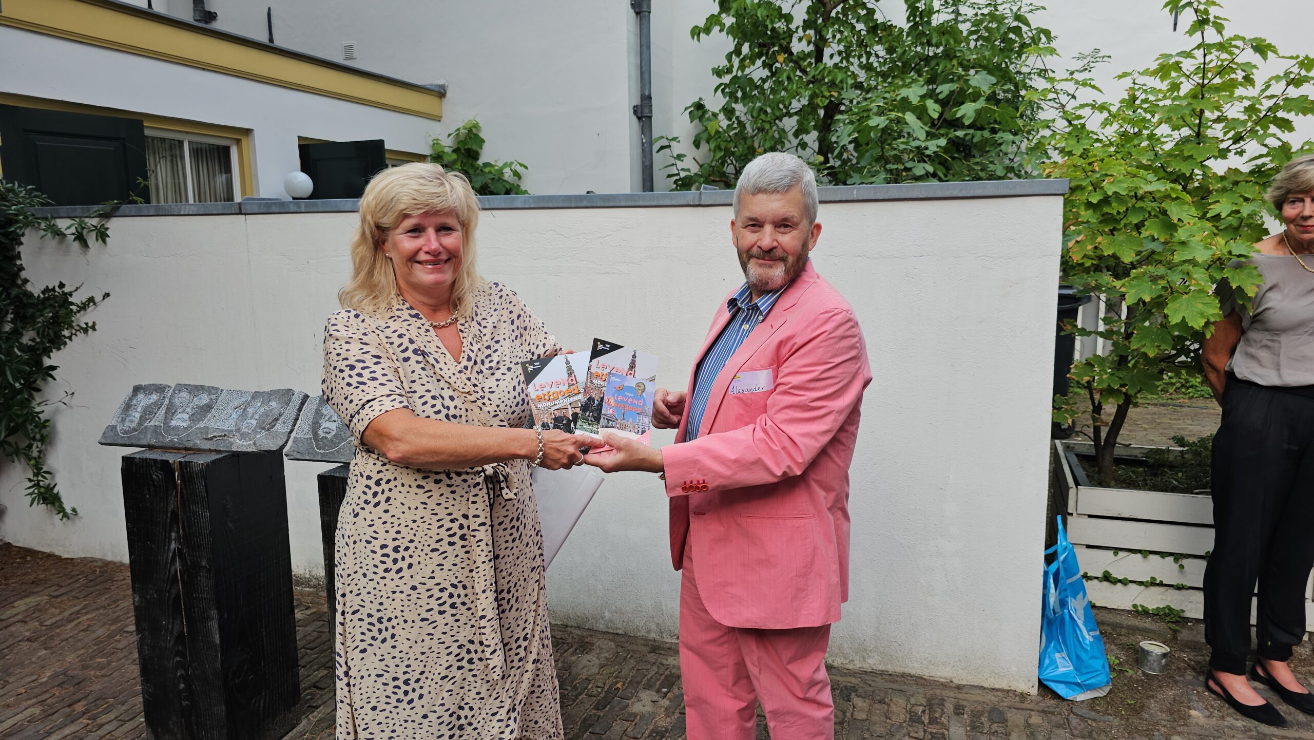 Wethouder Yvonne van Delft nam het programmaboekje in ontvangst uit handen van OMD Leiden voorzitter Alexander Geertsema.