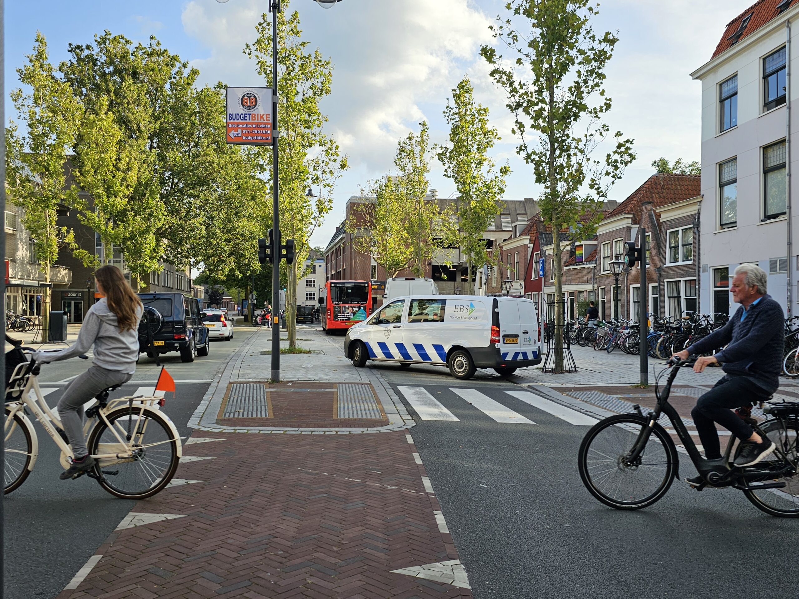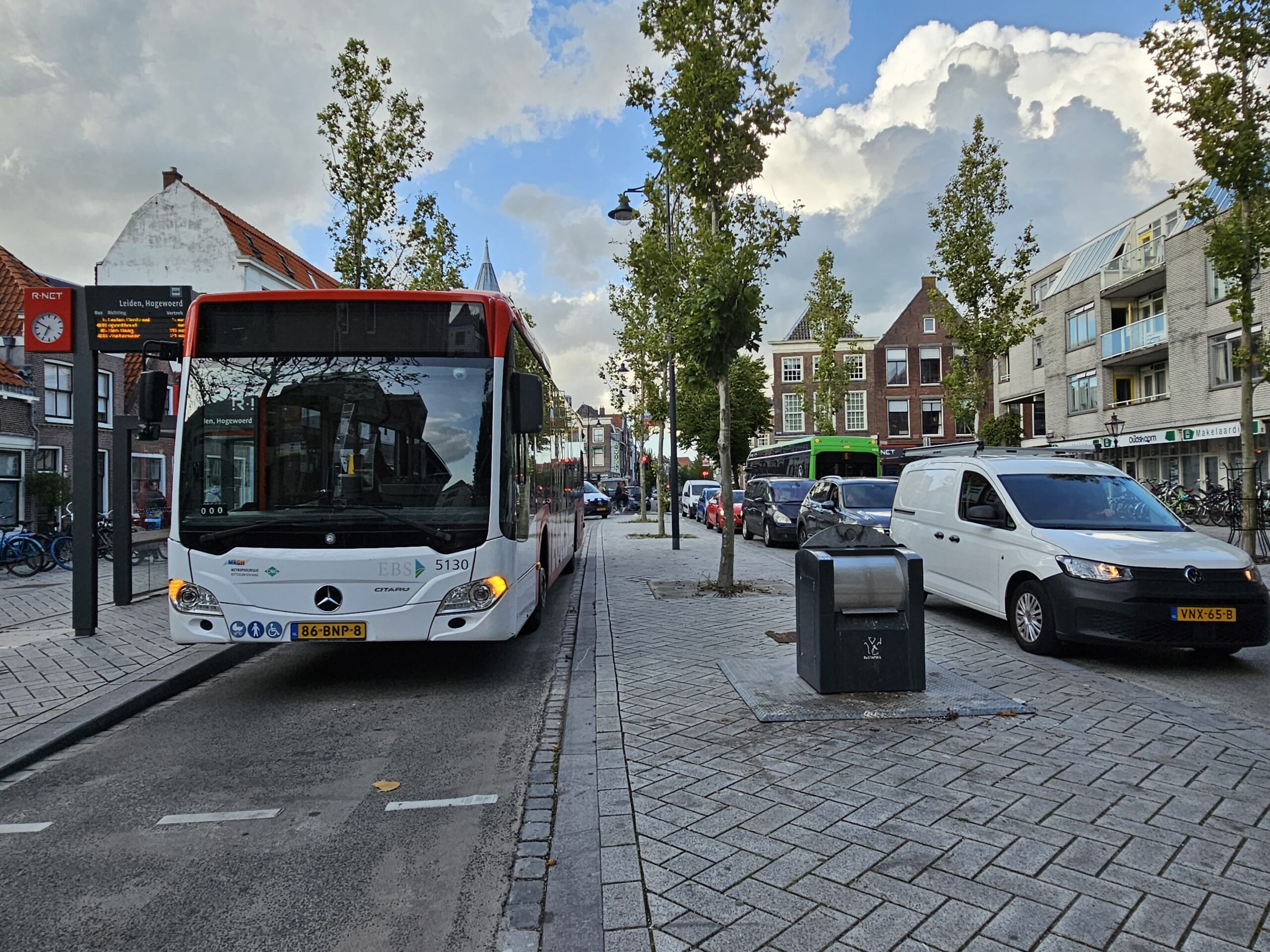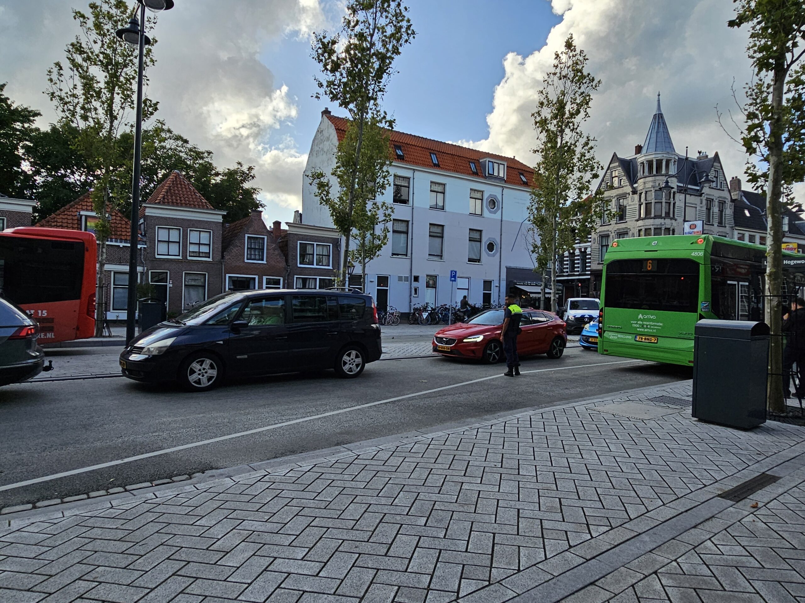 De oorzaak viel mee. Geen ongeluk, maar een defecte lijnbus die niet meer weg kwam bij de halte Hogewoerd. Omdat de rijbaan daar aan weerszijden is afgebakend met een verhoogd trottoir, kon het autoverkeer er niet zomaar langs.