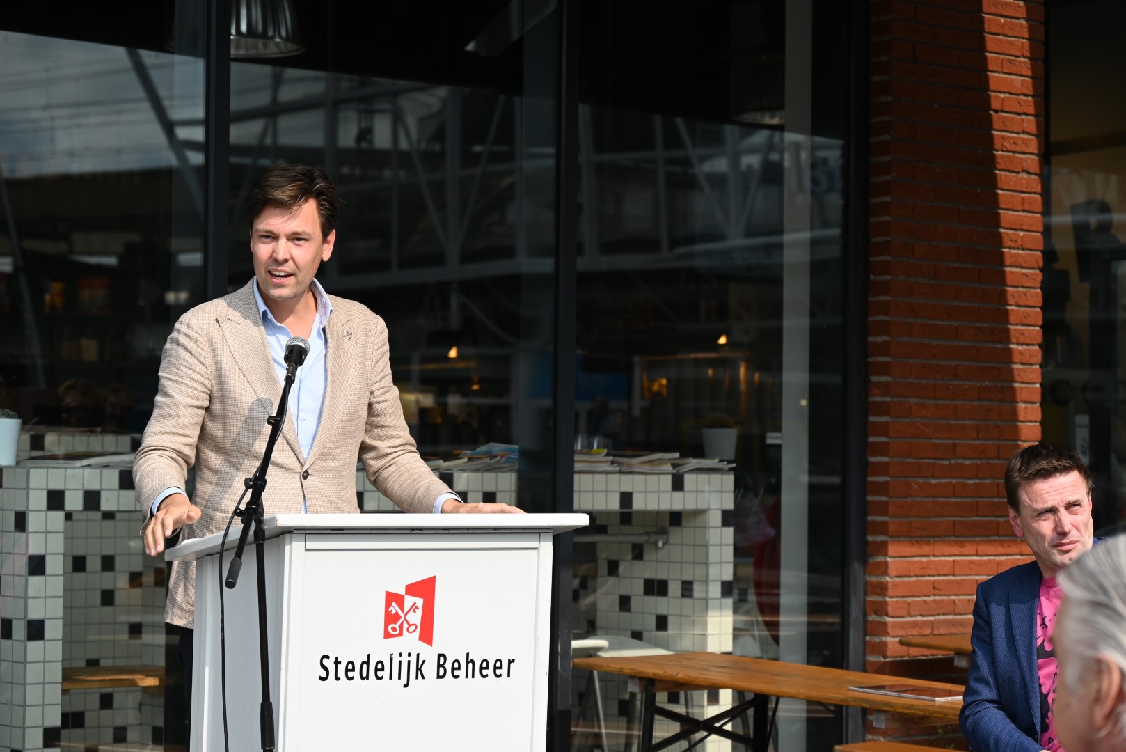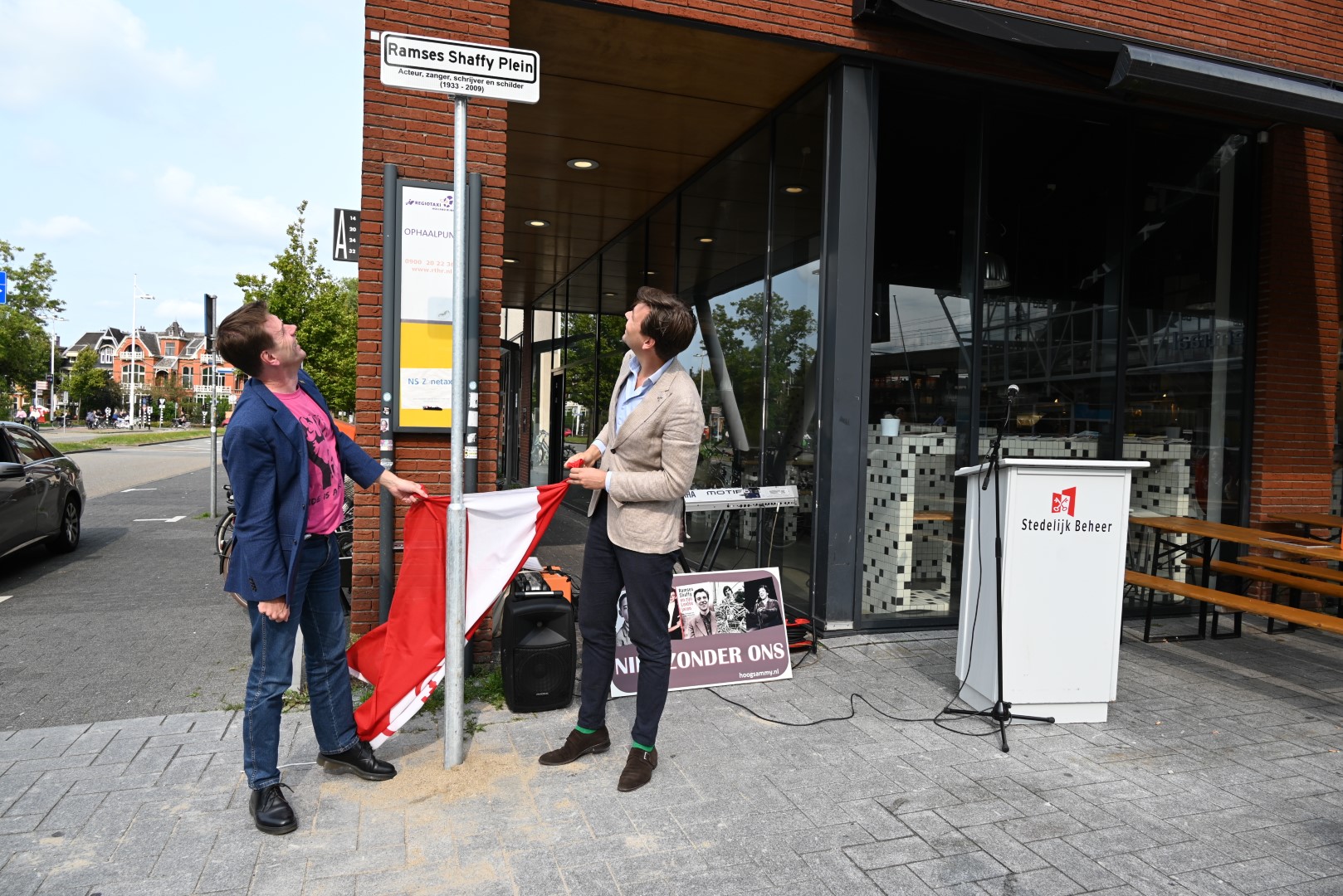 Initiatiefnemer was enkele jaren geleden raadslid Ivo van Spronsen van GroenLinks Leiden. Samen met wethouder Julius Terpstra (Bouwen, Wonen en Welzijn) onthulde hij het nieuwe witte straatnaambordje. Het bord is niet blauw, omdat het Ramses Shaffy Plein geen officiële straatnaam is. “Dat zou te ingewikkeld worden, omdat er ook adressen aan het plein zijn en die zouden dan veranderen. Daarom hebben we besloten om alleen het plein zelf deze naam te geven”, legt Terpstra uit. “Ook zou een echte naamswijziging voor verwarring kunnen zorgen bij alarmdiensten.”