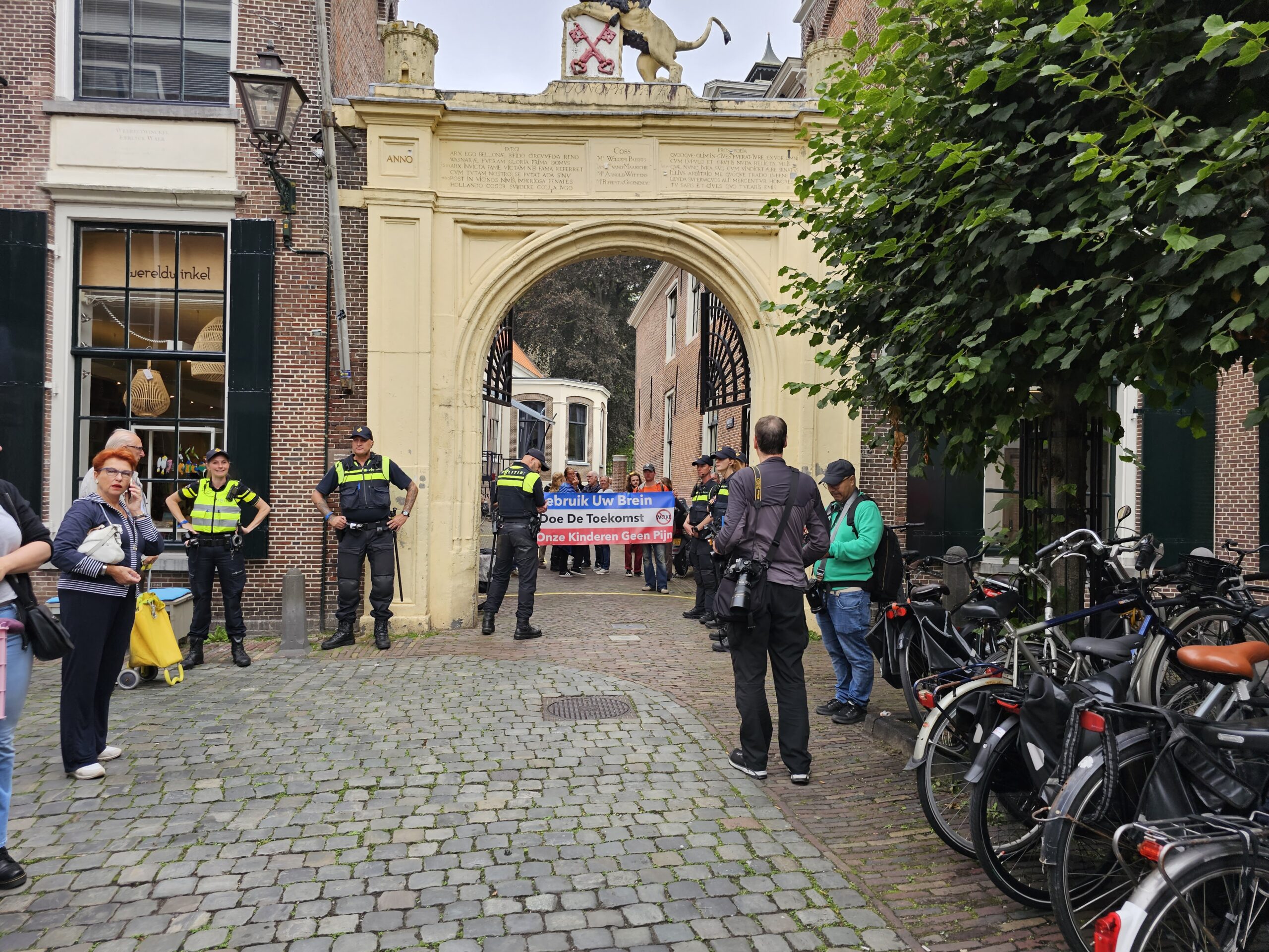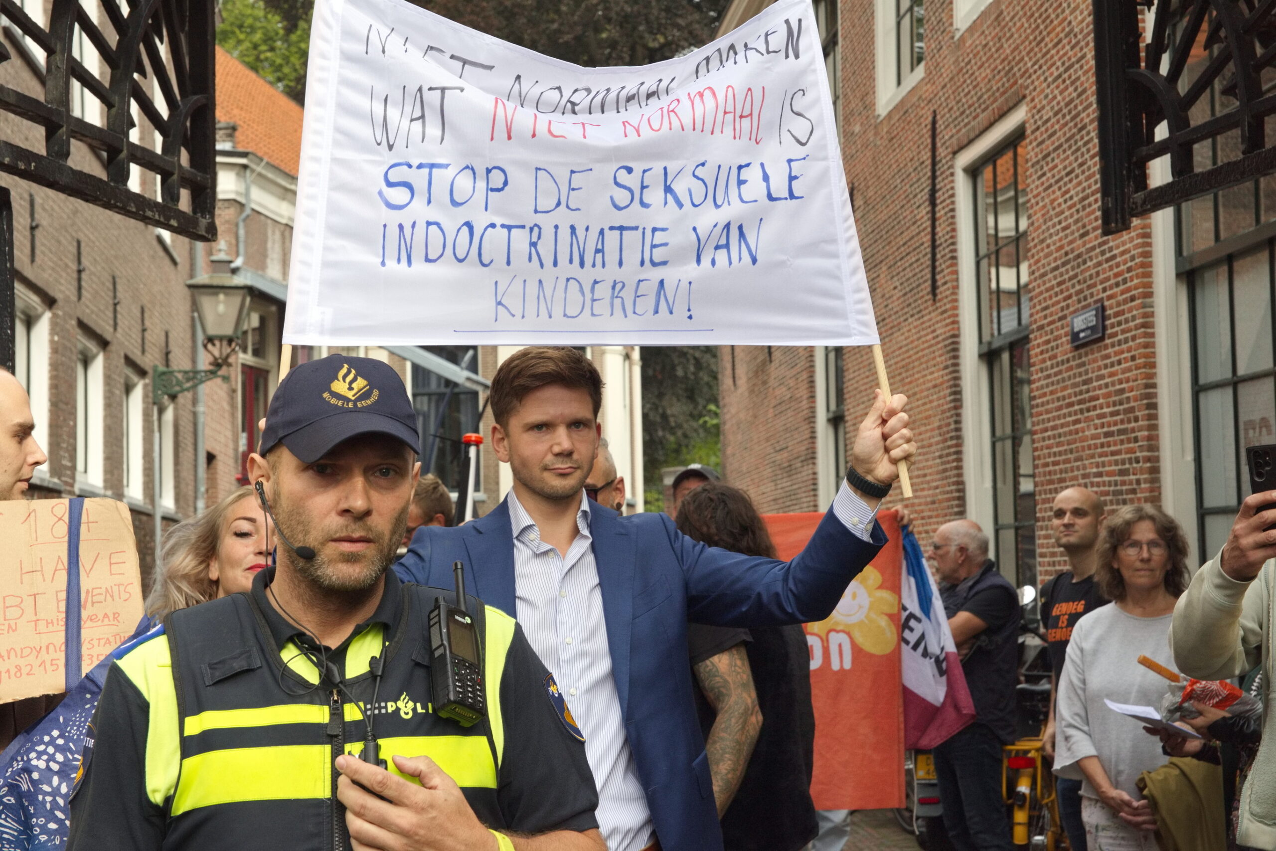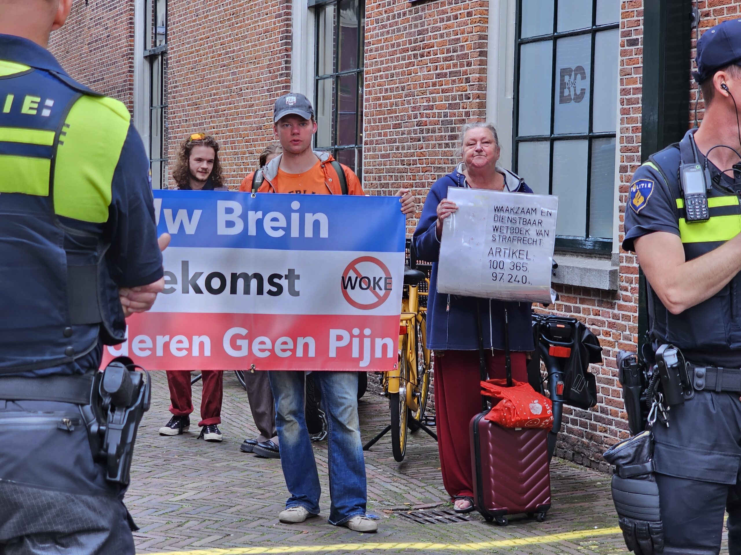Rond de BplusC-vestiging in de Nieuwstraat zijn ze vooral aanwezig voor het geval een groep demonstranten zich laat zien na een oproep van Tweede Kamerlid Gideon van Meijeren van Forum voor Democratie. Die riep via sociale media op tot verzet tegen het voorleesuurtje in de bieb. Daar las dragqueen Dina Diamond voor aan kinderen. Van Meijeren spreekt in zijn oproep van het ‘vergiftigen met seksuele afwijkingen van kleuterbreintjes’.