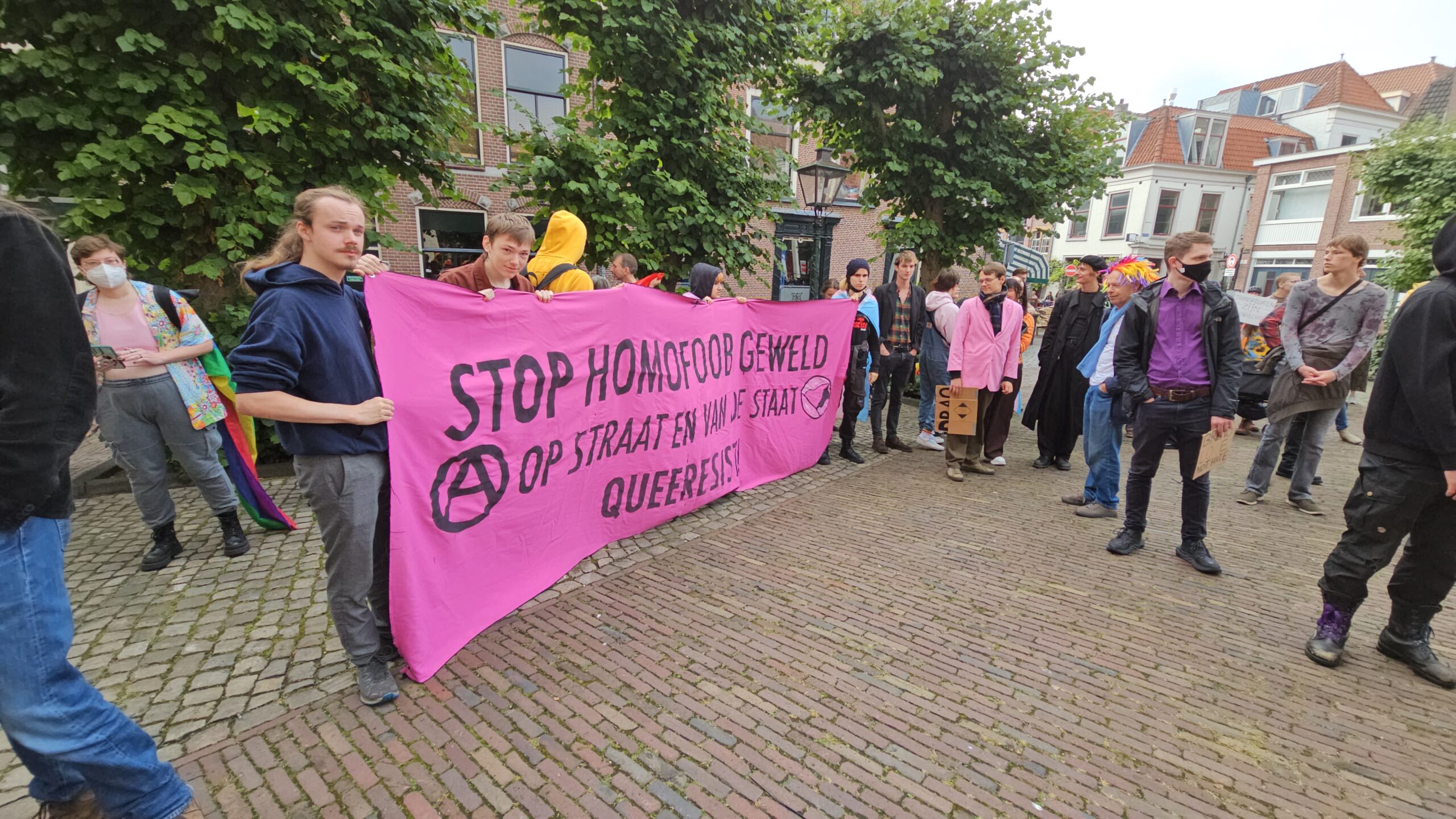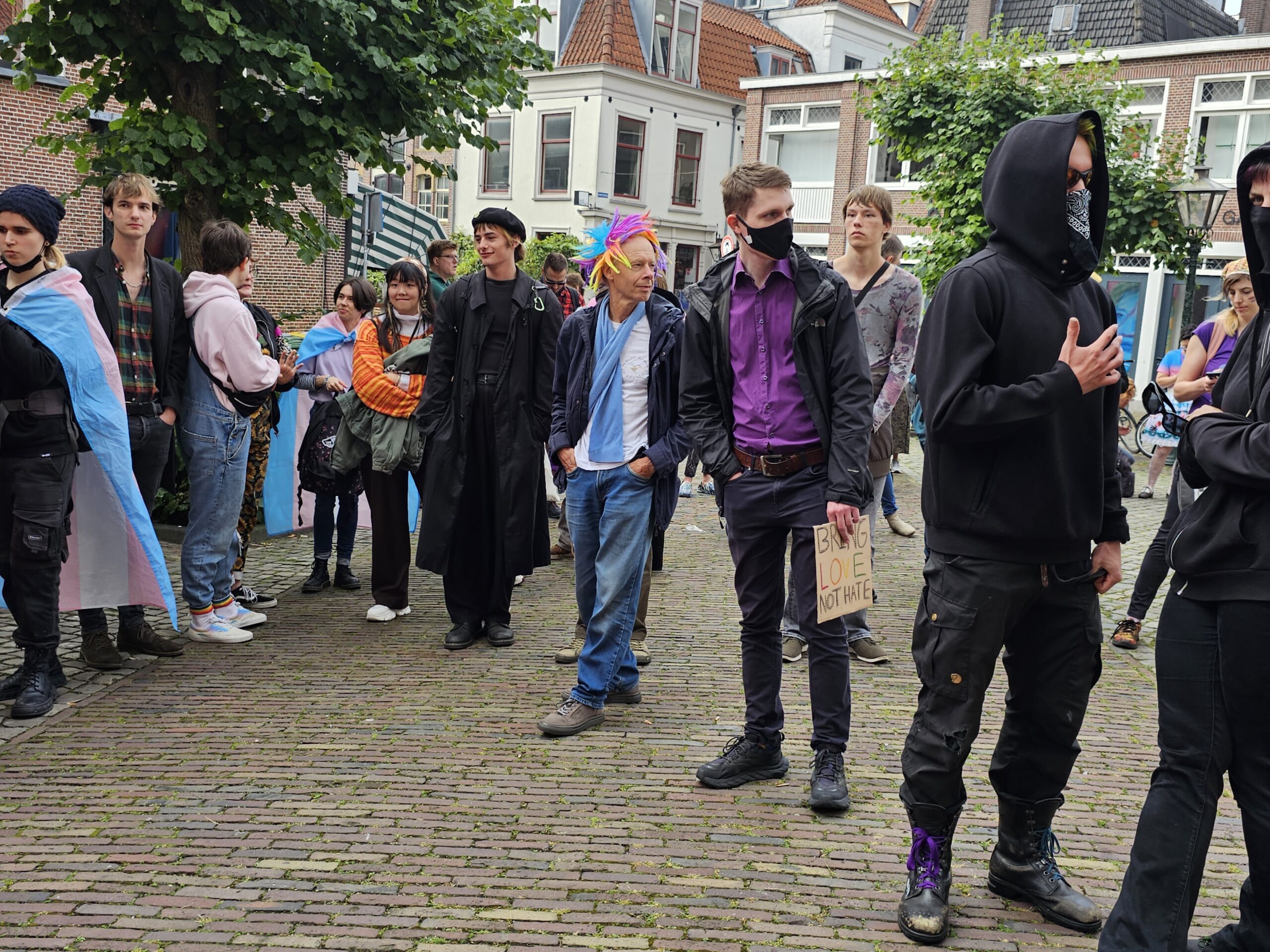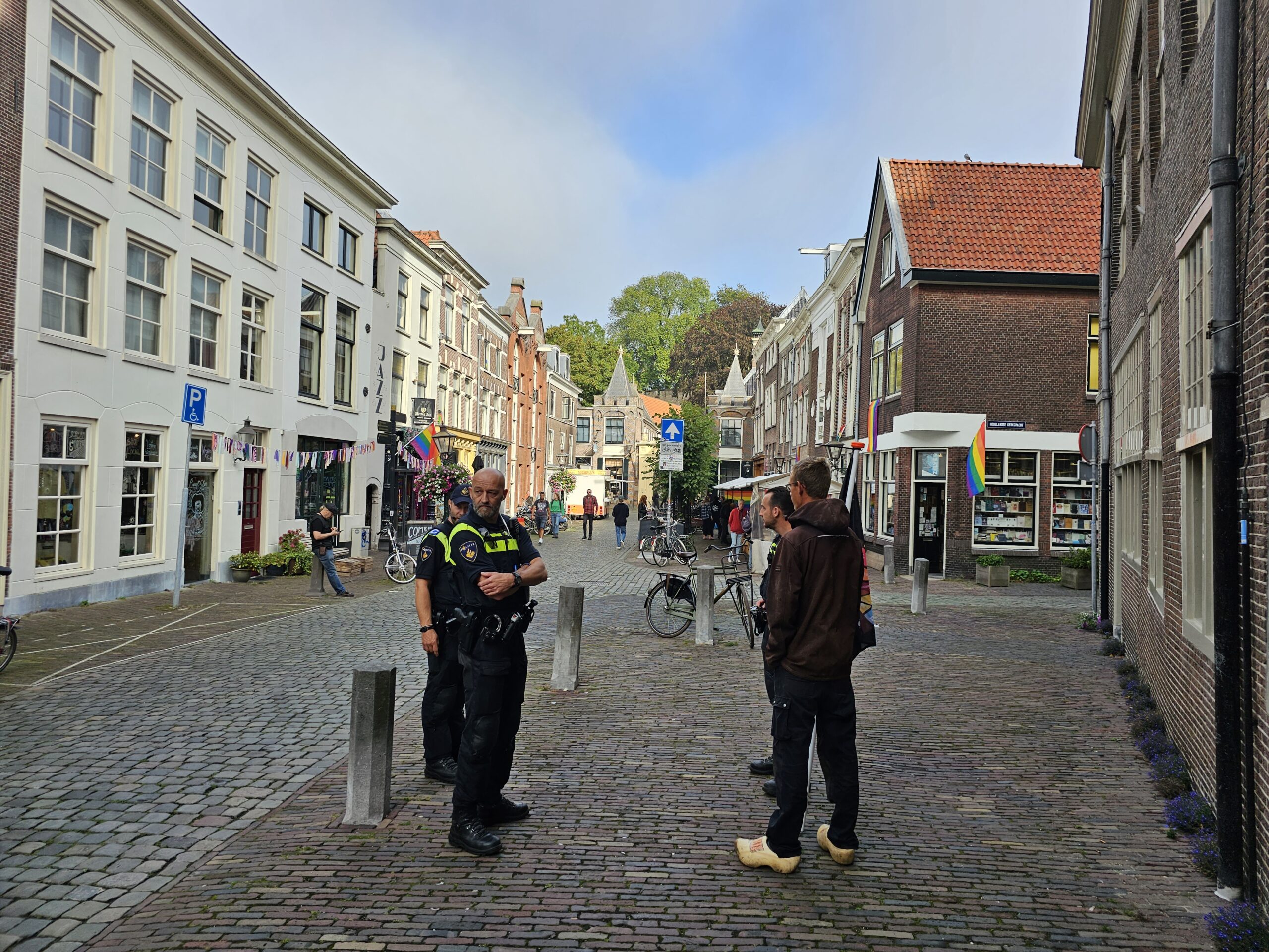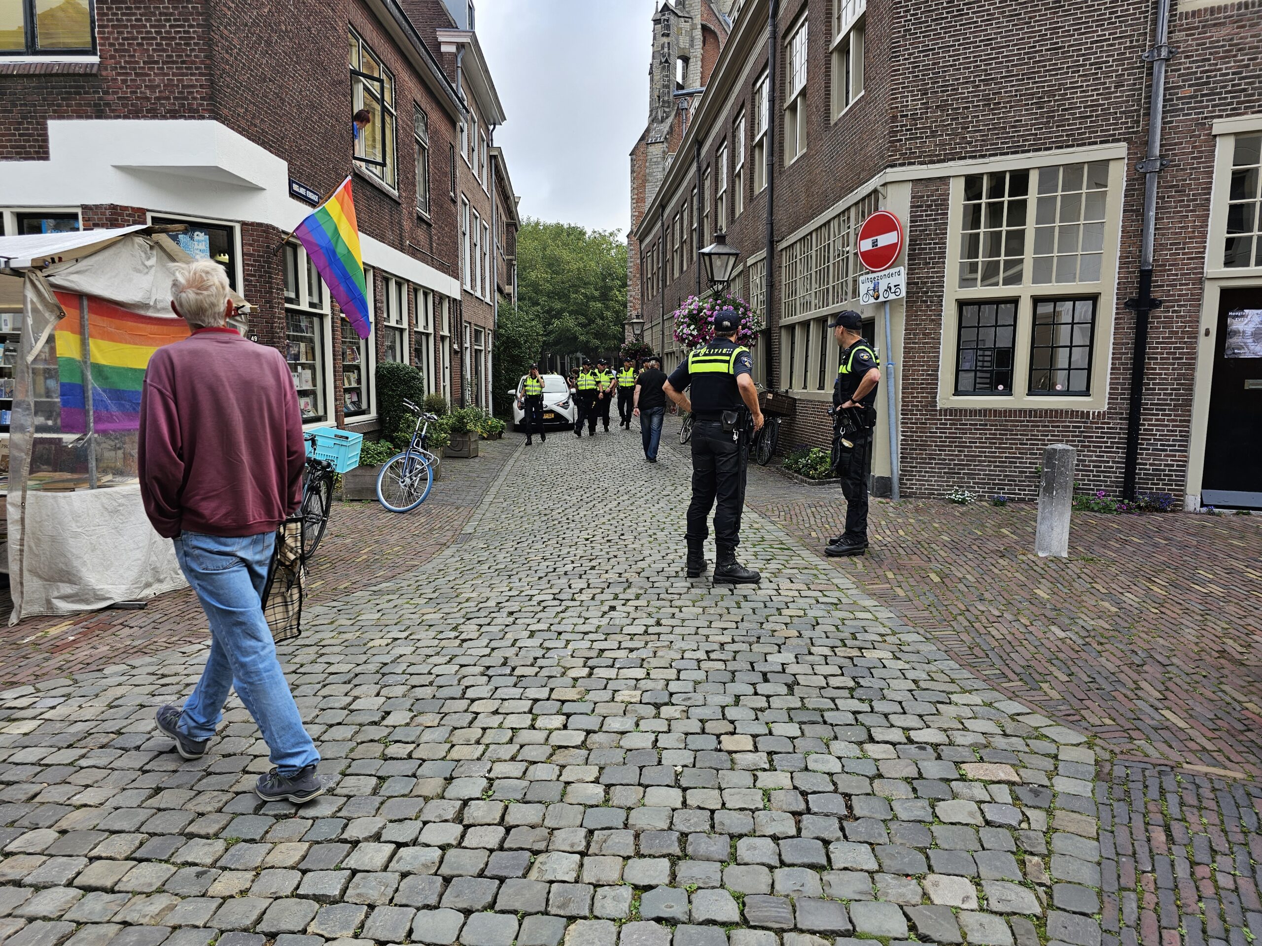 Al met al bleef het vrij rustig in het gebied. Een groep van meer dan honderd mensen van ‘Queer Pride March Leiden’ verzamelde zich rond de Hooglandse Kerk. Zaterdagmiddag gaan ze tijdens de Canal Pride Leiden demonstreren tegen het in hun ogen te commerciële karakter van dat evenement dat ze als ‘regenboog-kapitalisme’ omschrijven.