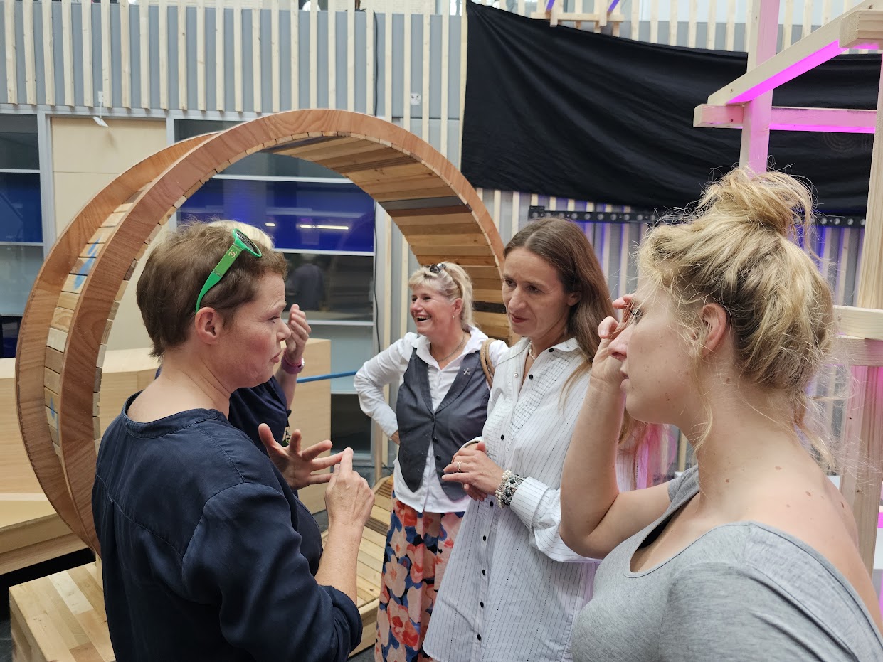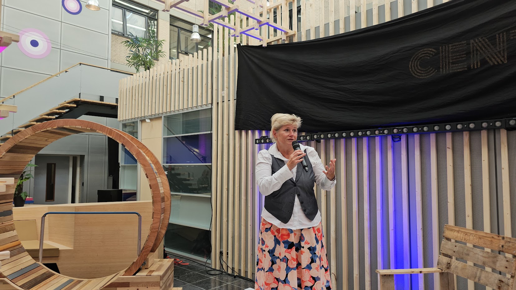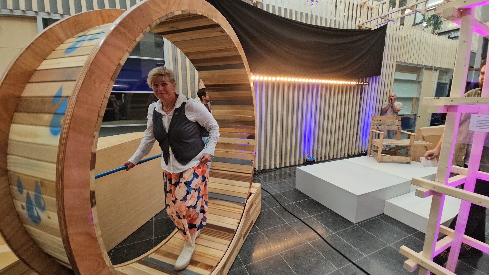 Cultuurwethouder Yvonne van Delft nam plaats in het hamsterwiel om energie op te wekken voor de opening. Toen alle lampjes aan waren, viel het doek. En werd het logo onthuld.