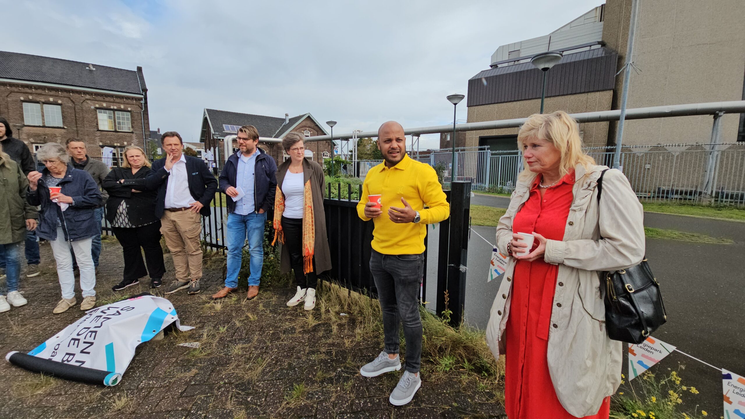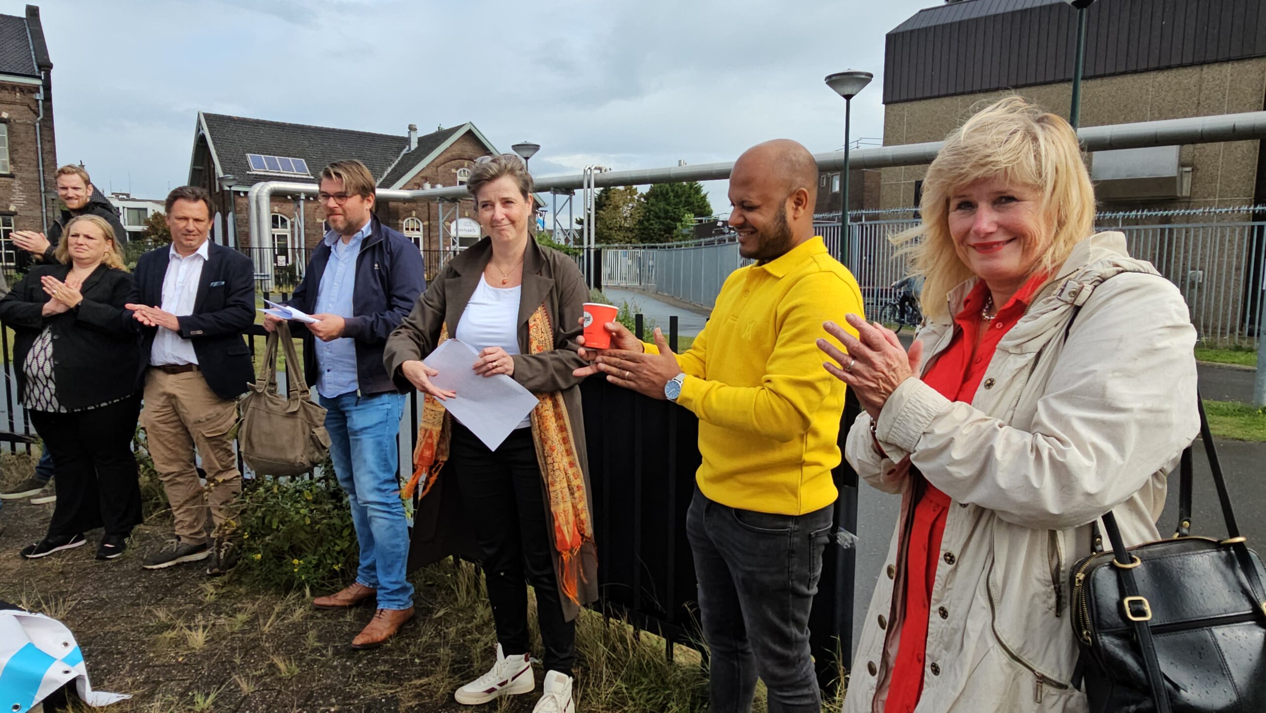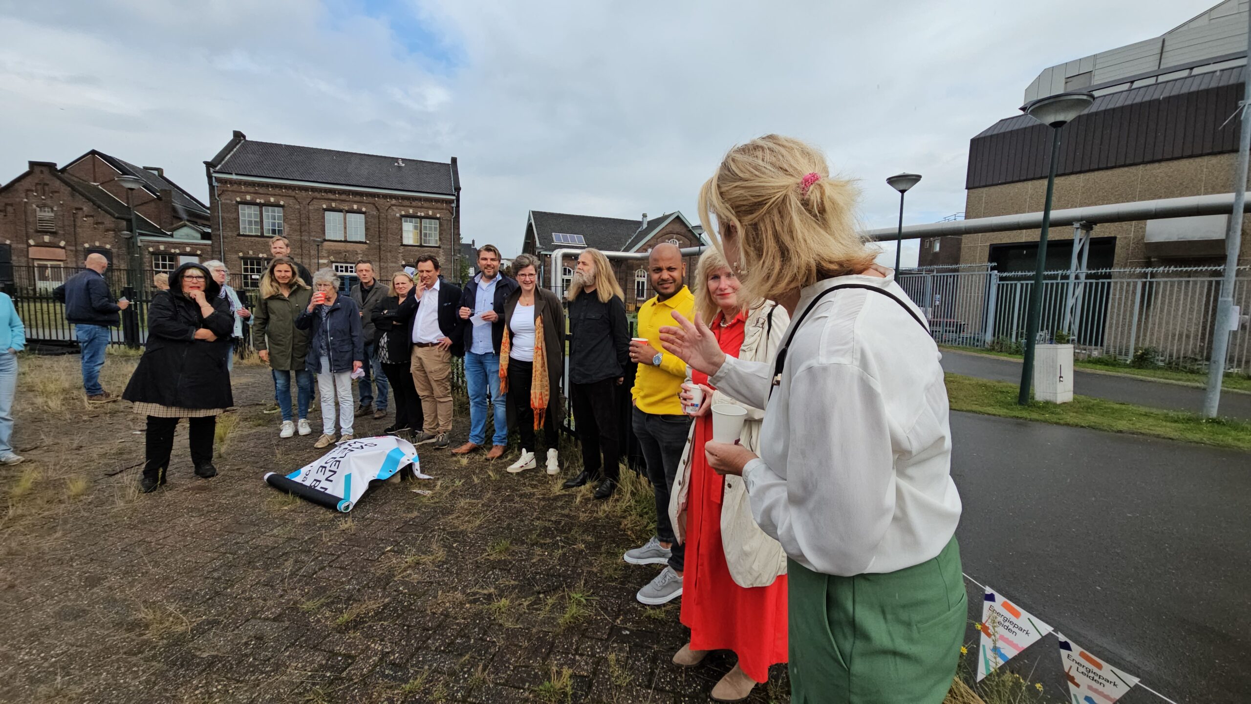 Cultuurwethouder Yvonne van Delft, Eduard Groen van de Bomenbond Rijnland, Barbara Wassenaar van Energiepark Leiden en Femke IJsinga-van Boxsel van Beelden in Leiden over het beeld in het Energiepark Leiden als symbool voor de toekomstige ontwikkelingen.