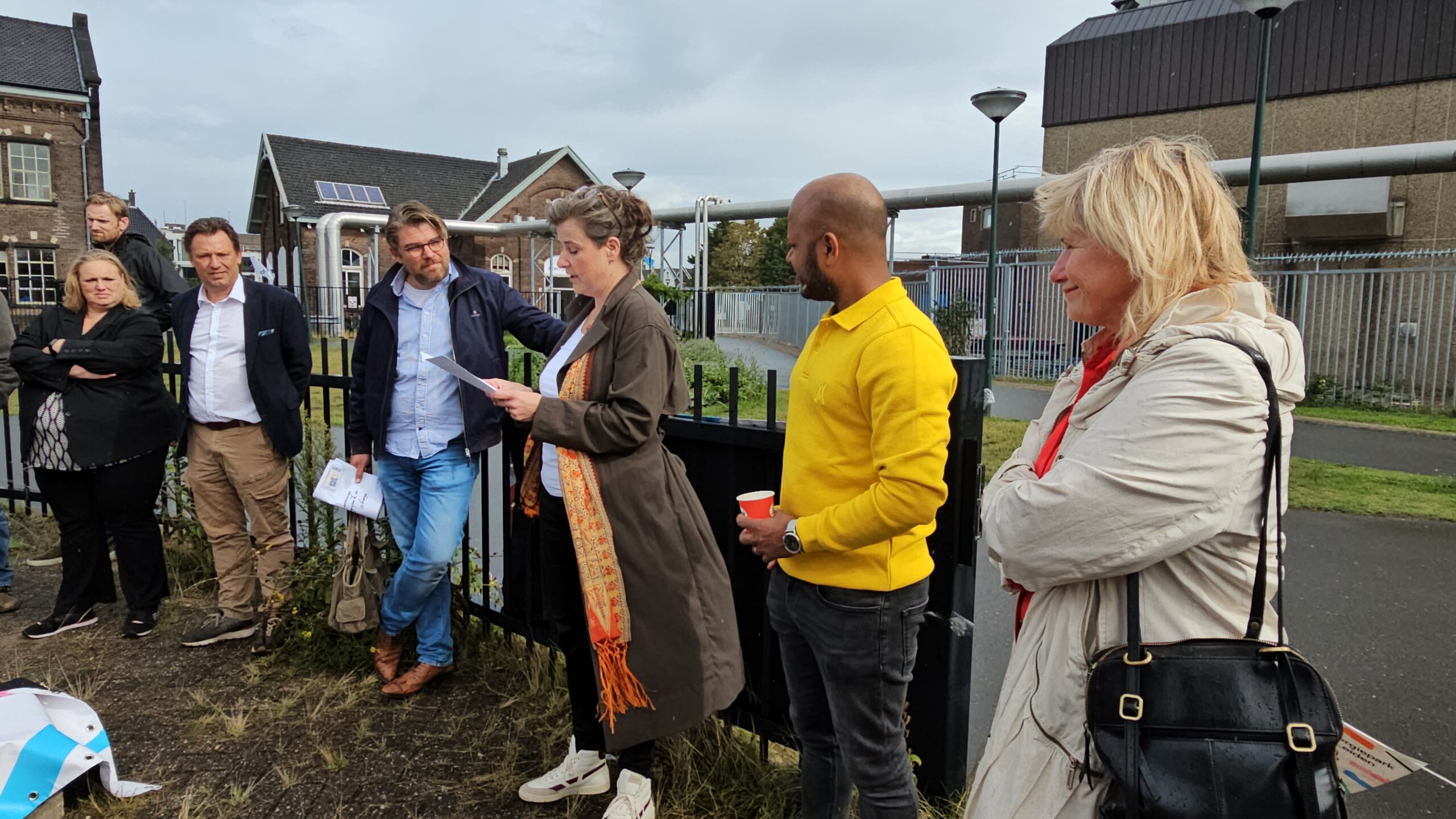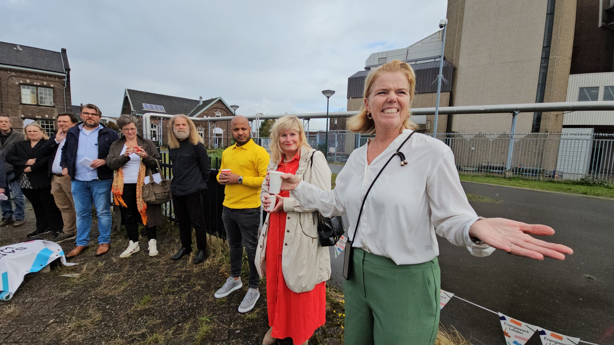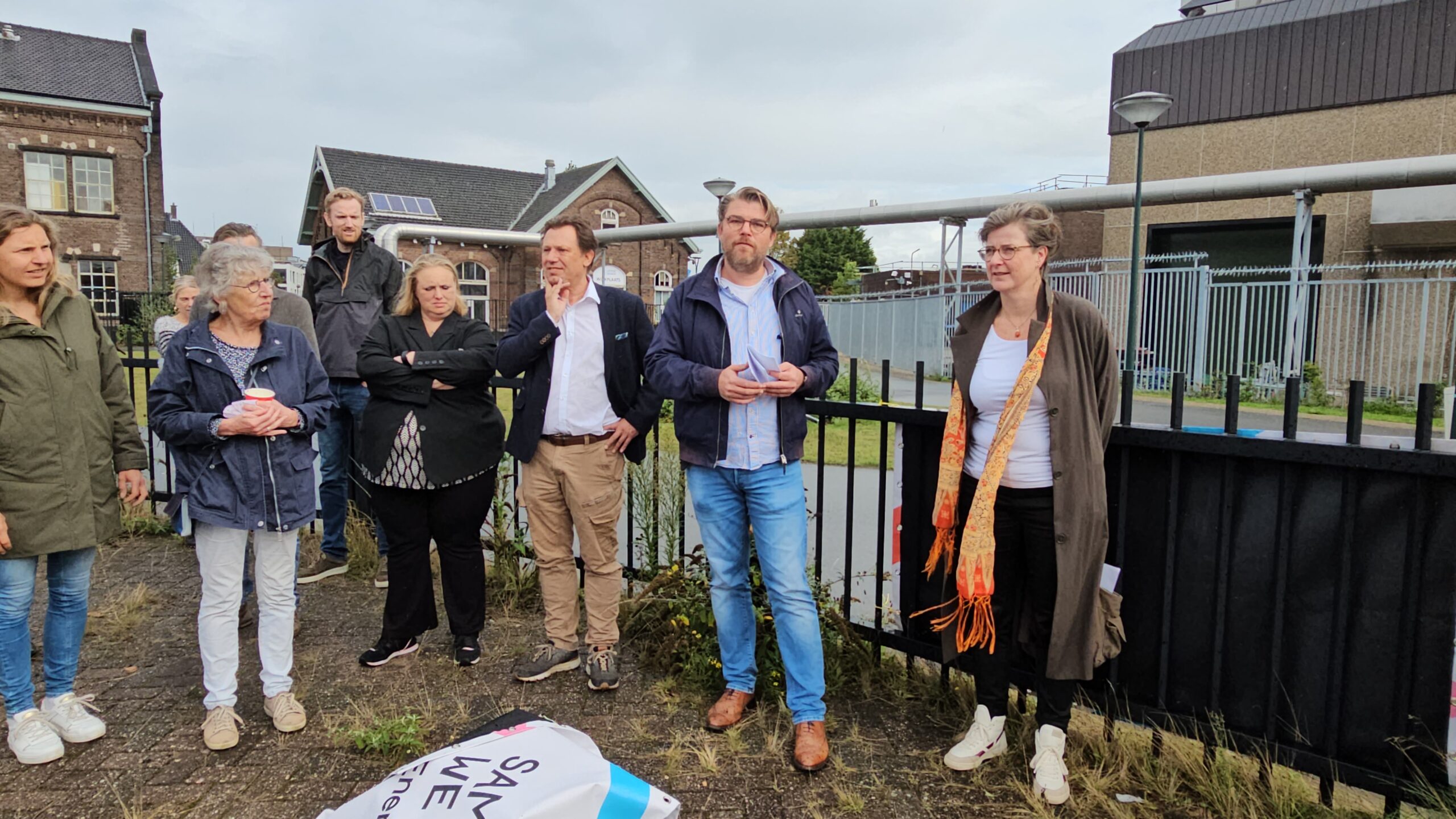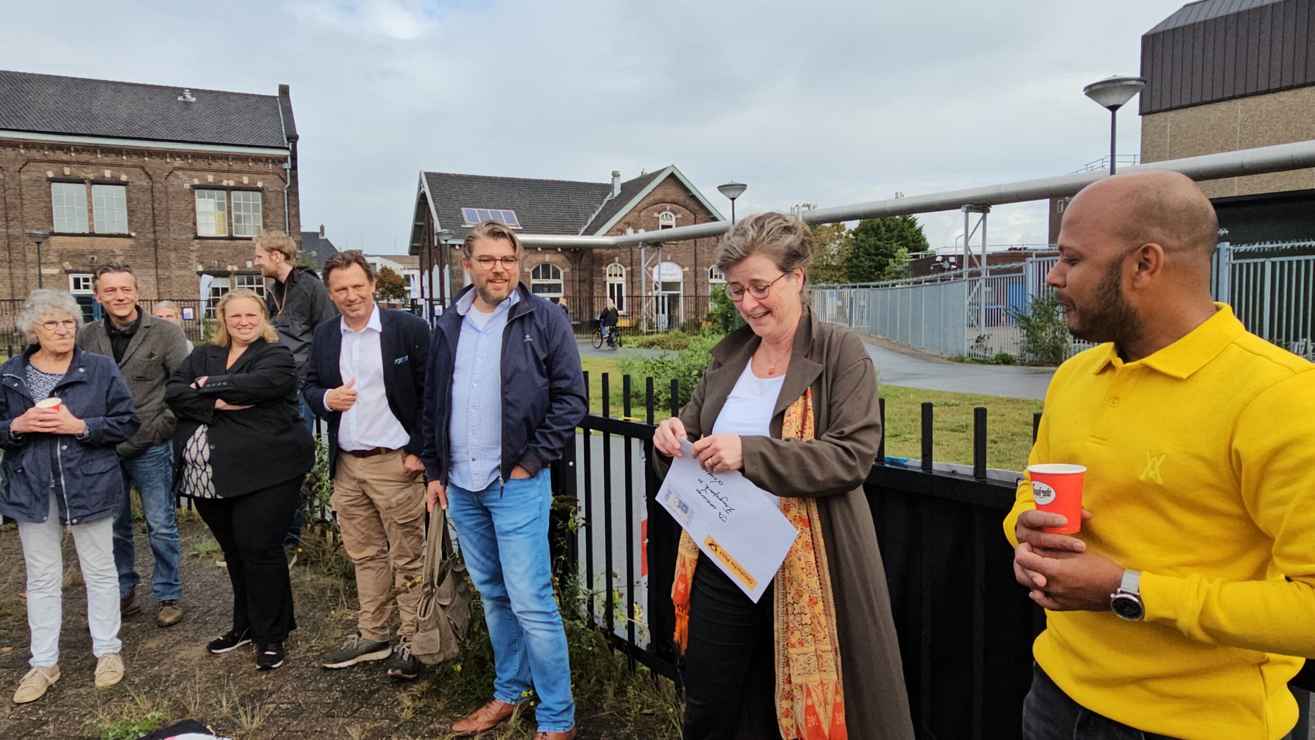 Cultuurwethouder Yvonne van Delft, Eduard Groen van de Bomenbond Rijnland, Barbara Wassenaar van Energiepark Leiden en Femke IJsinga-van Boxsel van Beelden in Leiden over het beeld in het Energiepark Leiden als symbool voor de toekomstige ontwikkelingen.