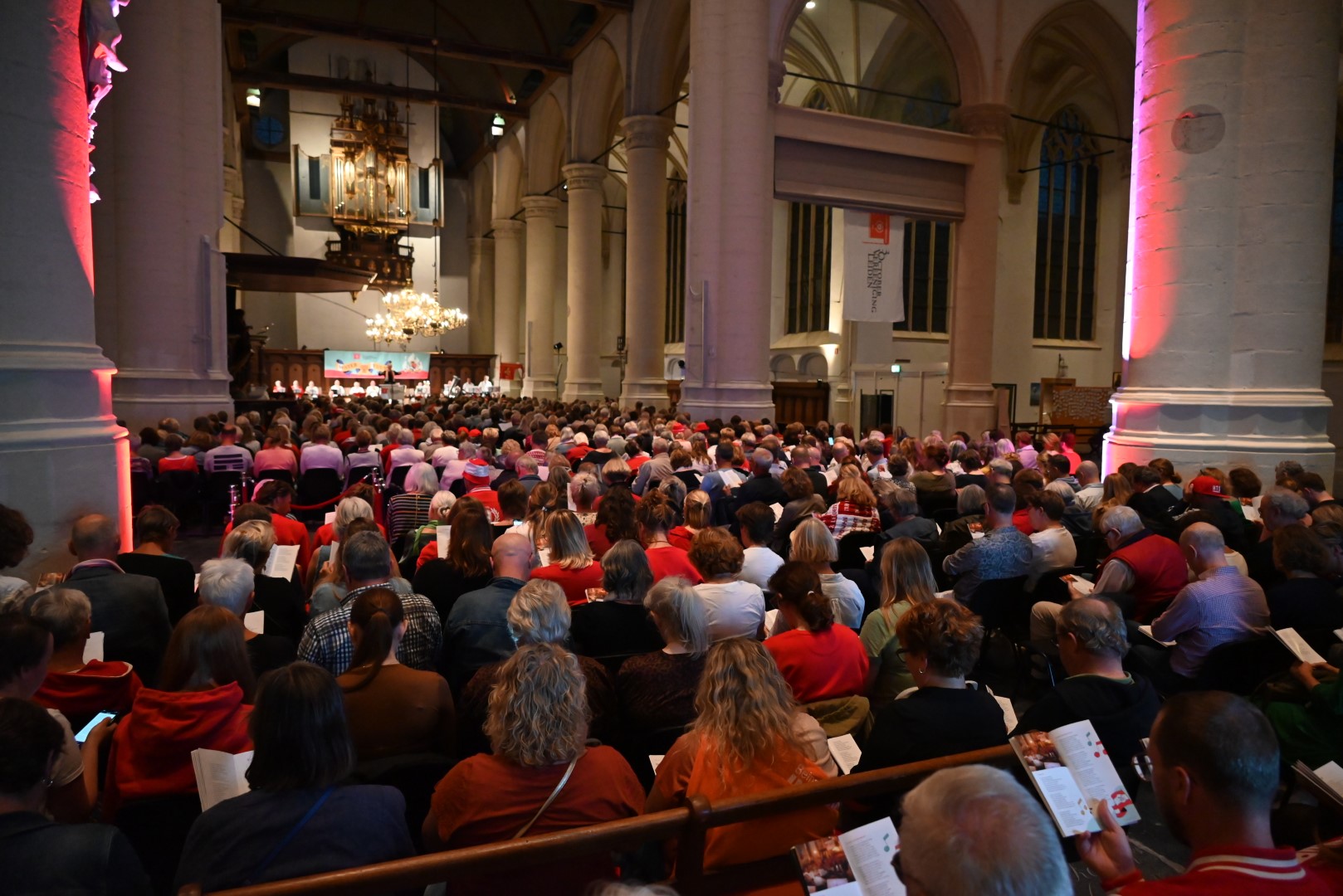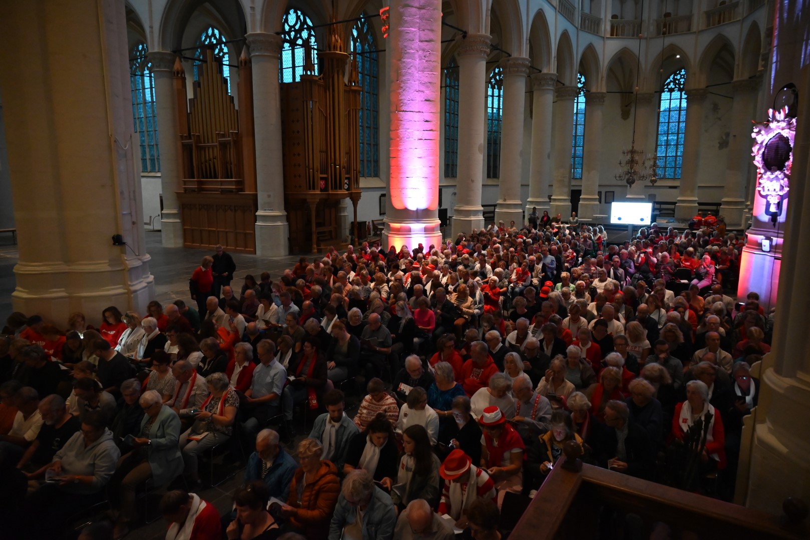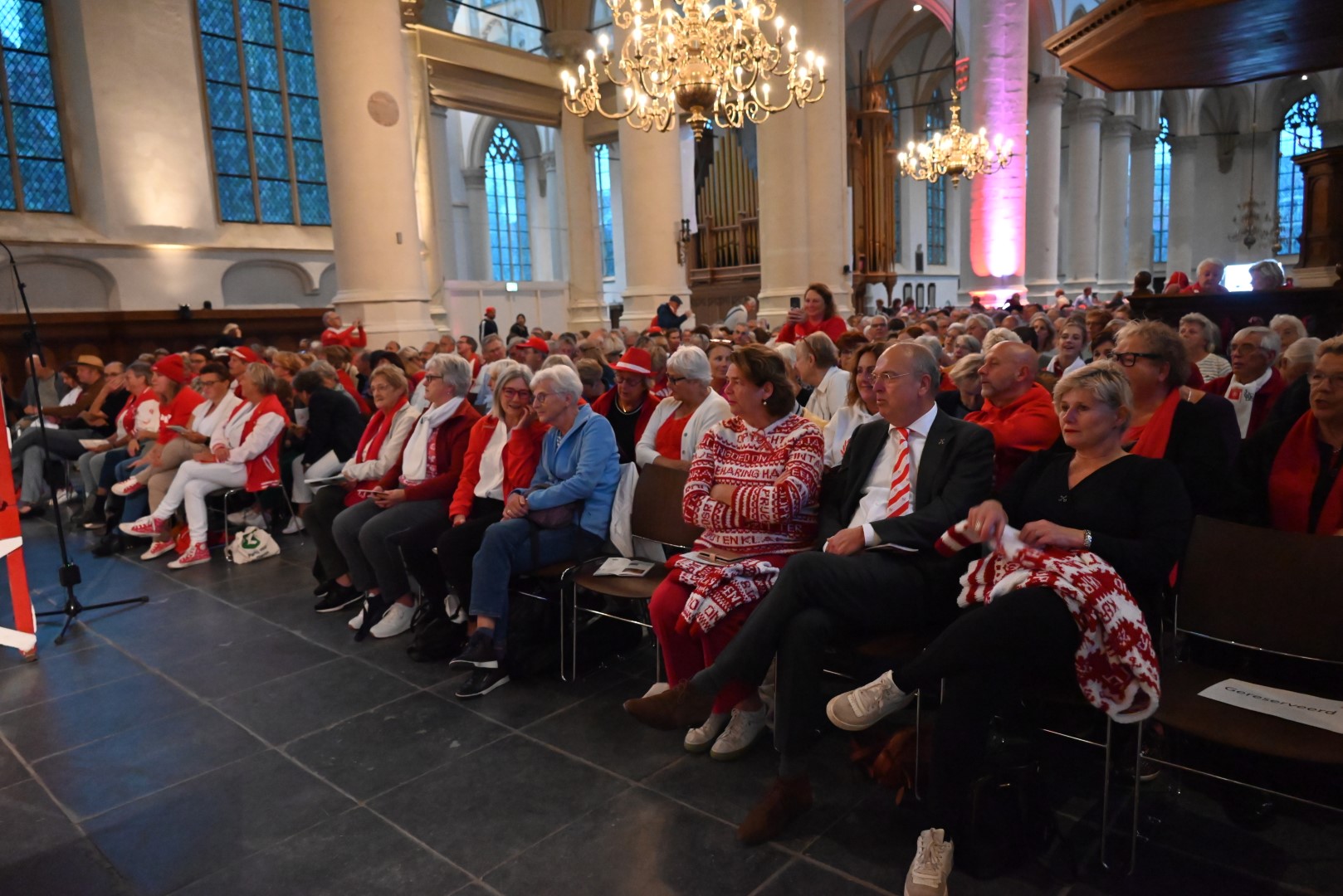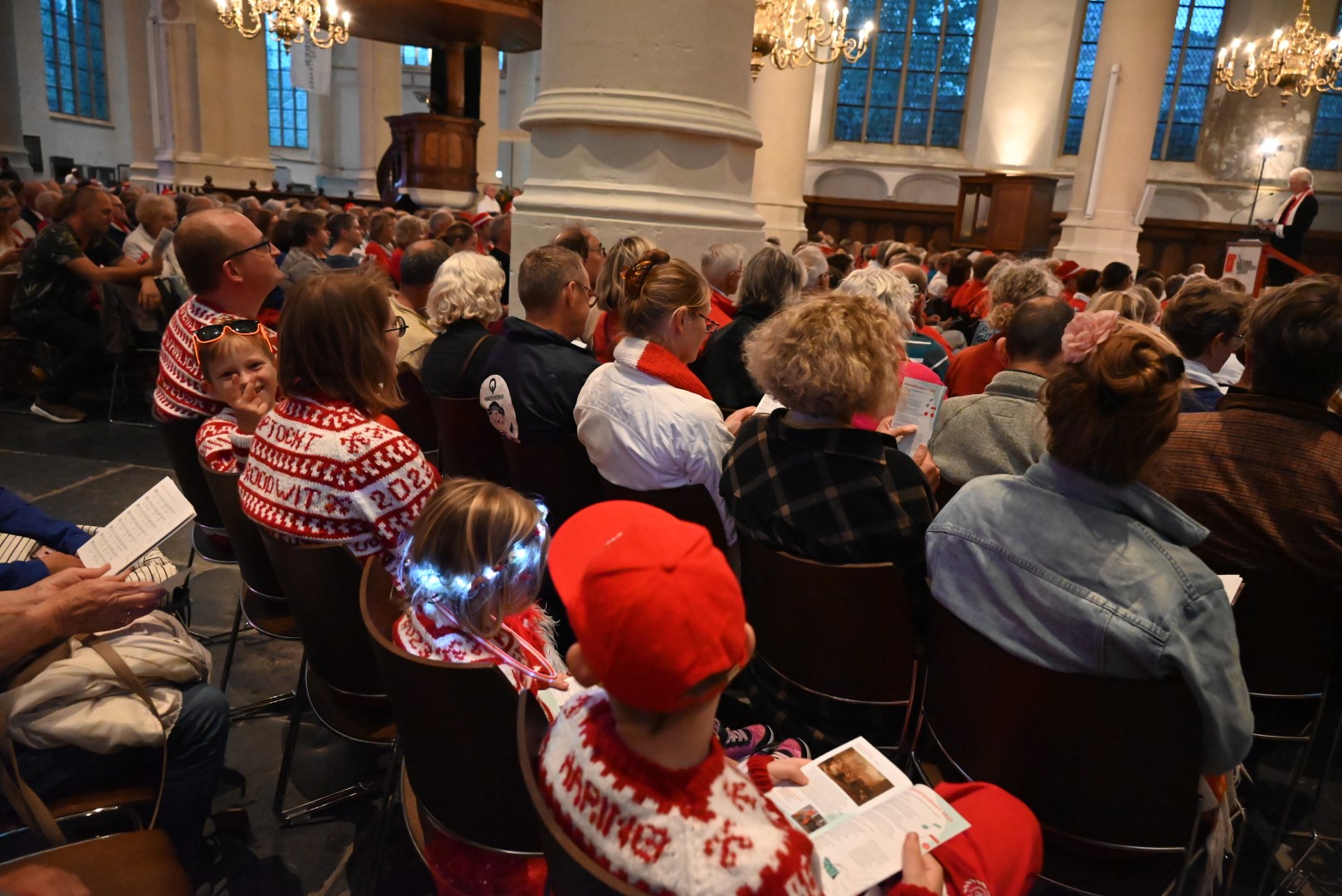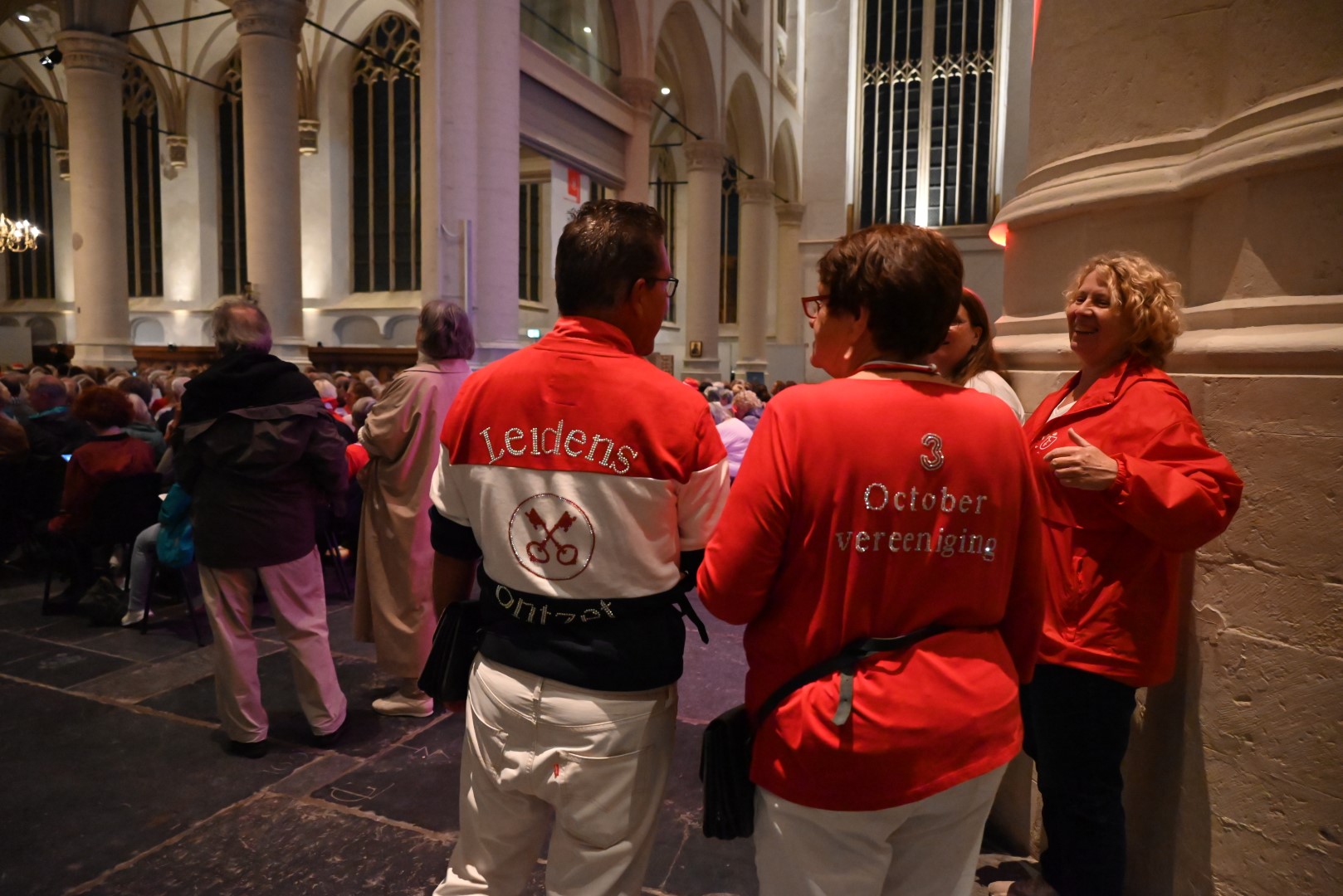 De sfeer zat er gisterenavond in de kerk dan ook goed in. Er werd gelachen om de strenge woorden van De Ru tegen de vele solisten die aan een eind van een lied toch nog even hun momentje wilden pakken en vol enthousiasme werden de tips van de dirigent opgevolgd. “Dit is echt een gewaarwording! Al die mensen, al die verbondenheid. En dat mooie zingen. Ik heb me echt ontzettend vermaakt”, vertelt een bezoeker die voor het erst meedeed. Ook komen mensen van buiten Leiden speciaal voor het oefenen terug naar de Sleutelstad. “Helemaal uit Utrecht gekomen ja. Het was weer schitterend. Ik ben zelfs een beetje schoor gezongen.”