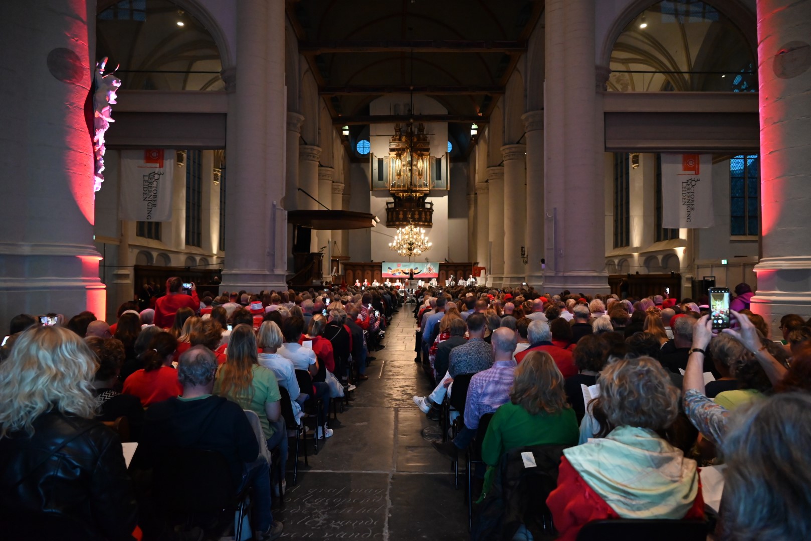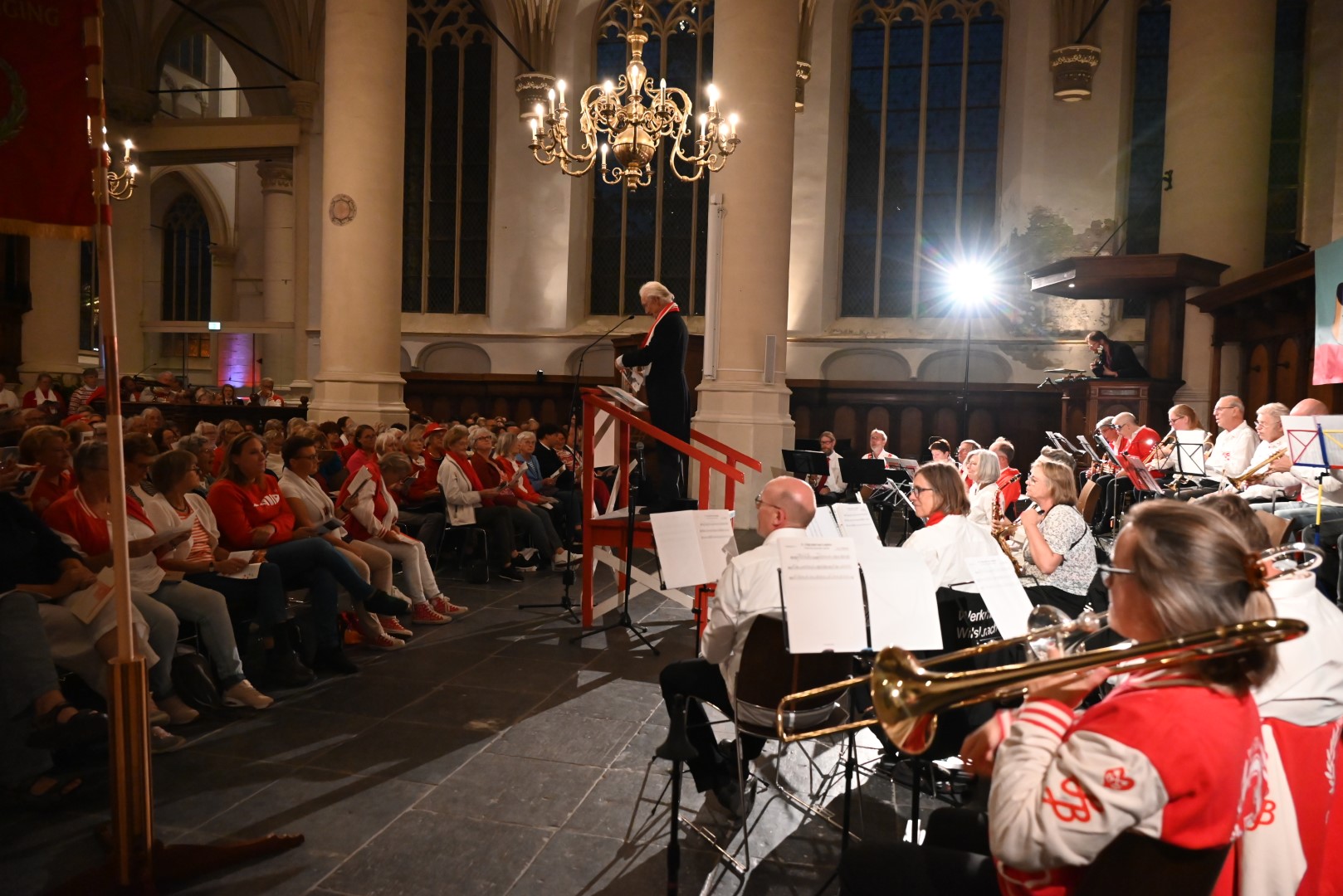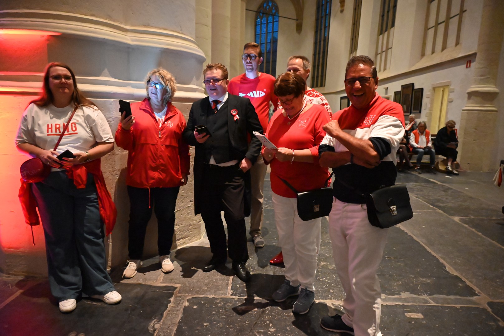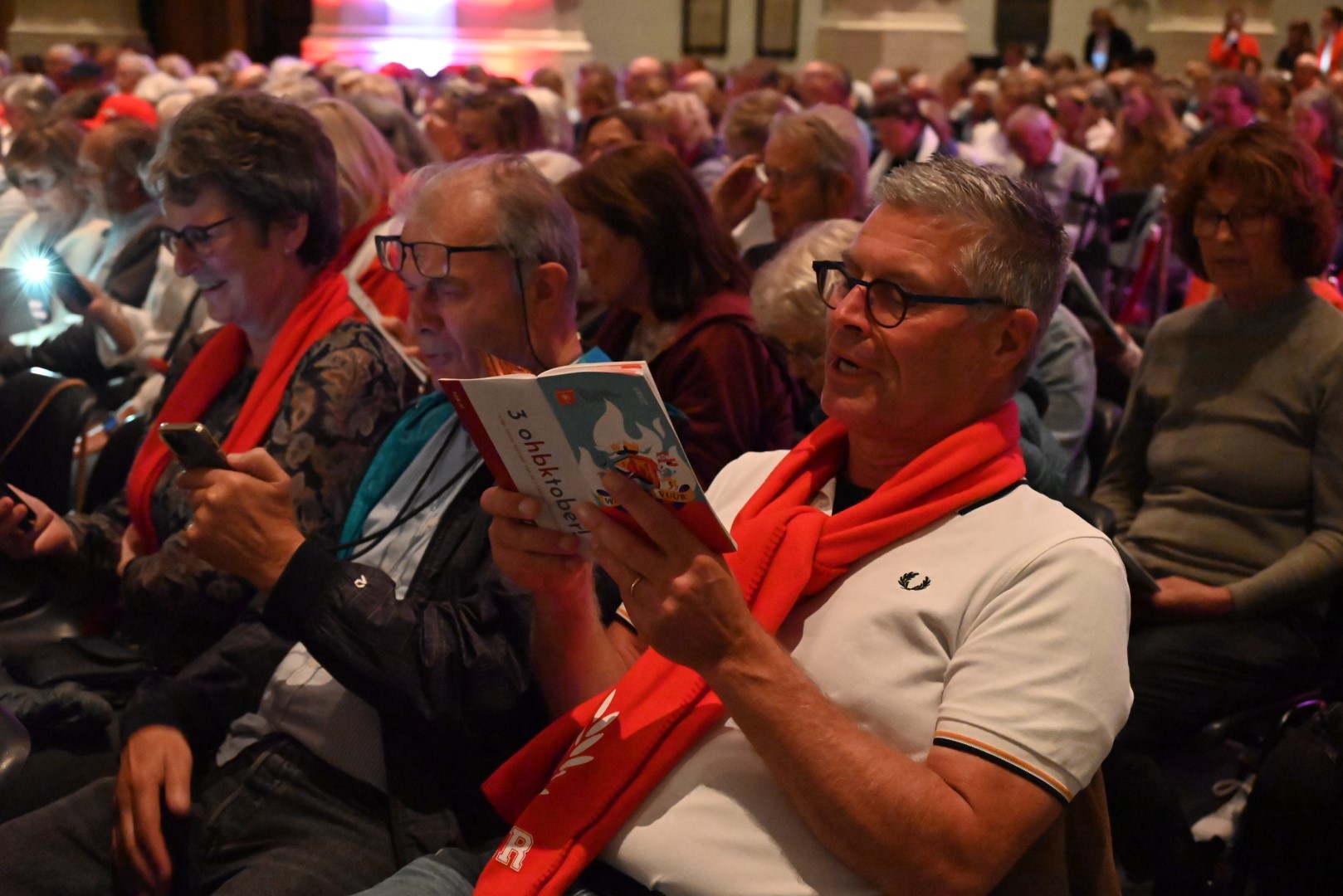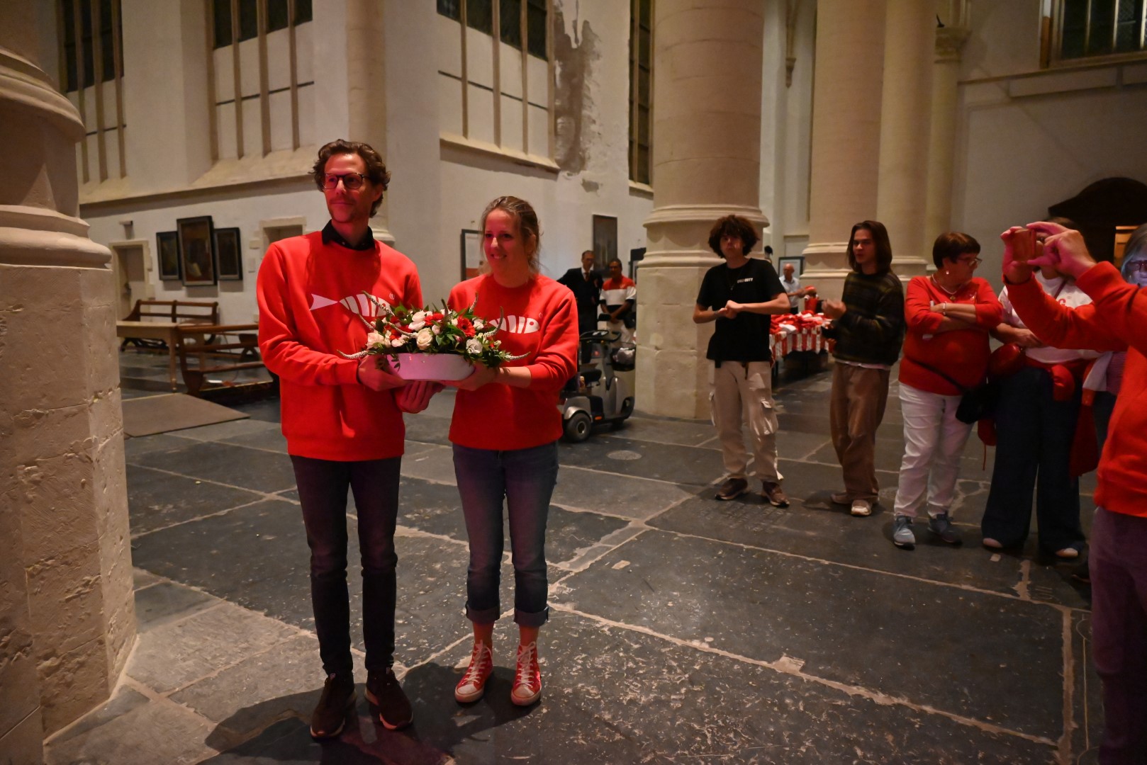 De sfeer zat er gisterenavond in de kerk dan ook goed in. Er werd gelachen om de strenge woorden van De Ru tegen de vele solisten die aan een eind van een lied toch nog even hun momentje wilden pakken en vol enthousiasme werden de tips van de dirigent opgevolgd. “Dit is echt een gewaarwording! Al die mensen, al die verbondenheid. En dat mooie zingen. Ik heb me echt ontzettend vermaakt”, vertelt een bezoeker die voor het erst meedeed. Ook komen mensen van buiten Leiden speciaal voor het oefenen terug naar de Sleutelstad. “Helemaal uit Utrecht gekomen ja. Het was weer schitterend. Ik ben zelfs een beetje schoor gezongen.”