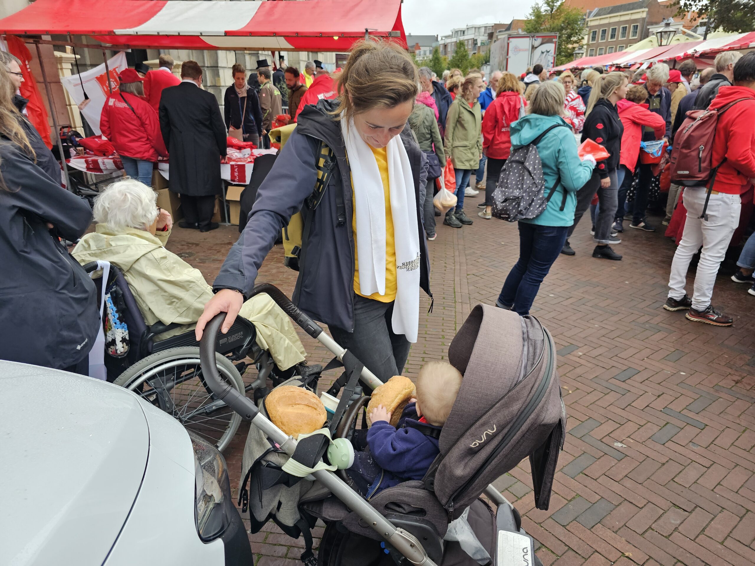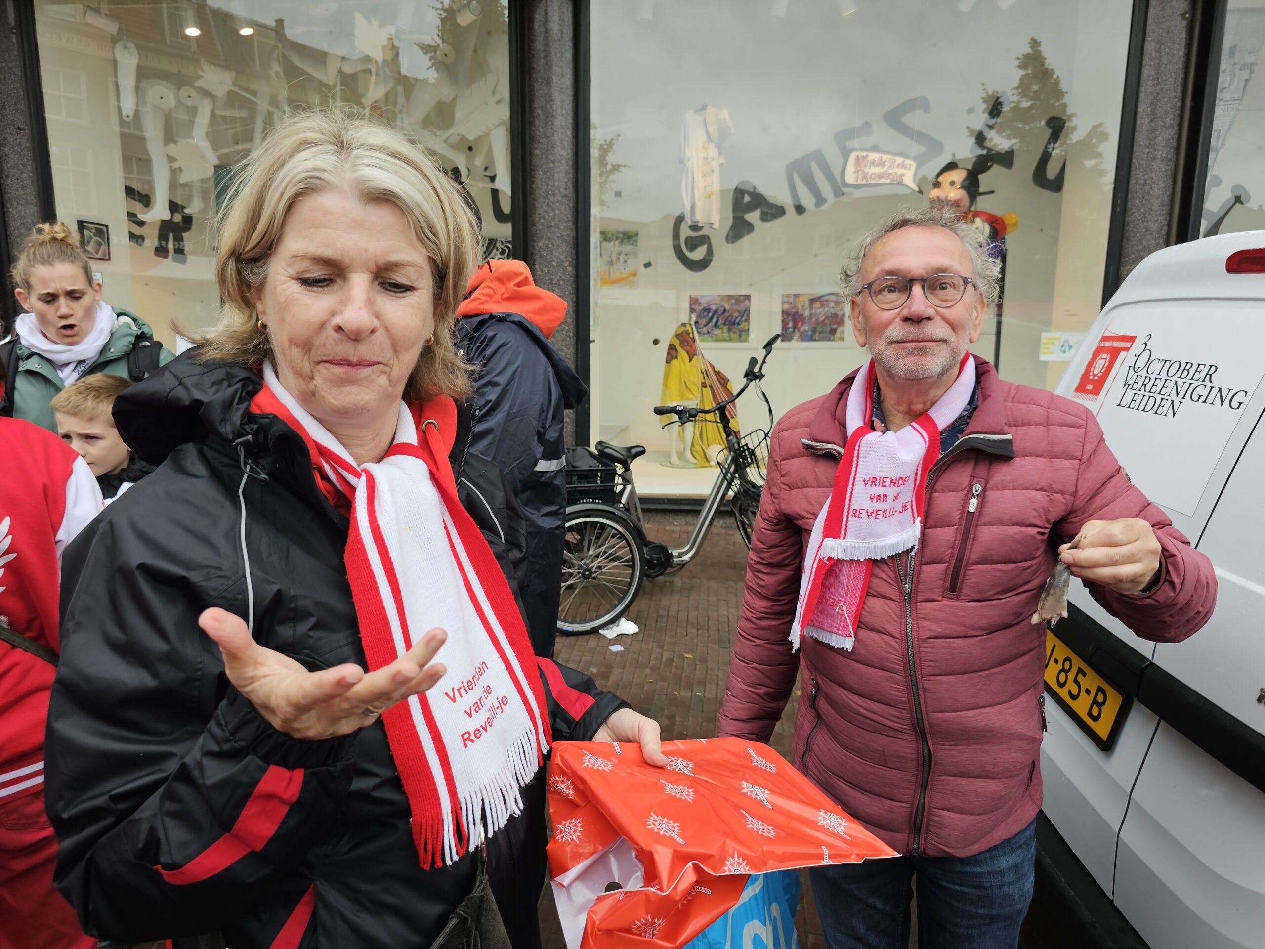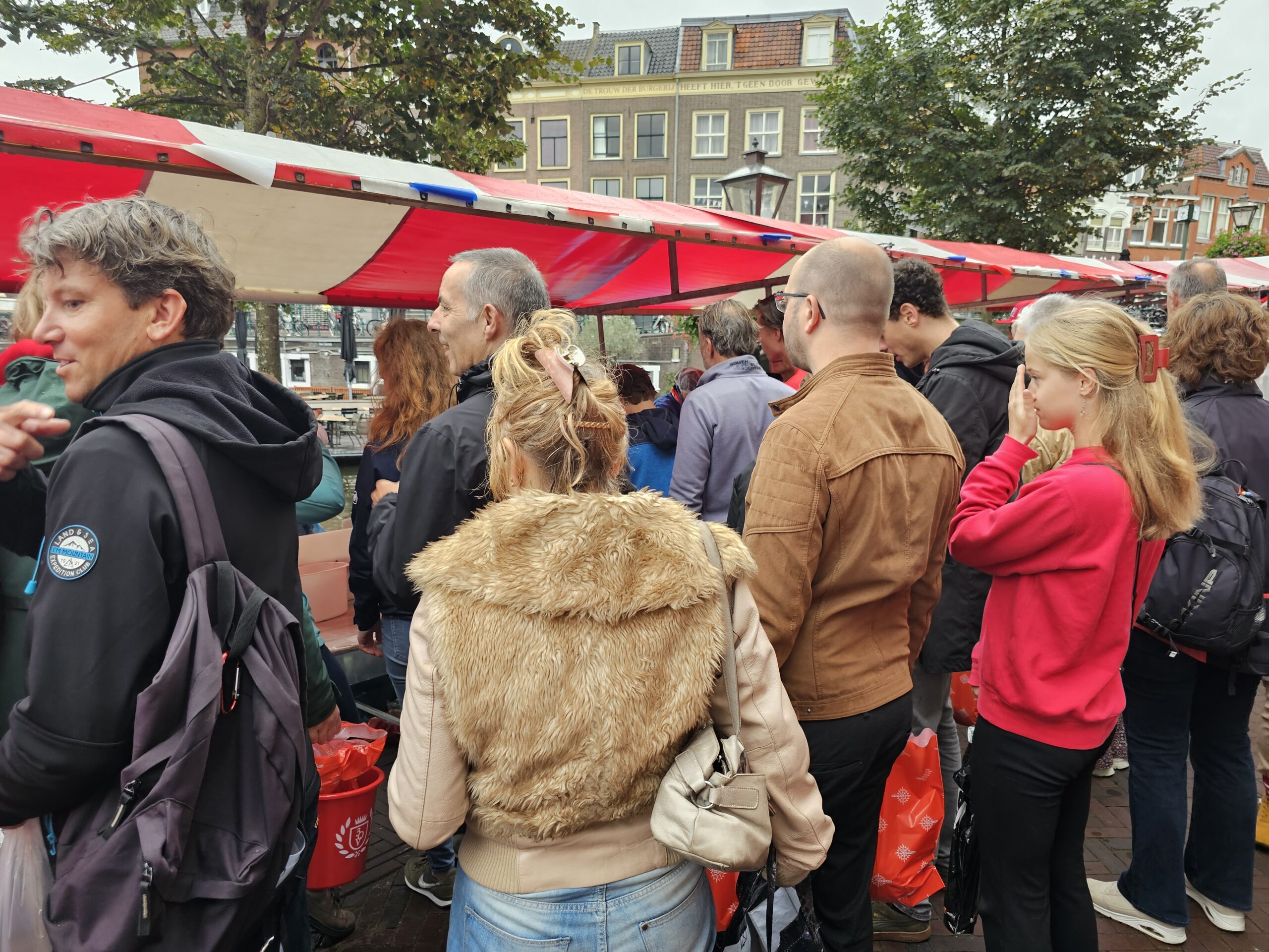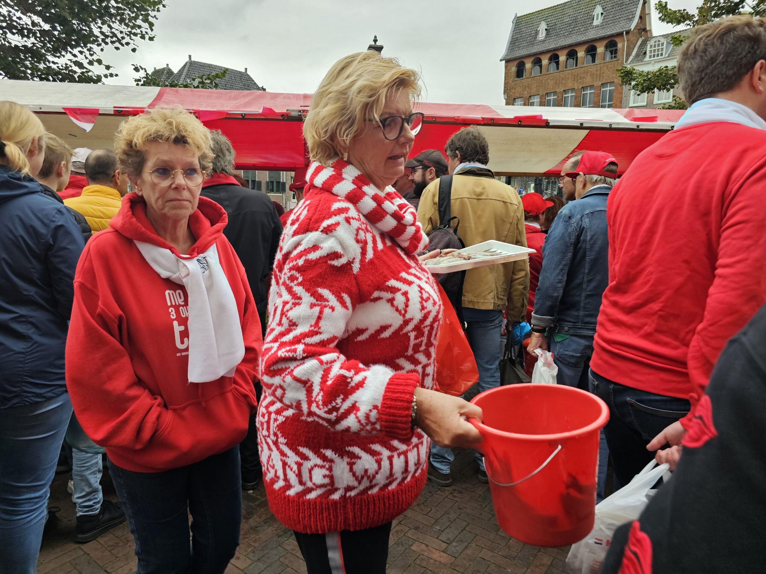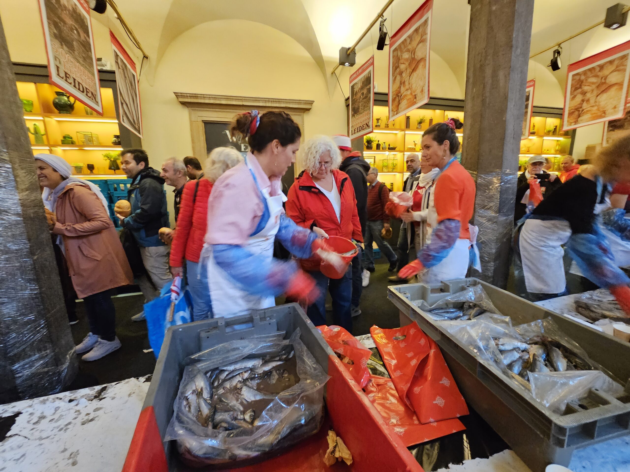 Bij De Waag was het zoals elk jaar op 3 oktober een drukte van belang bij het uitdelen van haring en wittebrood. Rond 9.00 uur groeide de rij nog wat verder aan, want dat is het moment dat binnen de haring officieel wordt geproefd.