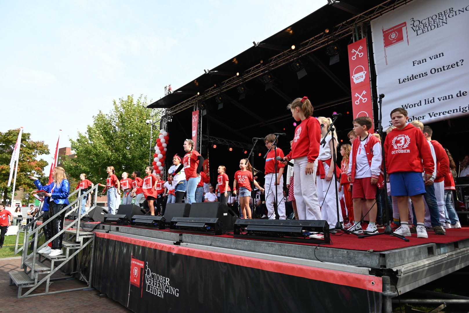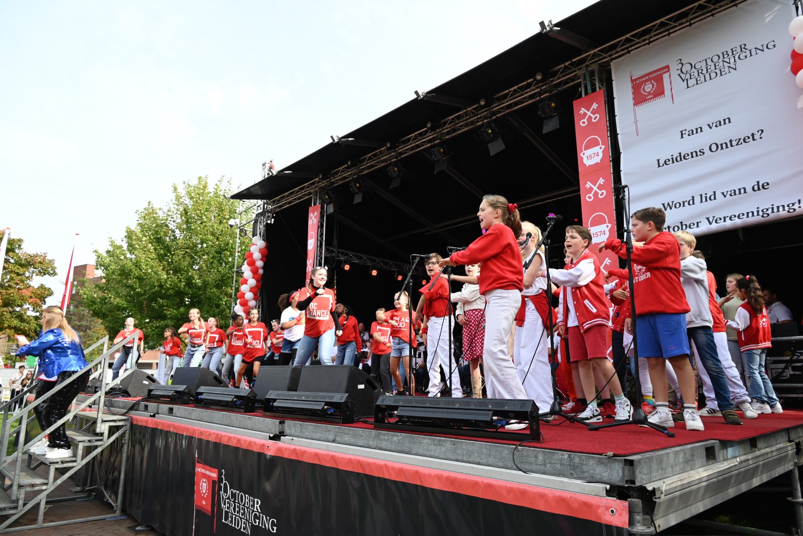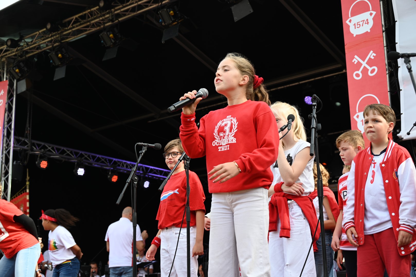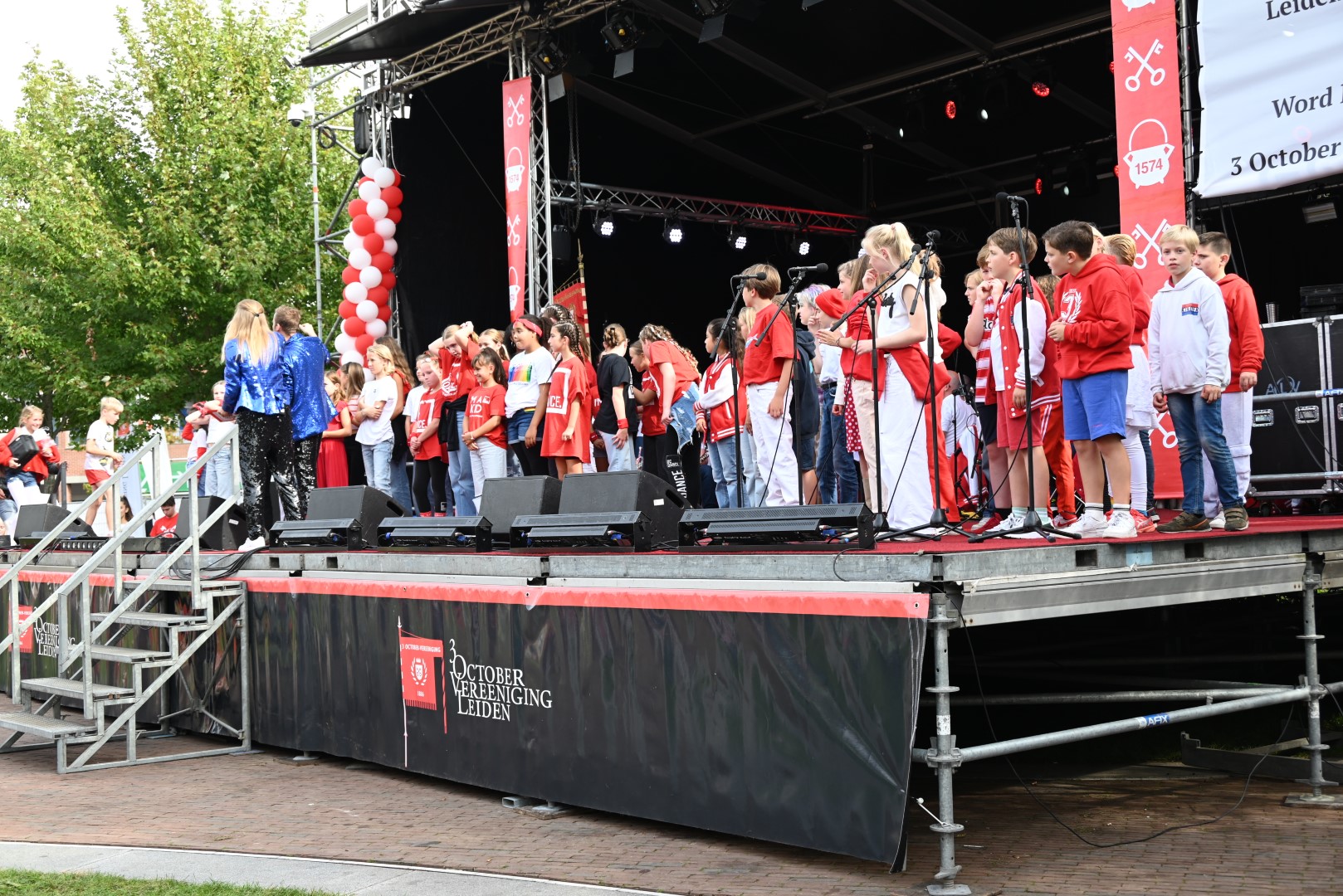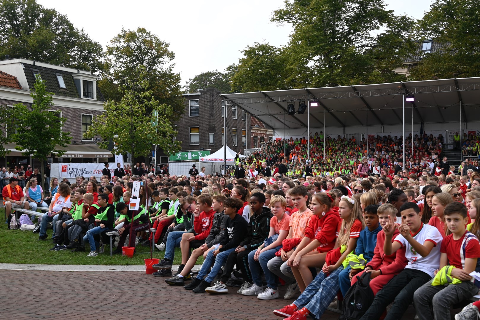 Maandagmiddag kwamen zo’n 3.000 scholieren van de klassen 7 en 8 van basisscholen uit Leiden en de buurgemeenten naar het Garenmarktplein om gezamenlijk de 3 oktoberliedjes te zingen. Op die manier krijgen ze het feest der feesten met de paplepel ingegoten.