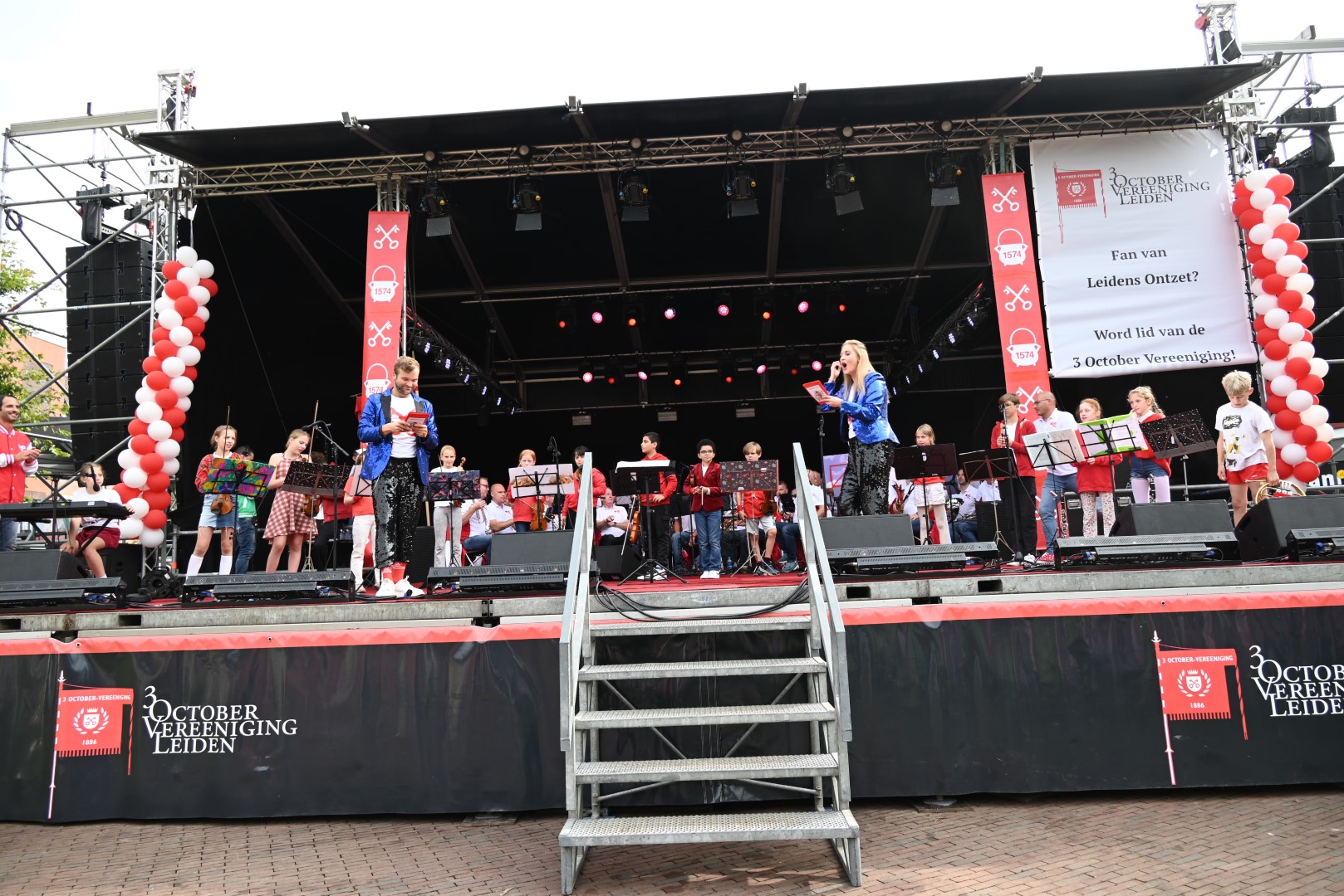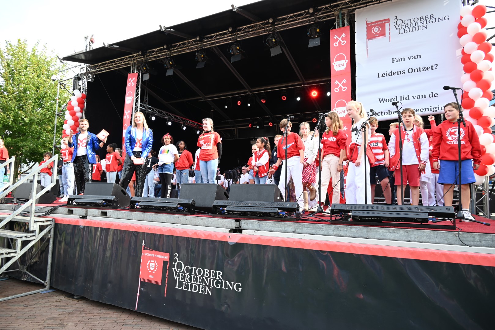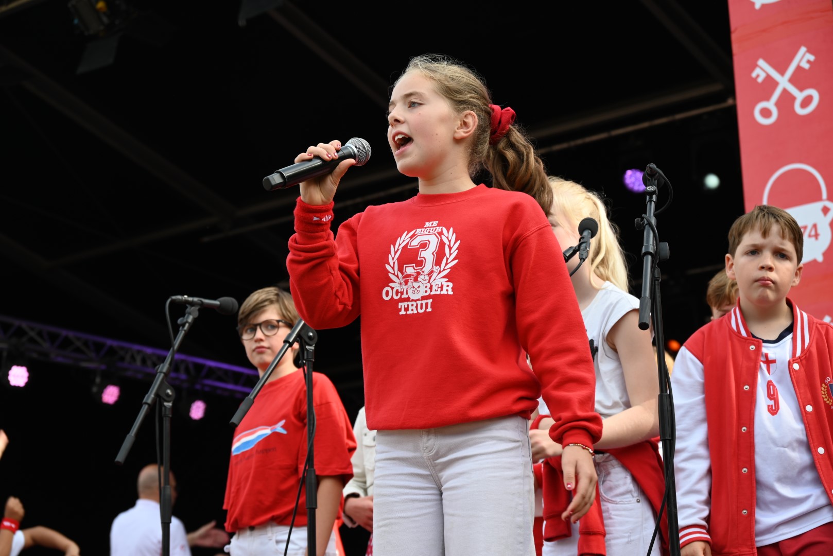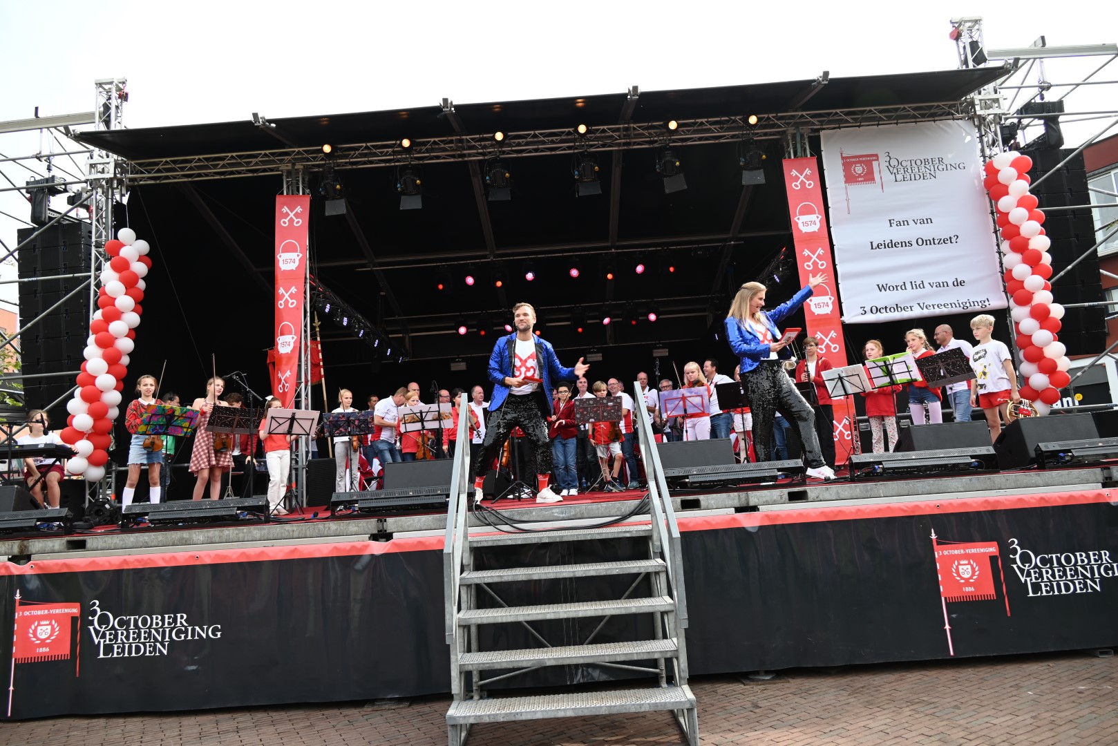 Maandagmiddag kwamen zo’n 3.000 scholieren van de klassen 7 en 8 van basisscholen uit Leiden en de buurgemeenten naar het Garenmarktplein om gezamenlijk de 3 oktoberliedjes te zingen. Op die manier krijgen ze het feest der feesten met de paplepel ingegoten.