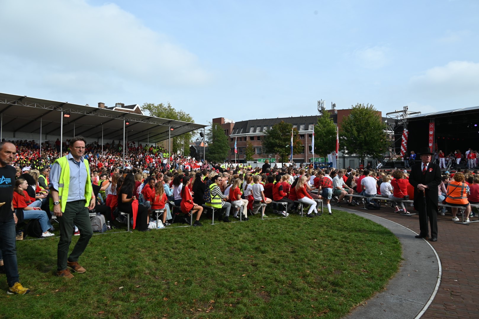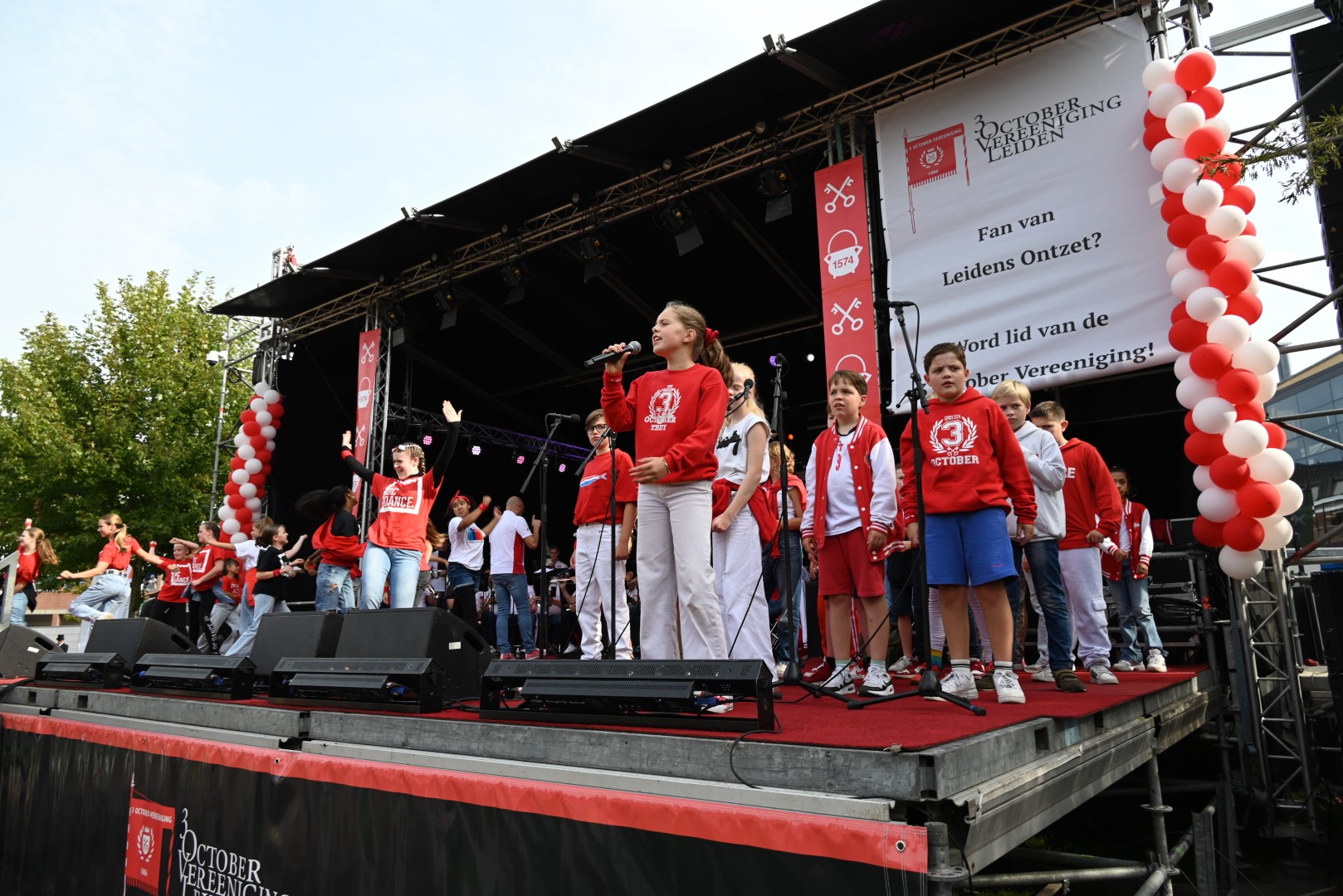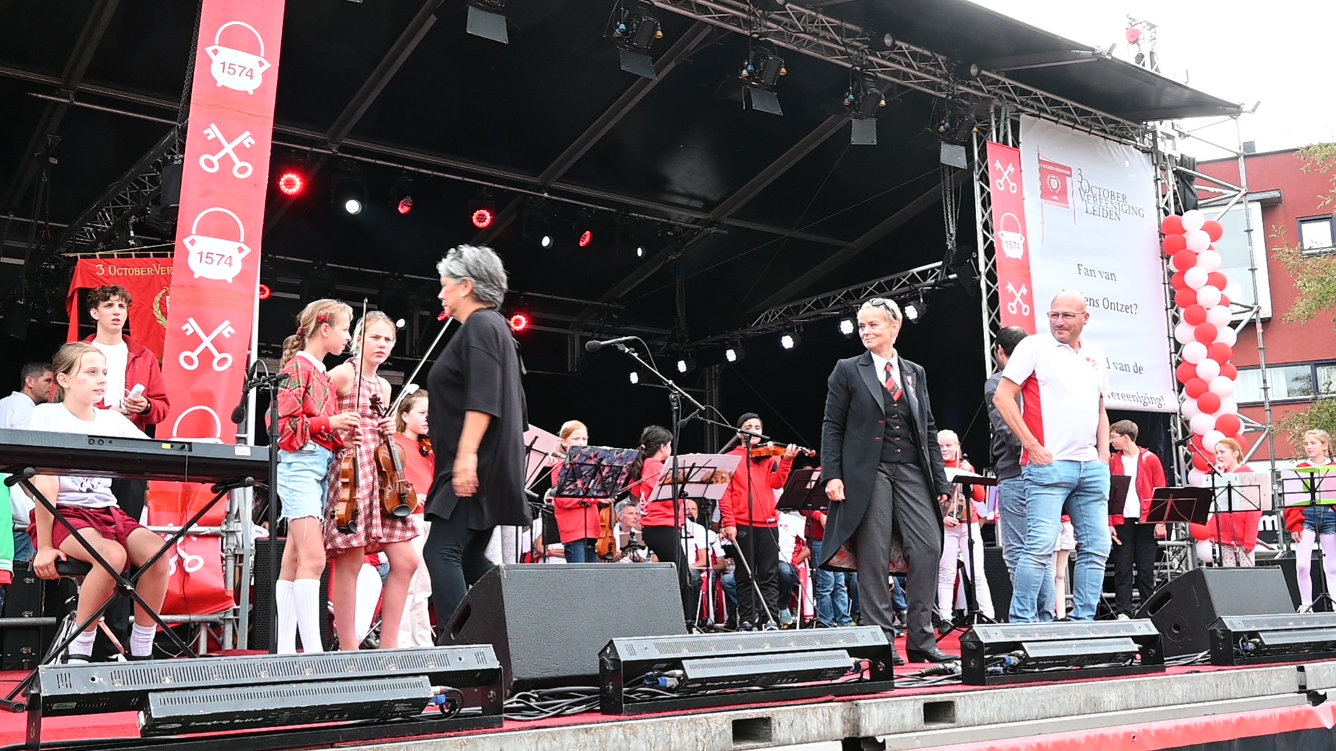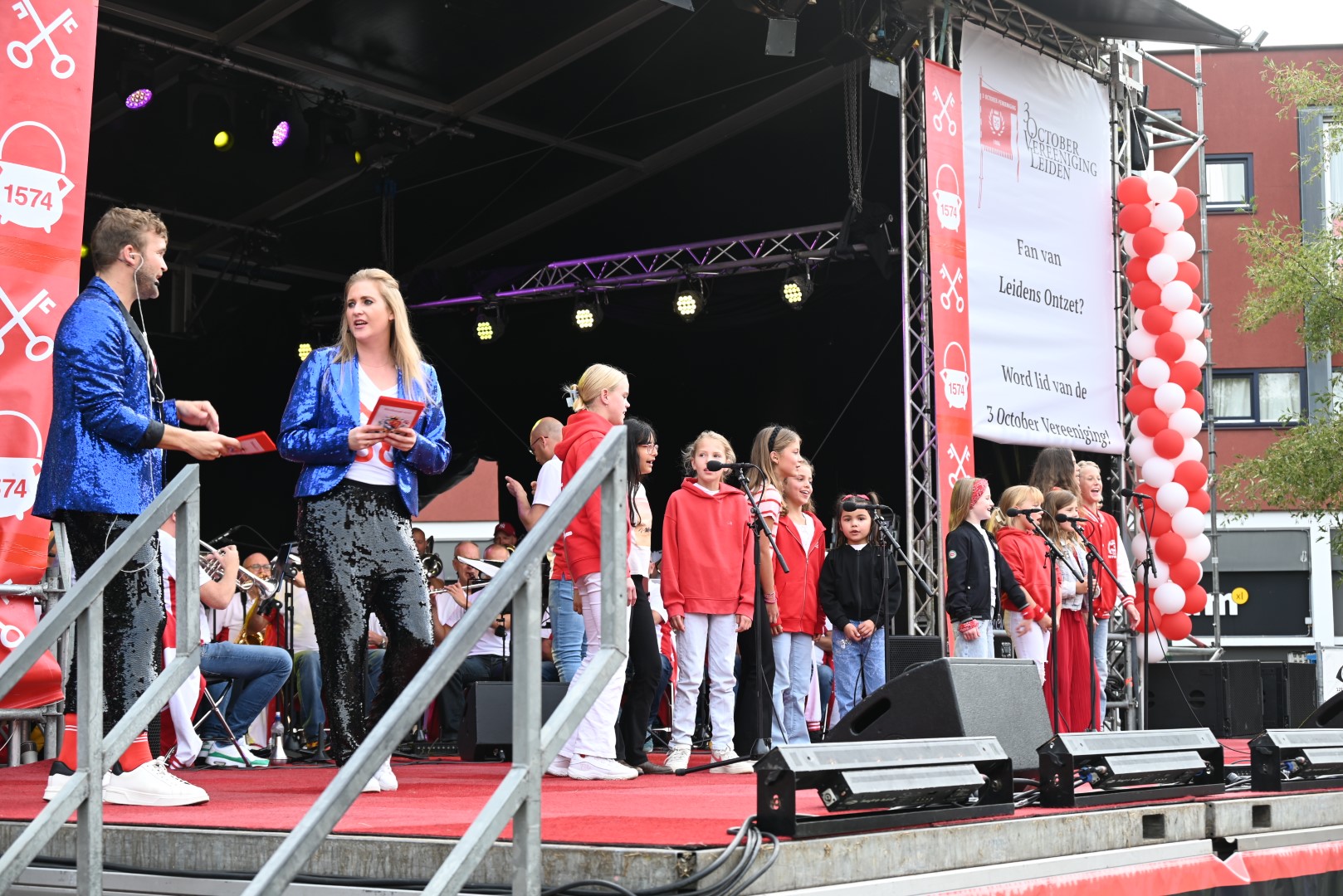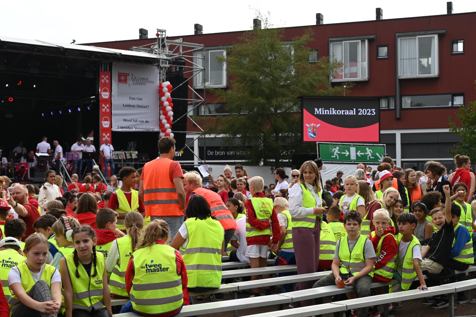 Maandagmiddag kwamen zo’n 3.000 scholieren van de klassen 7 en 8 van basisscholen uit Leiden en de buurgemeenten naar het Garenmarktplein om gezamenlijk de 3 oktoberliedjes te zingen. Op die manier krijgen ze het feest der feesten met de paplepel ingegoten.