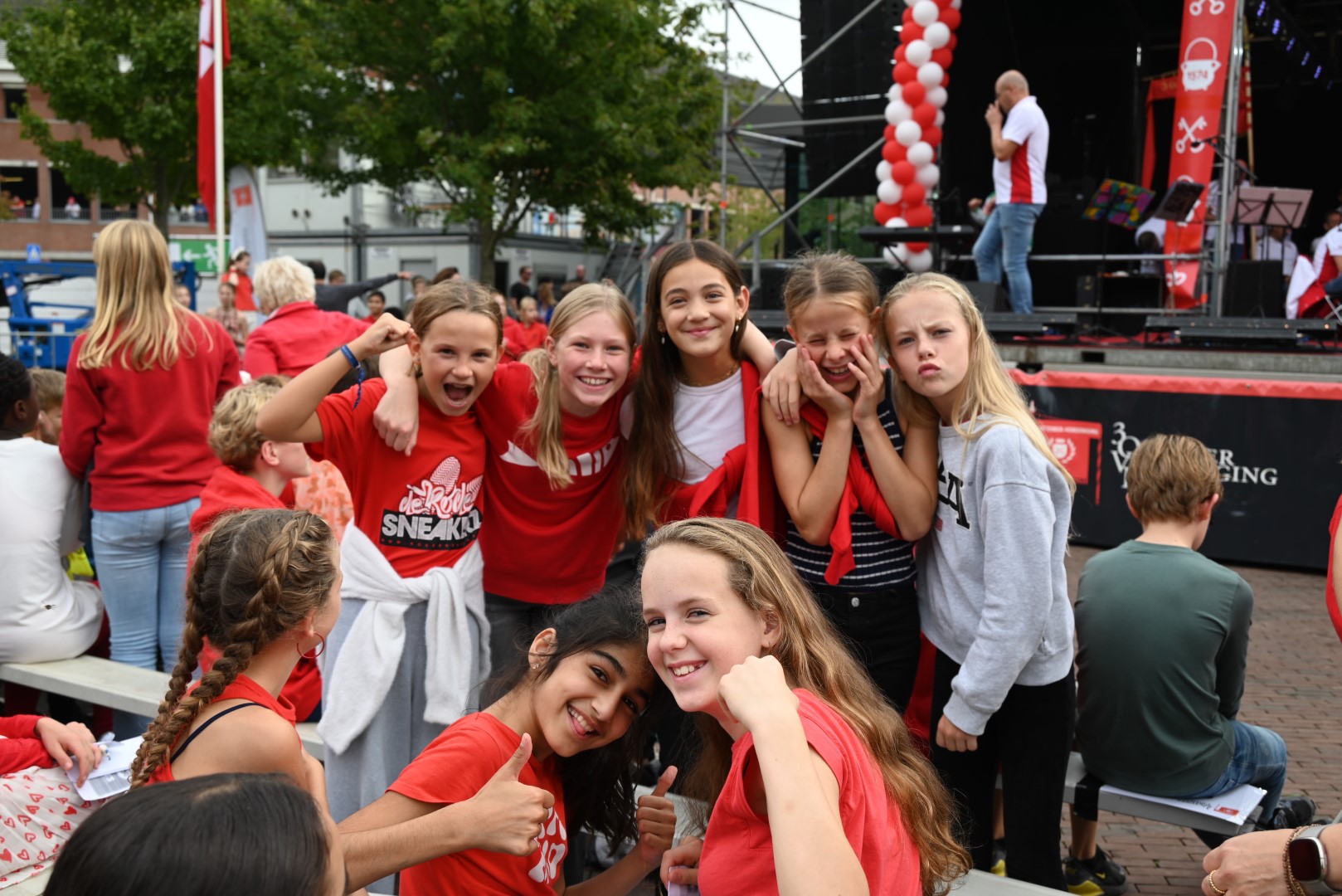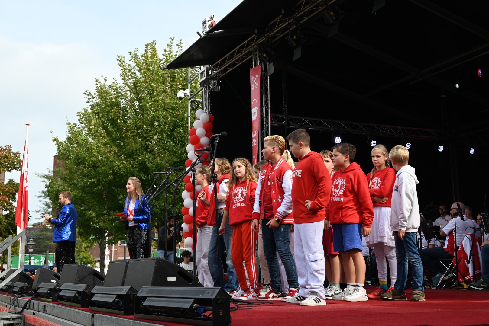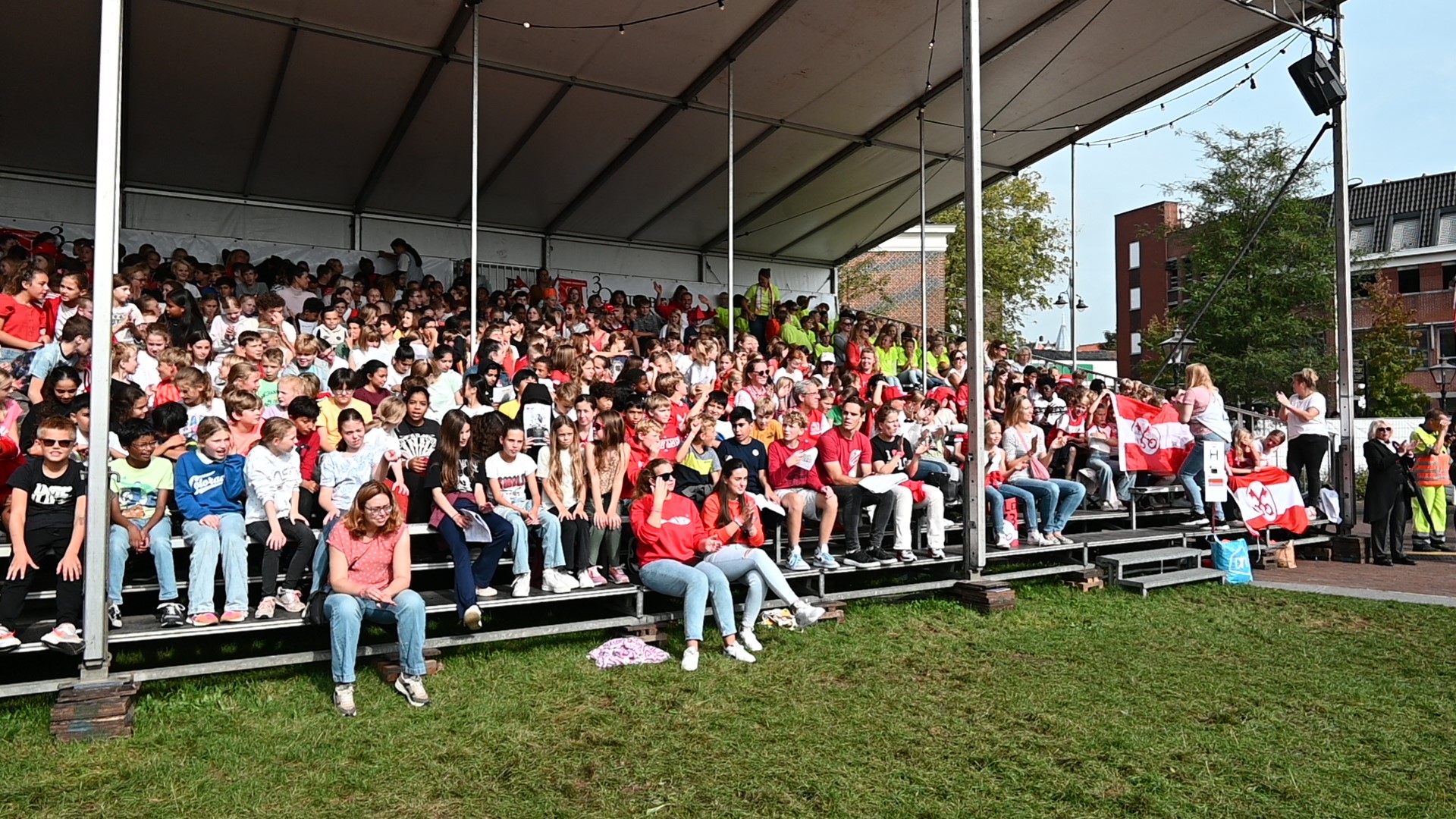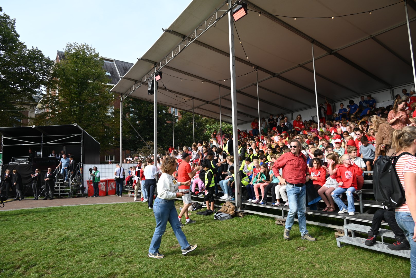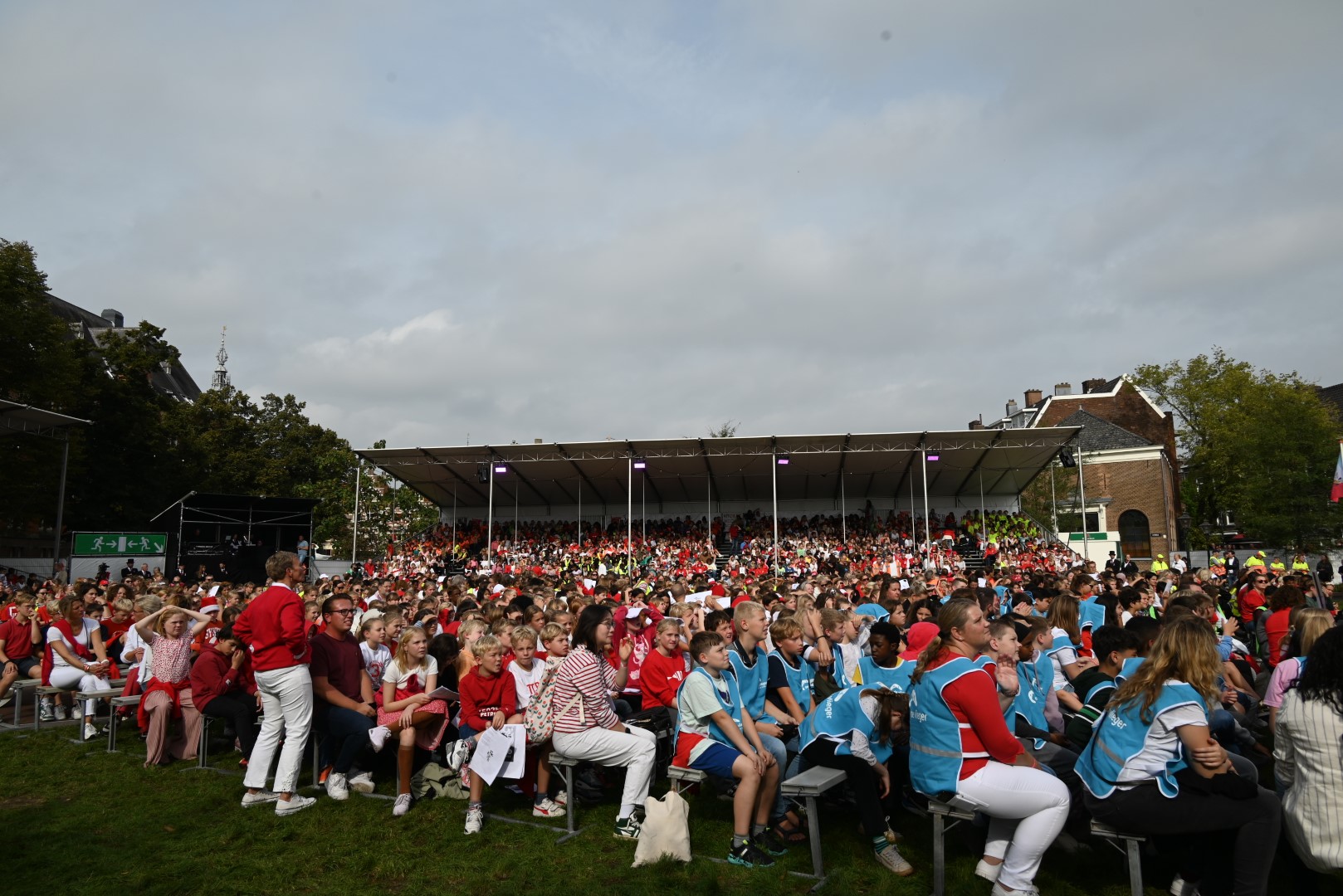 Maandagmiddag kwamen zo’n 3.000 scholieren van de klassen 7 en 8 van basisscholen uit Leiden en de buurgemeenten naar het Garenmarktplein om gezamenlijk de 3 oktoberliedjes te zingen. Op die manier krijgen ze het feest der feesten met de paplepel ingegoten.