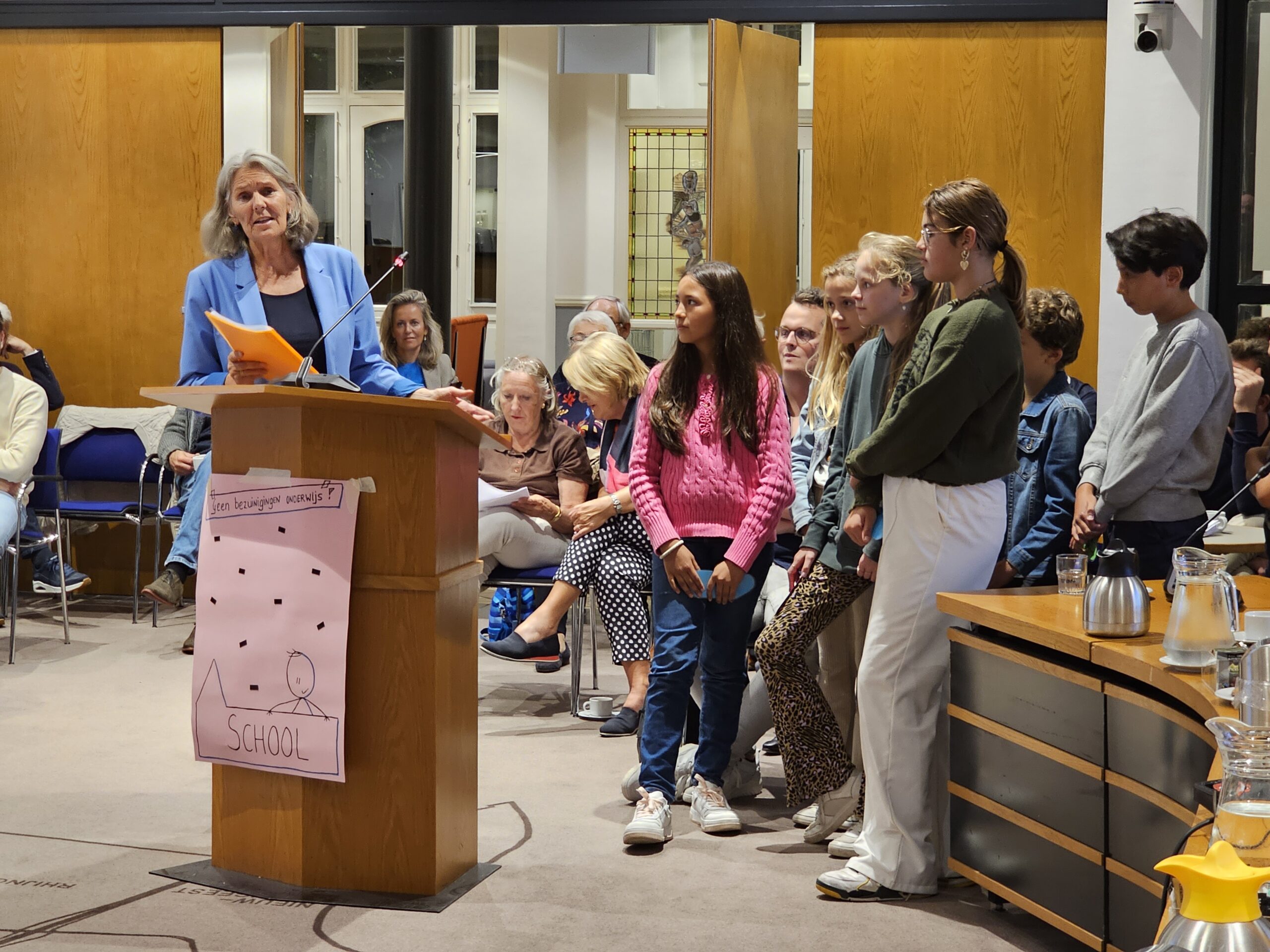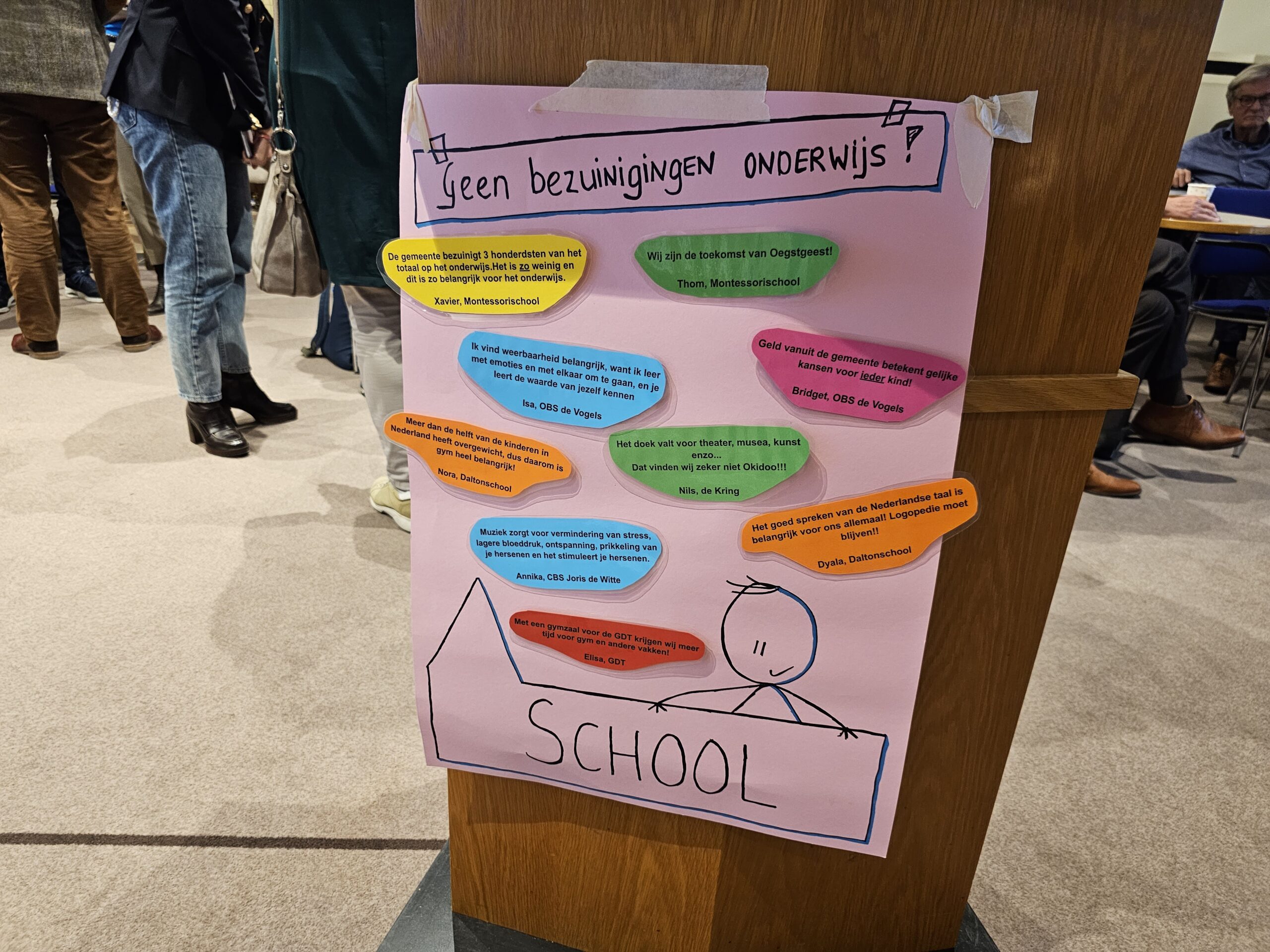 Montessori-directeur Sormani had negen scholieren meegenomen van verschillende basisscholen uit het dorp. Om de beurt vertelden ze de raadsleden waarom ze tegen een bepaalde bezuiniging zijn. Sormani vatte het vervolgens samen: “Het gaat eigenlijk om zo’n klein bedrag op de gemeentebegroting, dat de hele voorgenomen bezuiniging moet worden geschrapt. Doe het niet. Ga niet bezuinigen op kinderen. Zoals een van de kinderen zelf ook zei ‘Wij zijn de toekomst van Oegstgeest’.”