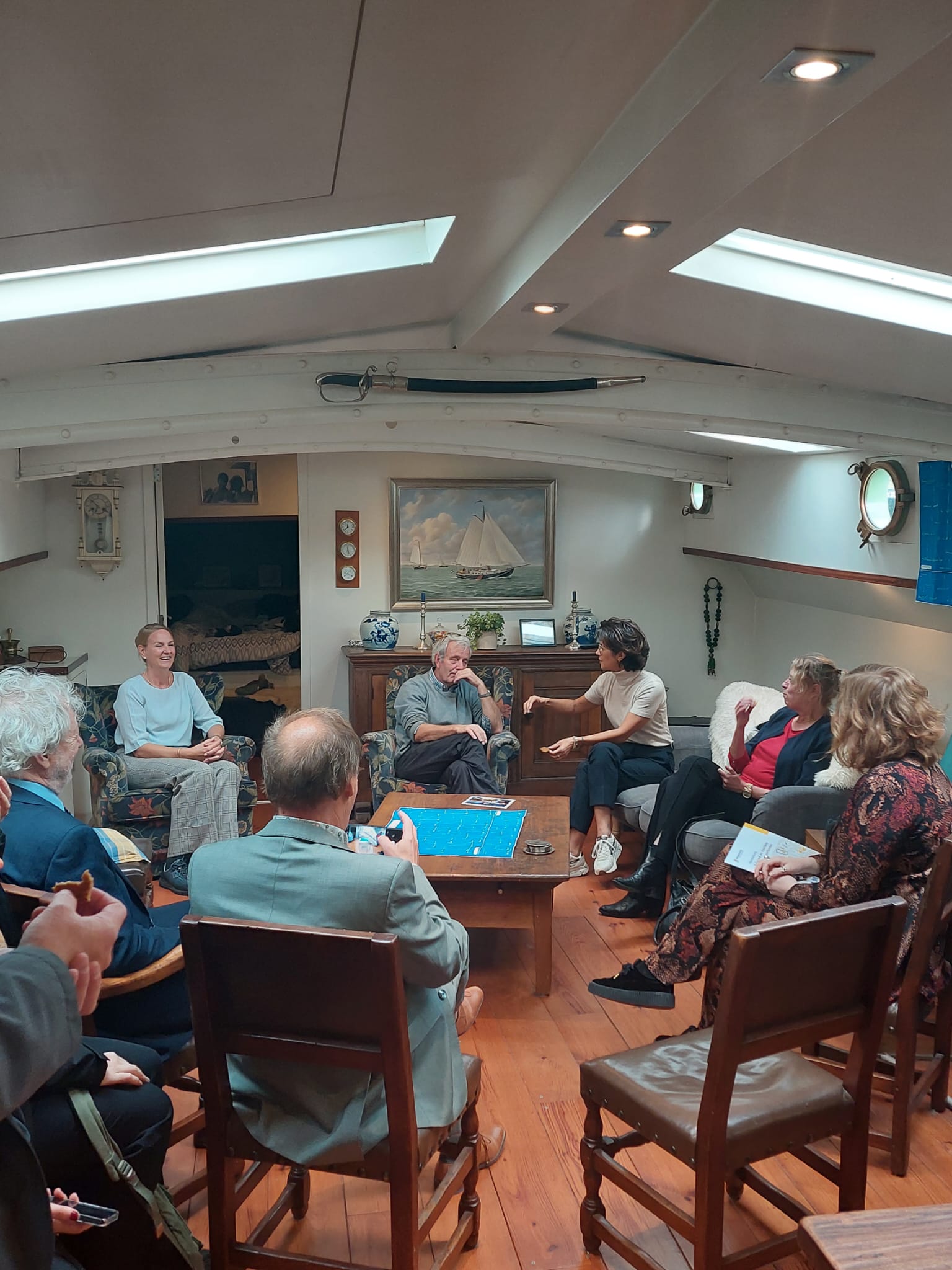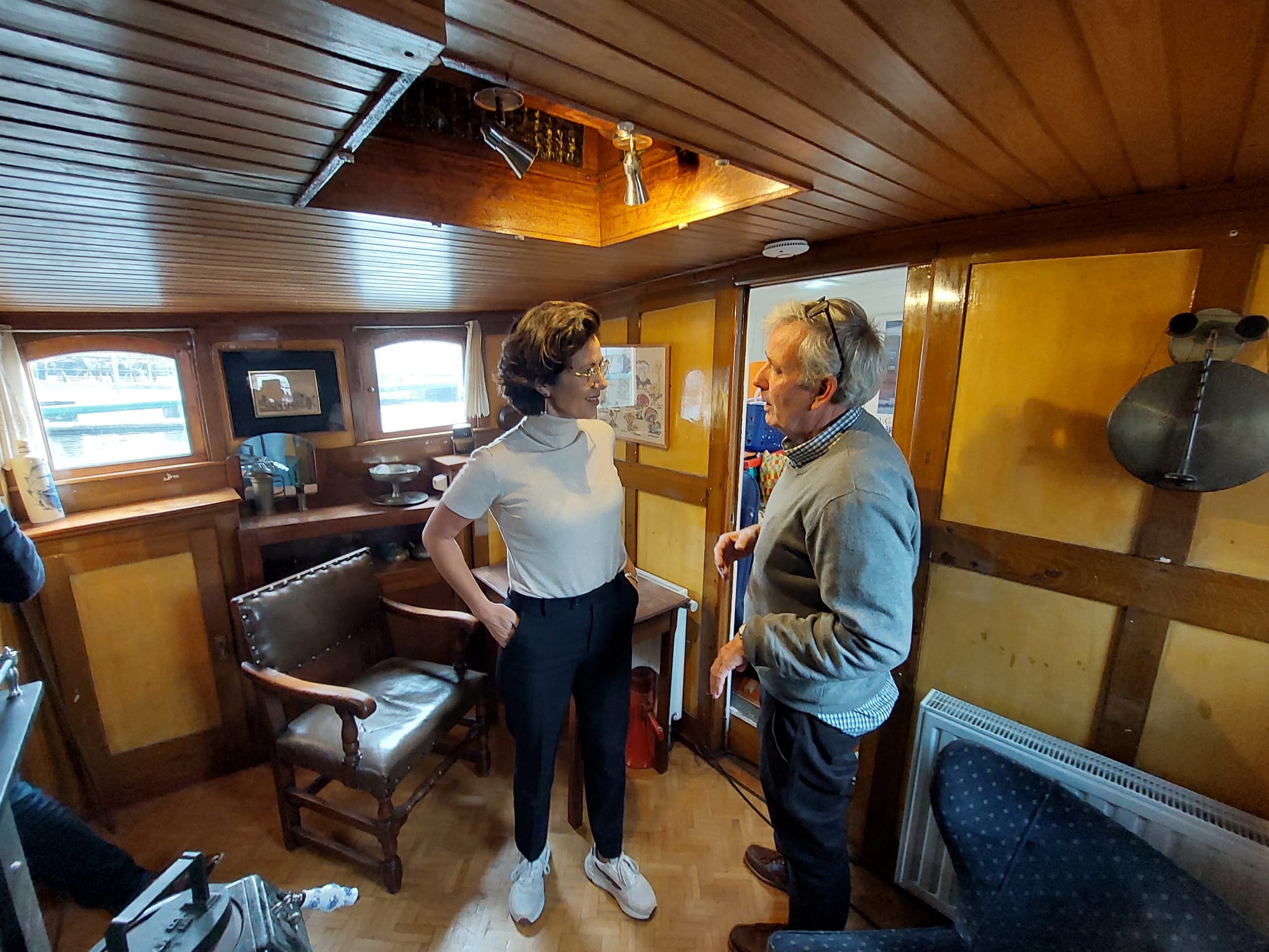 Op het historische woonschip van Ron Zandvliet sprak de staatssecretaris met bewoners en belangenbehartigers van mobiel erfgoed in Leiden. Auto’s, bussen, treinen en schepen hebben te maken met vergaande wet- en regelgeving en bijbehorende kosten. Deze zijn moeilijk te dragen voor eigenaren. Bewoner Ron Zandvliet berekende dat het omzetten van een ouderwetse diesel ‘plop’ motor naar een elektrische motor zomaar 70.000 euro kost. Maar zonder deze aanpassing, mag het schip steden als Amsterdam niet meer in. Het schip loopt gevaar liggend erfgoed te worden.