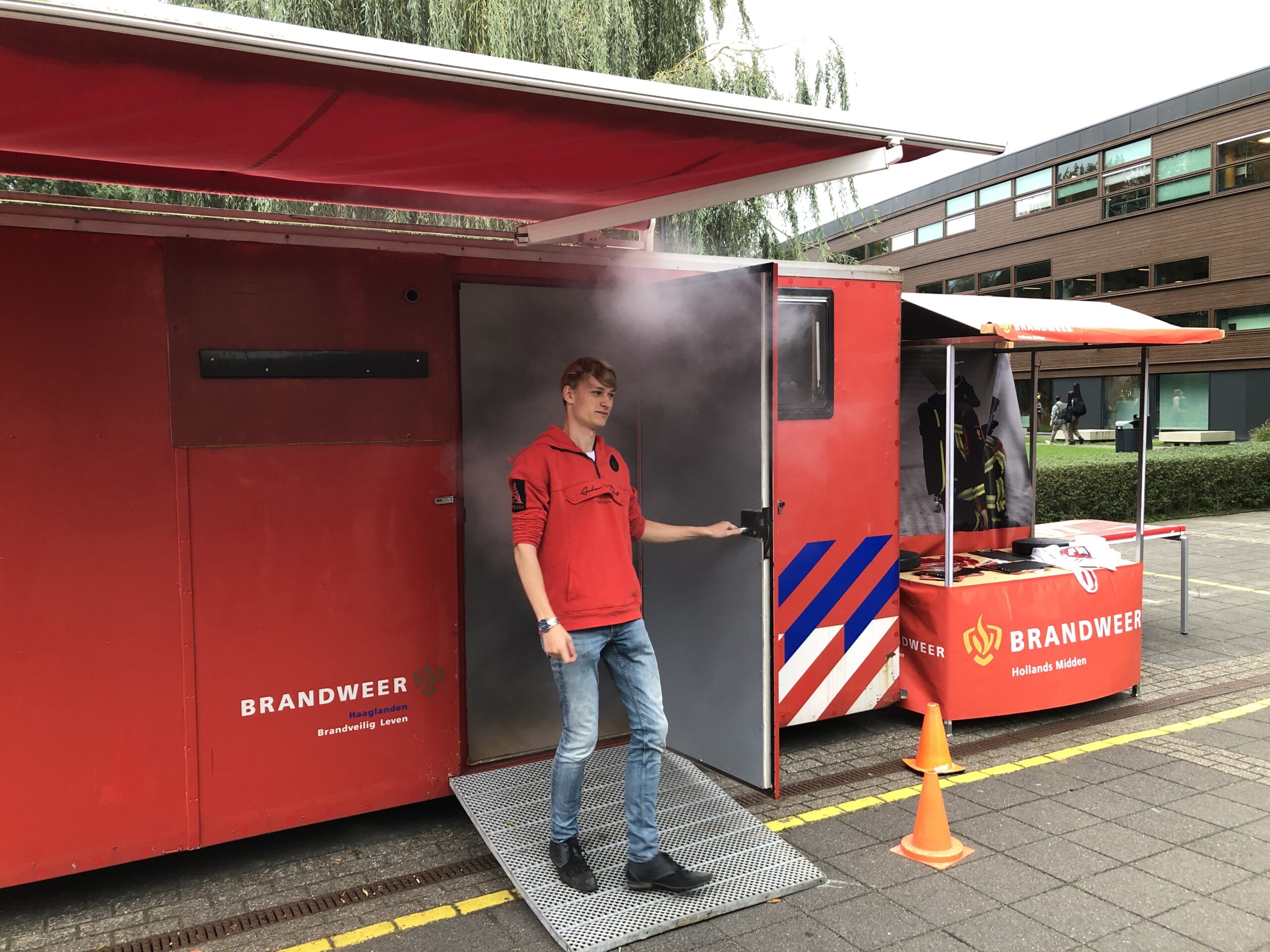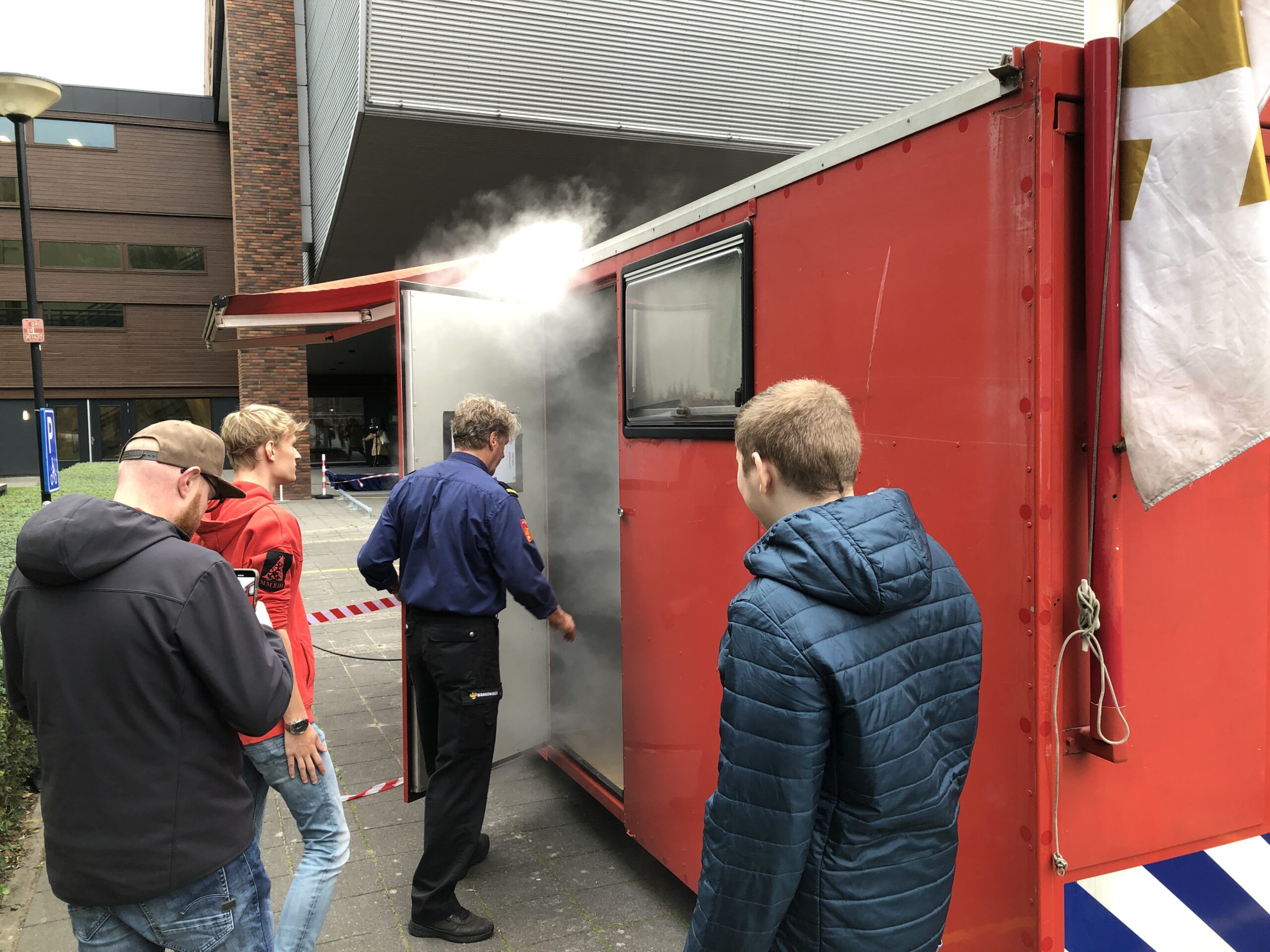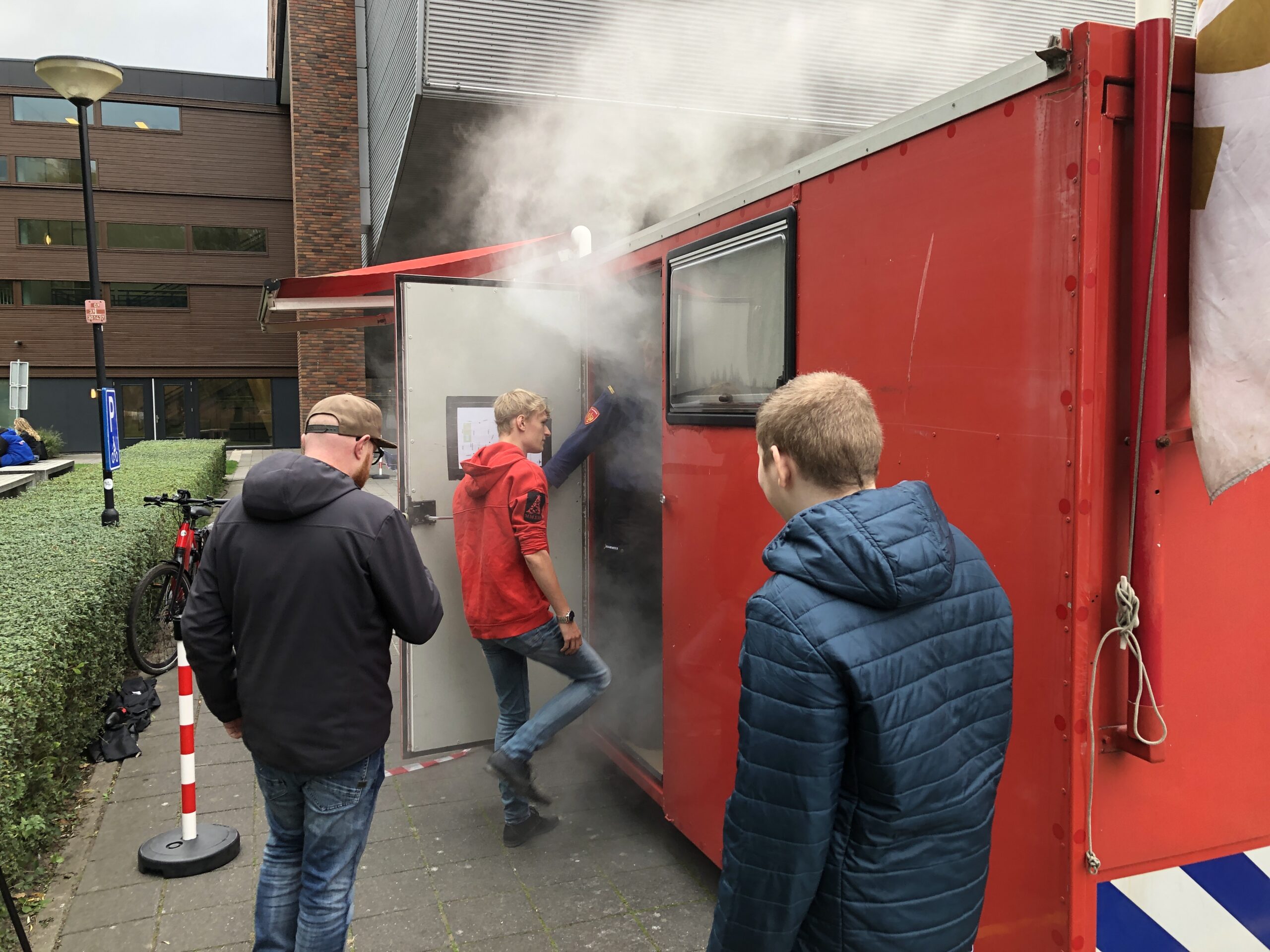 De rookcontainer van de brandweer is voorzien van licht- en geluidseffecten en staat, zoals de naam al doet vermoeden, vol met (ongevaarlijke) rook. “We willen de studenten natuurlijk niet in gevaar brengen. Dit is niet dezelfde rook als bij een echte brand ontstaat, we gebruiken gewoon een rookmachine. Maar het effect voor het zicht van de studenten is hetzelfde. Je ziet bijna niets”, legt Teun Sollie van de brandweer Hollands Midden uit.