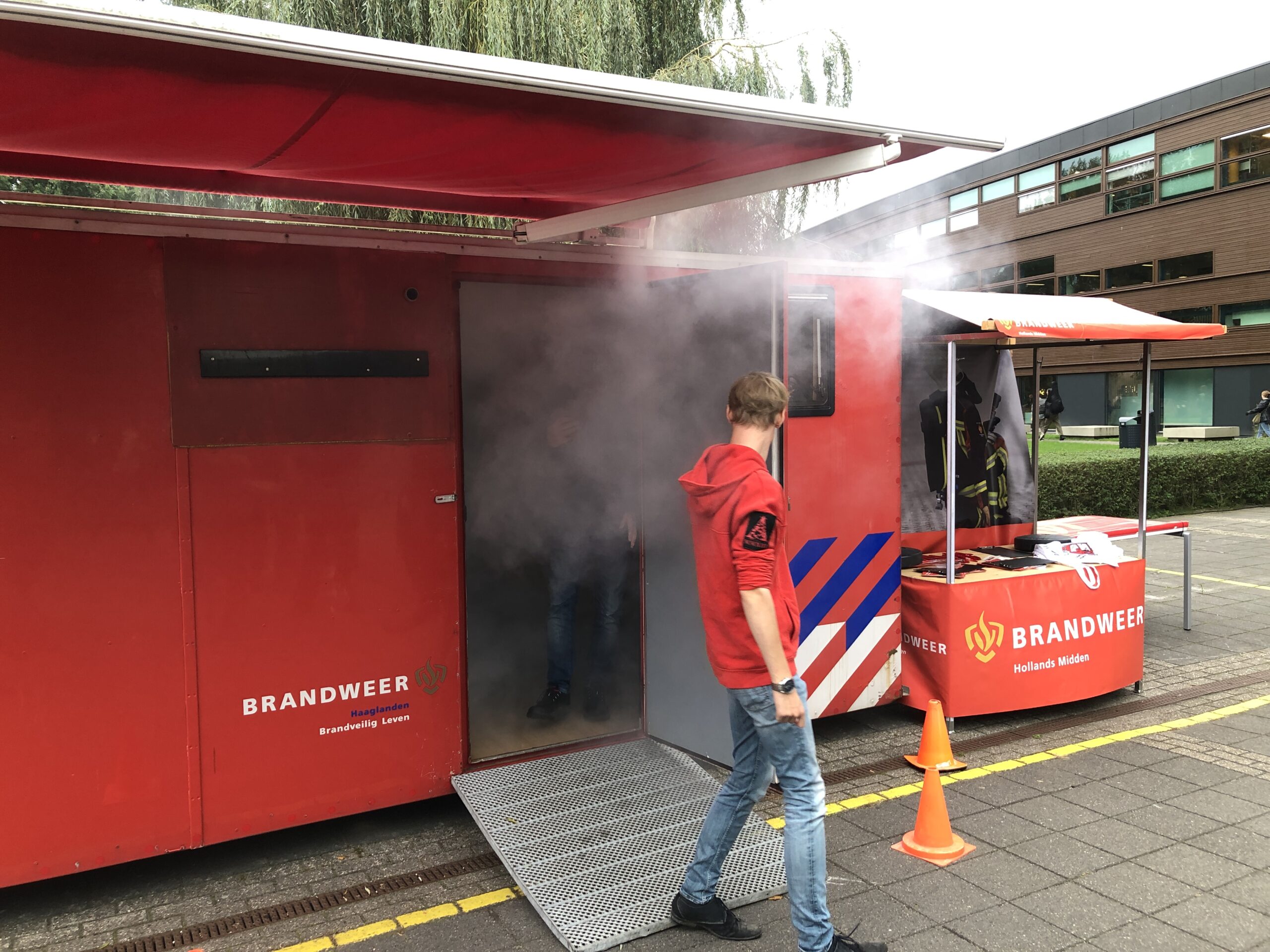 Wat moet je doen als je studentenkamer vol rook staat omdat er ergens in huis brand is? Op die vraag kregen studenten van de Hogeschool Leiden deze week antwoord in een speciale praktijkles. Ze mogen proberen om een studentenwoning, die de brandweer voor de gelegenheid heeft nagebouwd in een container op het schoolplein, zo snel mogelijk veilig te verlaten.
