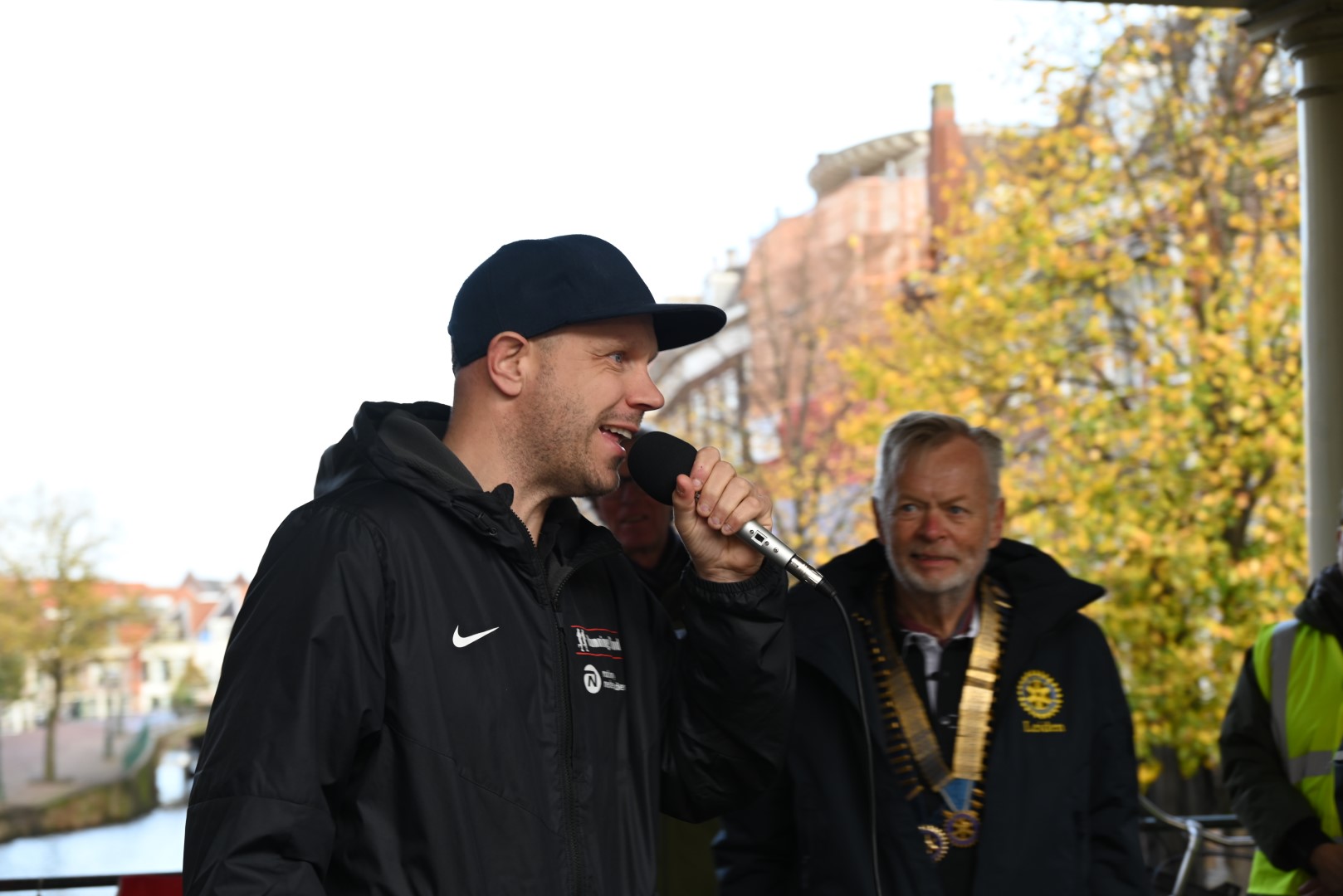 Zondagochtend werd de tocht voortgezet naar Leiden. Op de Koornbrug, in het centrum van de stad, zette de Leidse tak van de Rotary zich in voor blinden en slechtzienden. Na een rap van de zelf slechtziende Martijn Rijsenbrij, beter bekend onder zijn artiestenaam RijstErbij, stapten de hardlopers van RunningBlind op de tandem voor een fietstocht naar de Rotary in Voorschoten.