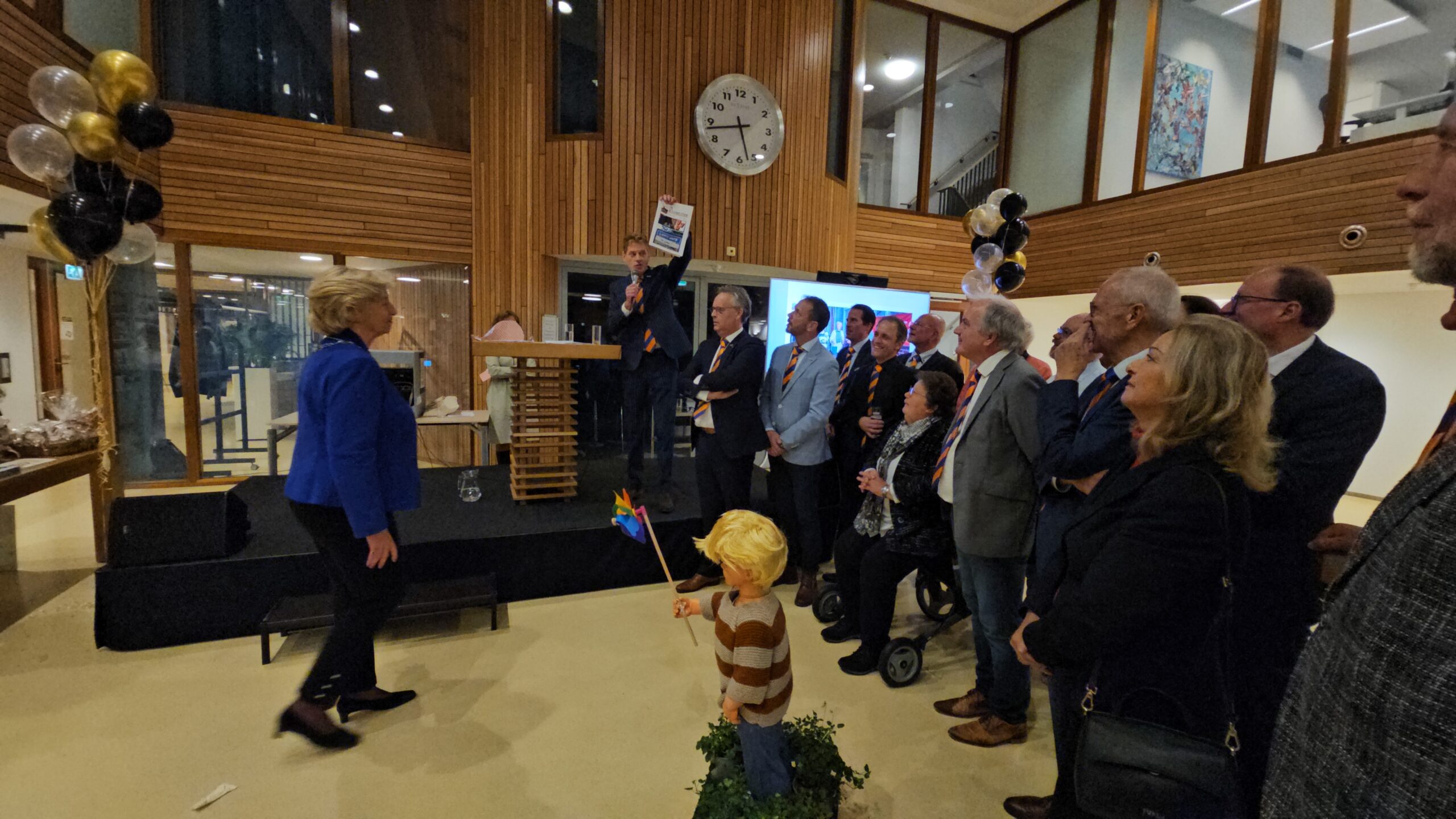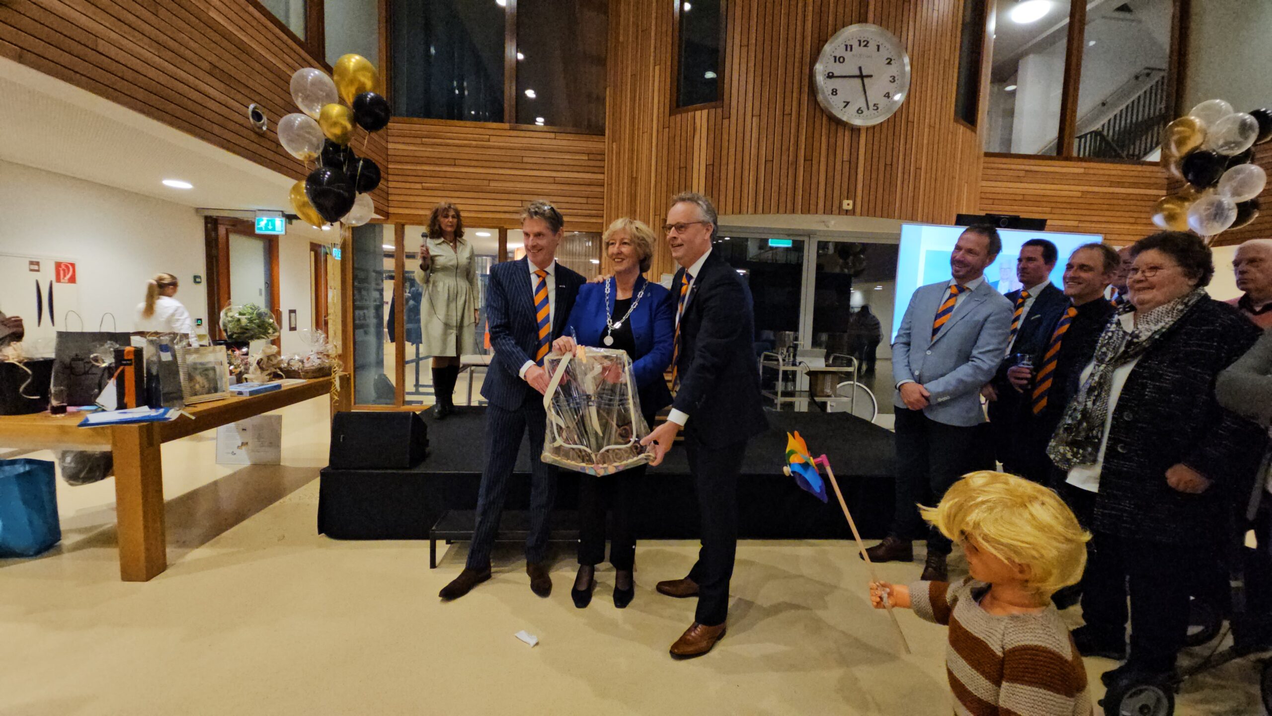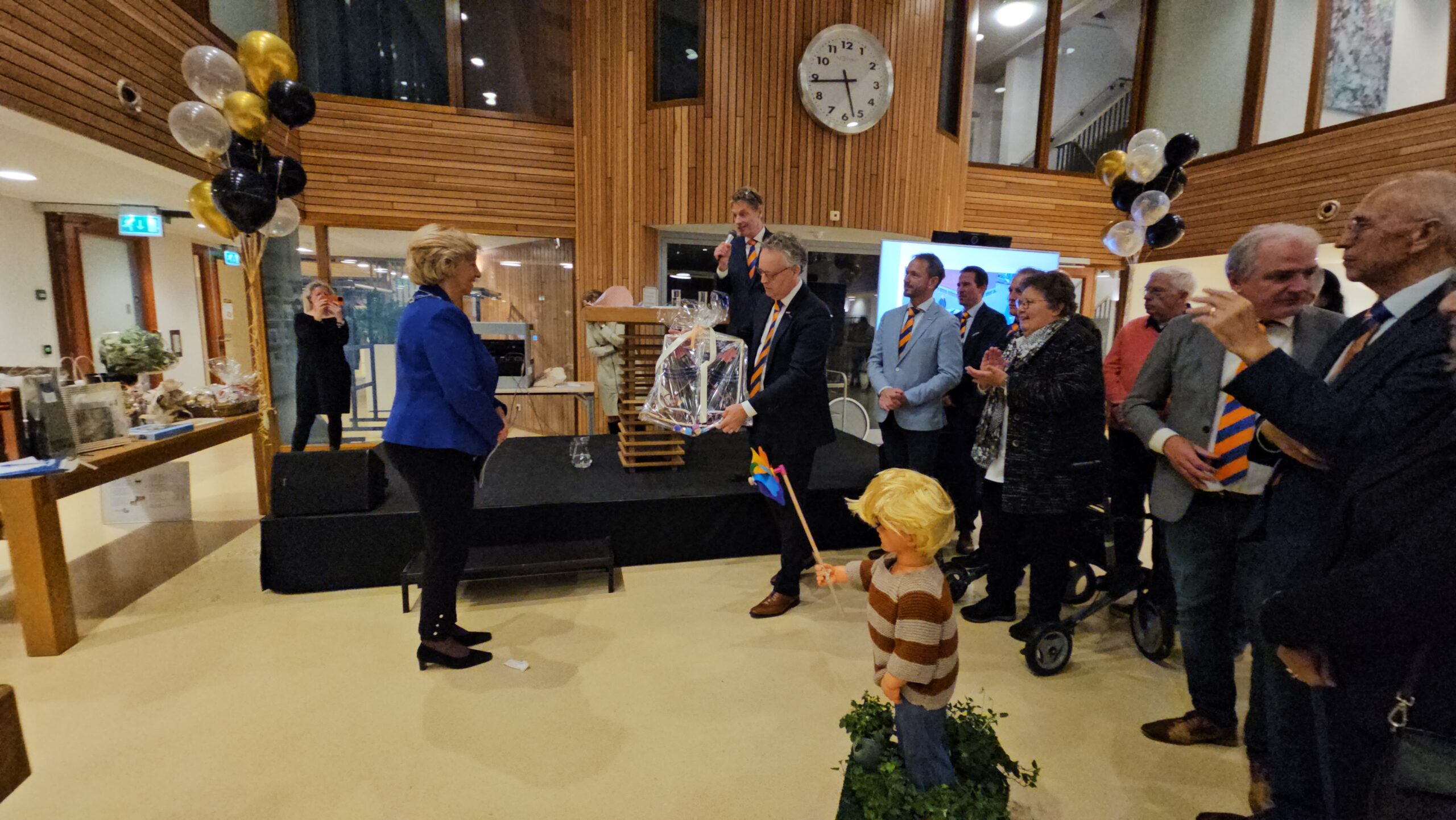 De afsluiting werd verzorgd door een groep Leiderdorpse VVD’ers met wie Driessen, zelf ook van VVD-huize, de afgelopen twaalf jaar te maken kreeg. De liberale Leiderdorpers hadden maar liefst drie cadeaus voor Laila Driessen. Een replica van een ‘beroemd Leiderdorps kunstwerk’, aldus oud-wethouder Willem Joosten. “De stier lukte niet.” Cadeau twee was een speciale uitgave van de Blauwe Stier. Een blaadje dat de VVD nog weleens wil uitgeven rond de verkiezingen. Dit keer stond het vol herinneringen en foto’s. Als derde cadeau kreeg ze van haar partijgenoten het Leiderdorpse gemeentewapen om aan haar woning in Alphen aan den Rijn te bevestigen.