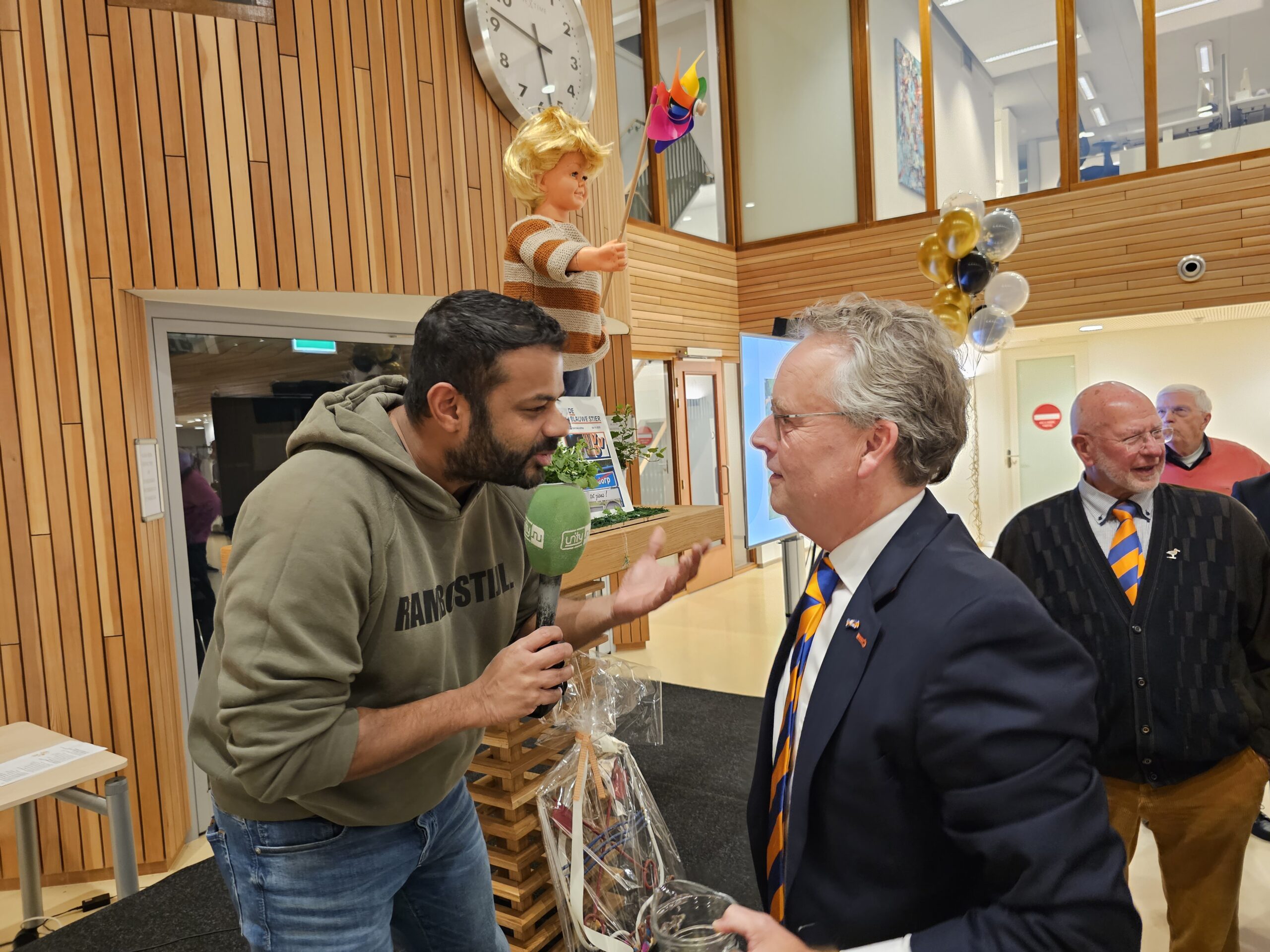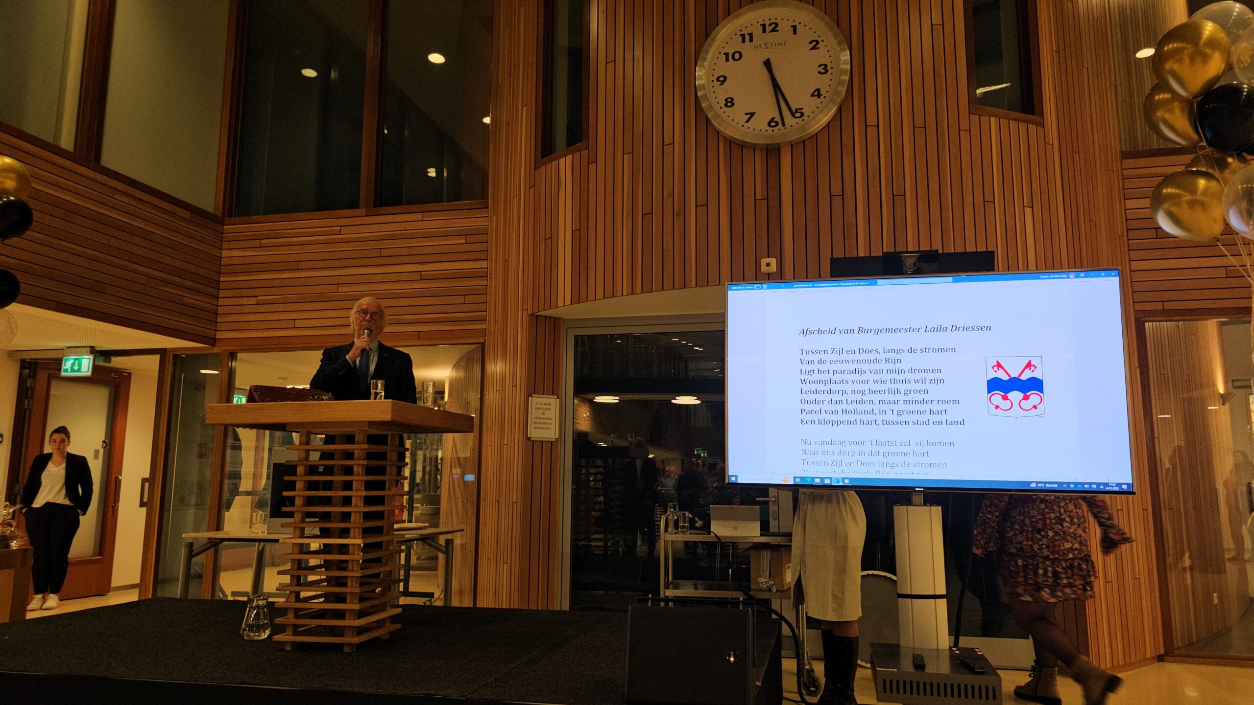 Als klap op de vuurpijl werd de burgemeester toegezongen door LPL-raadslid en voormalig minikoraalburgemeester Eric Filemon die niet alleen het Leidse volkslied heeft geschreven, maar ook dat van Leiderdorp. Vandaag bracht hij een speciale versie ten gehore, waarbij Driessen het middelpunt vormde.