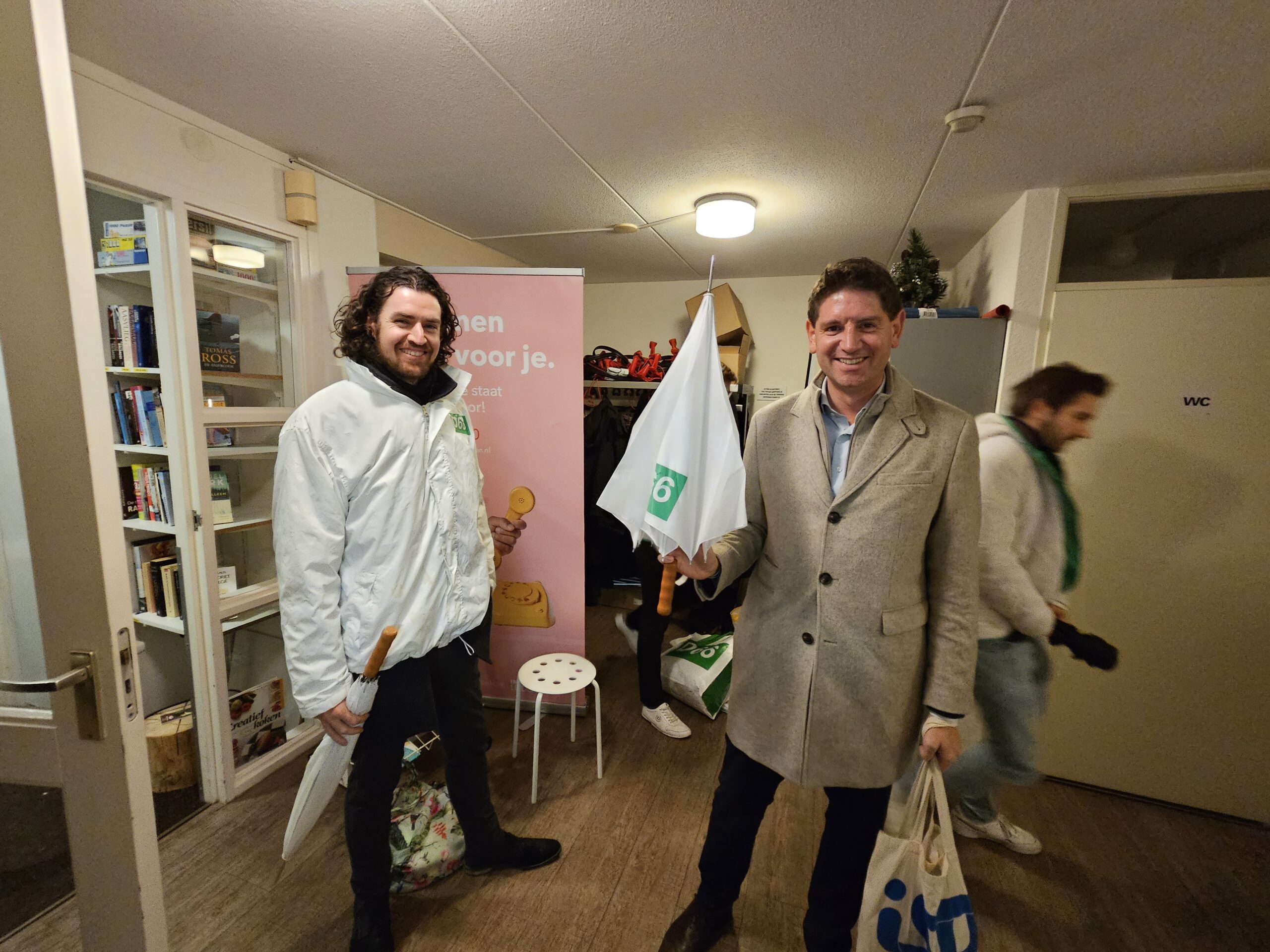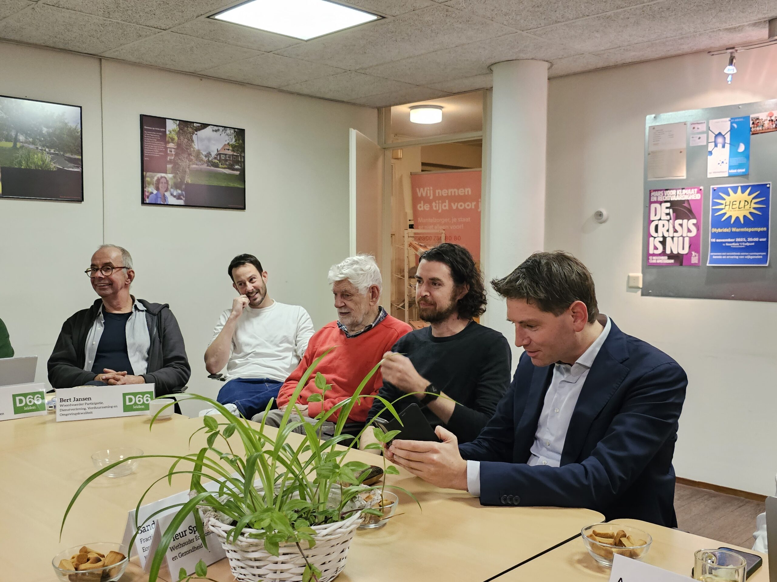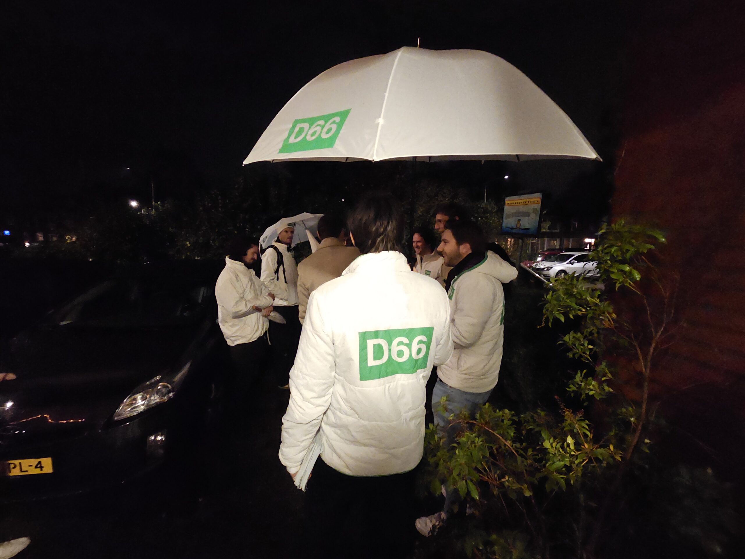 In buurthuis ‘t Trefpunt aan het Professorenpad schoven dit keer niet alleen buurtbewoners aan, maar omdat het campagnetijd is, ook Tweede Kamerlid Jan Paternotte. De nummer 2 van D66 heeft in de wijk gewoond en komt er ook nu nog vaak. “Mijn dochter zit hier op school.” Daarom kwam hij uit eigen ervaring ook nog met een suggestie voor zijn lokale partijgenoten. “Een flinke schoolzone waar niet zoveel auto’s rijden zou wel fijn zijn.” Na de vergadering ging Paternotte gewapend met paraplu in de wijk langs de deuren om in gesprek te gaan met bewoners.