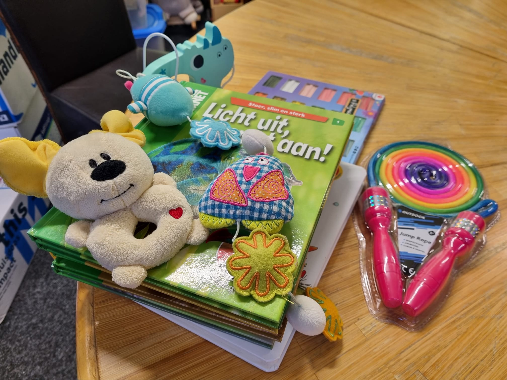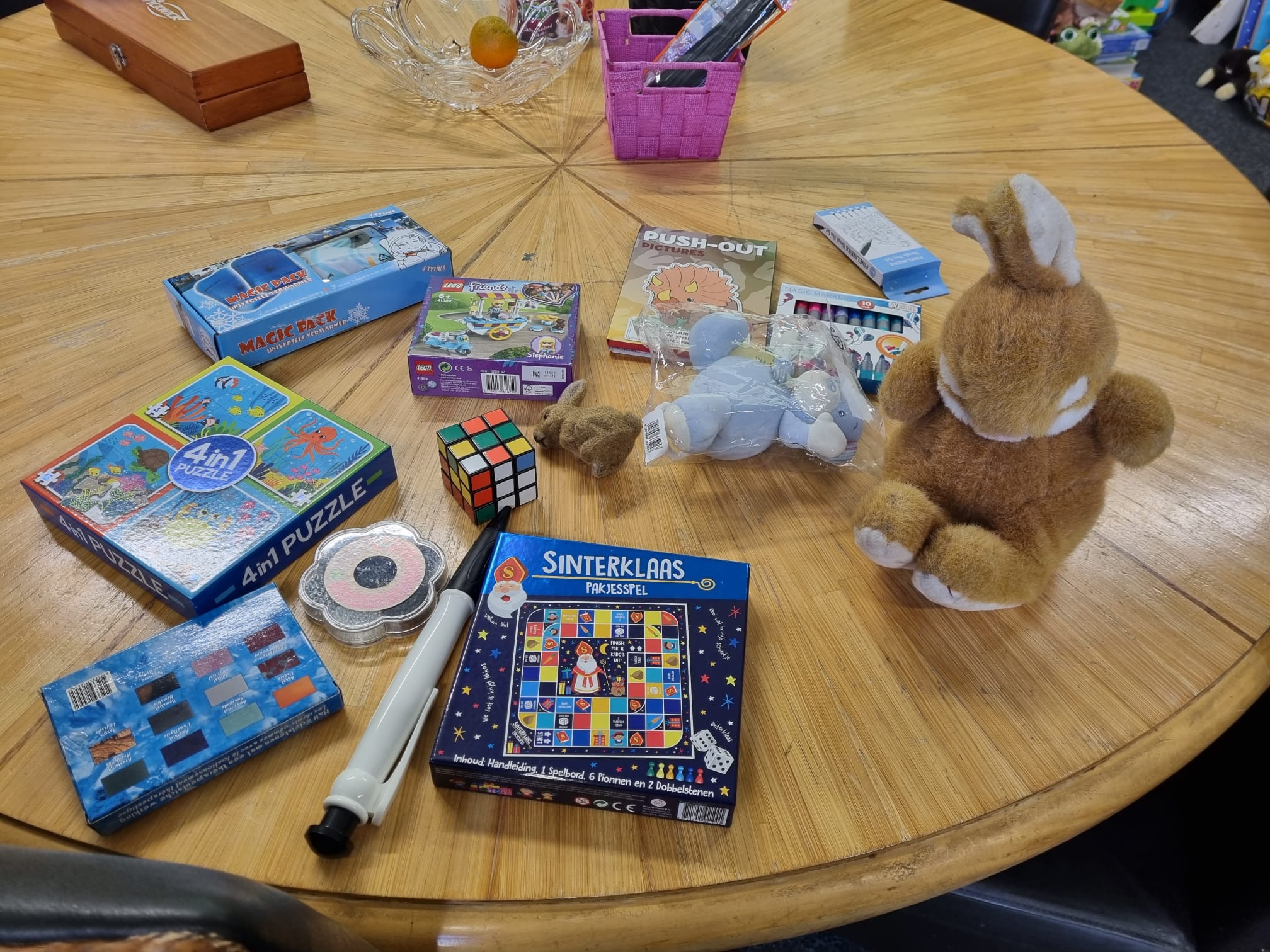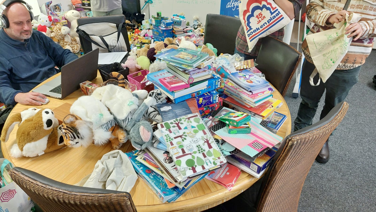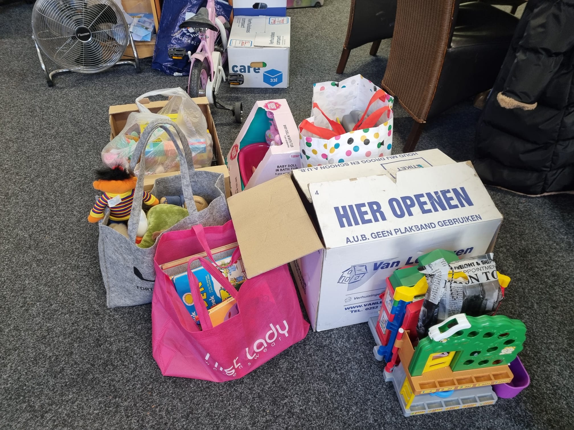 Inge en Margo brachten een berg cadeautjes mee. Na telling 113 stuks om precies te zijn. “We waren net thuis alles aan het uitzoeken. Wat er niet meer als nieuw uitzag is naar de kringloop. Maar de goede dingen zijn hierheen, dit is veel leuker.”