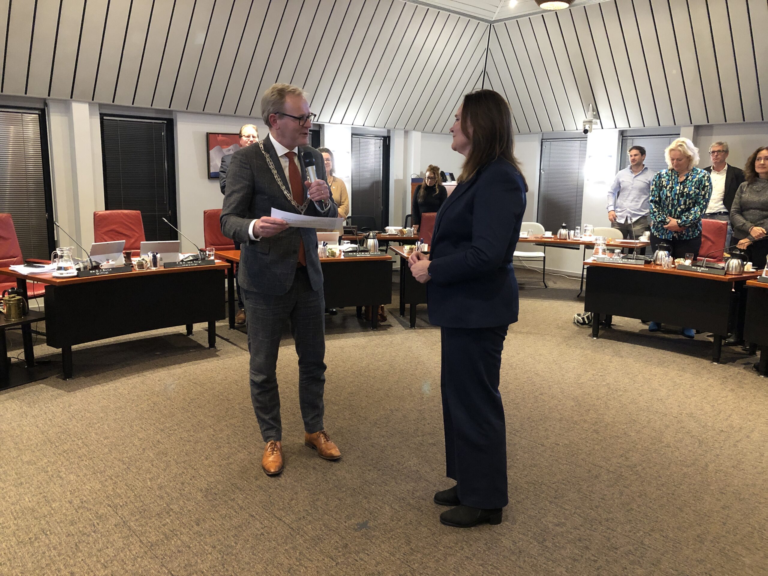 Verslaggever Robbert Beurse feliciteert wethouder Beekhuizen met haar benoeming.