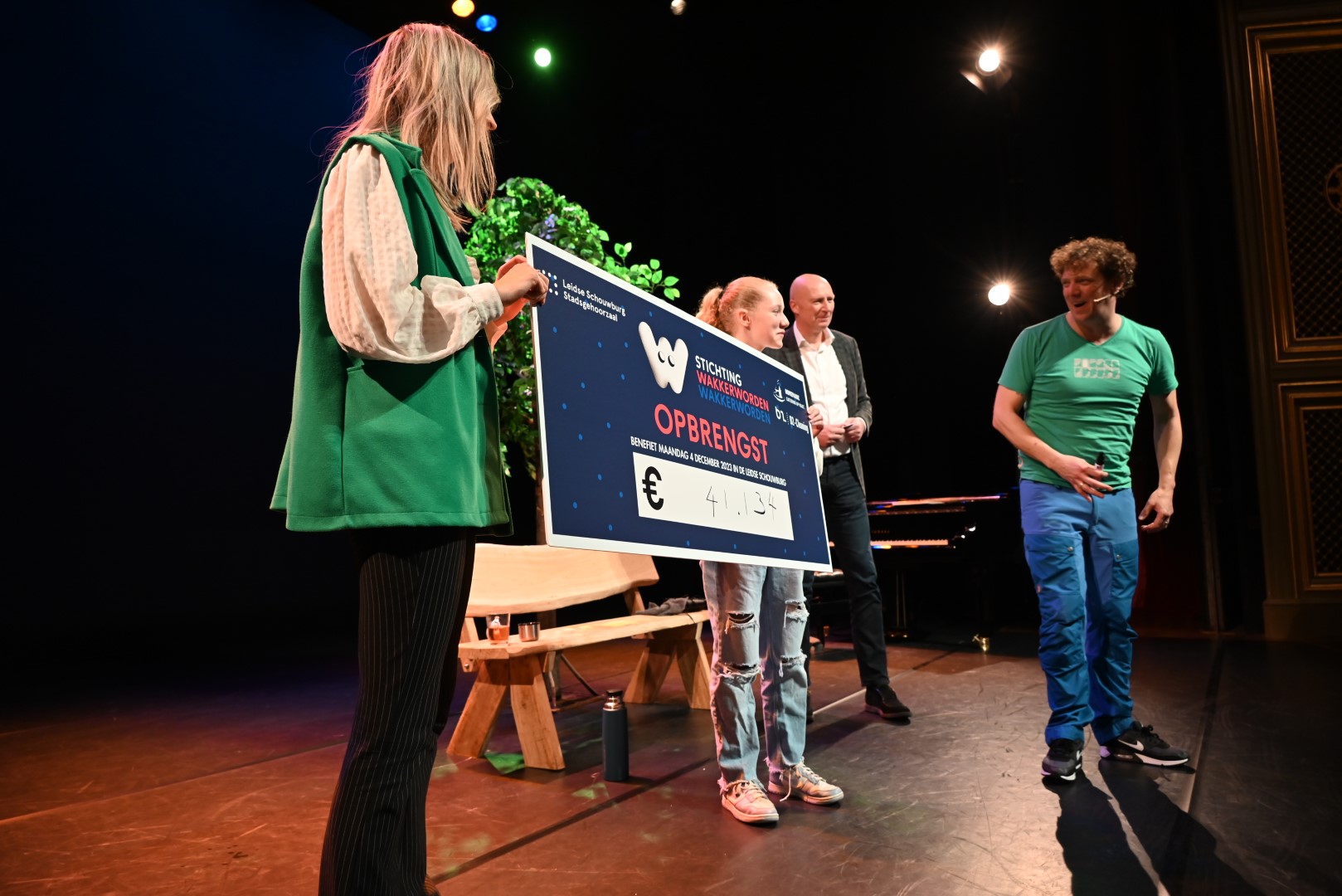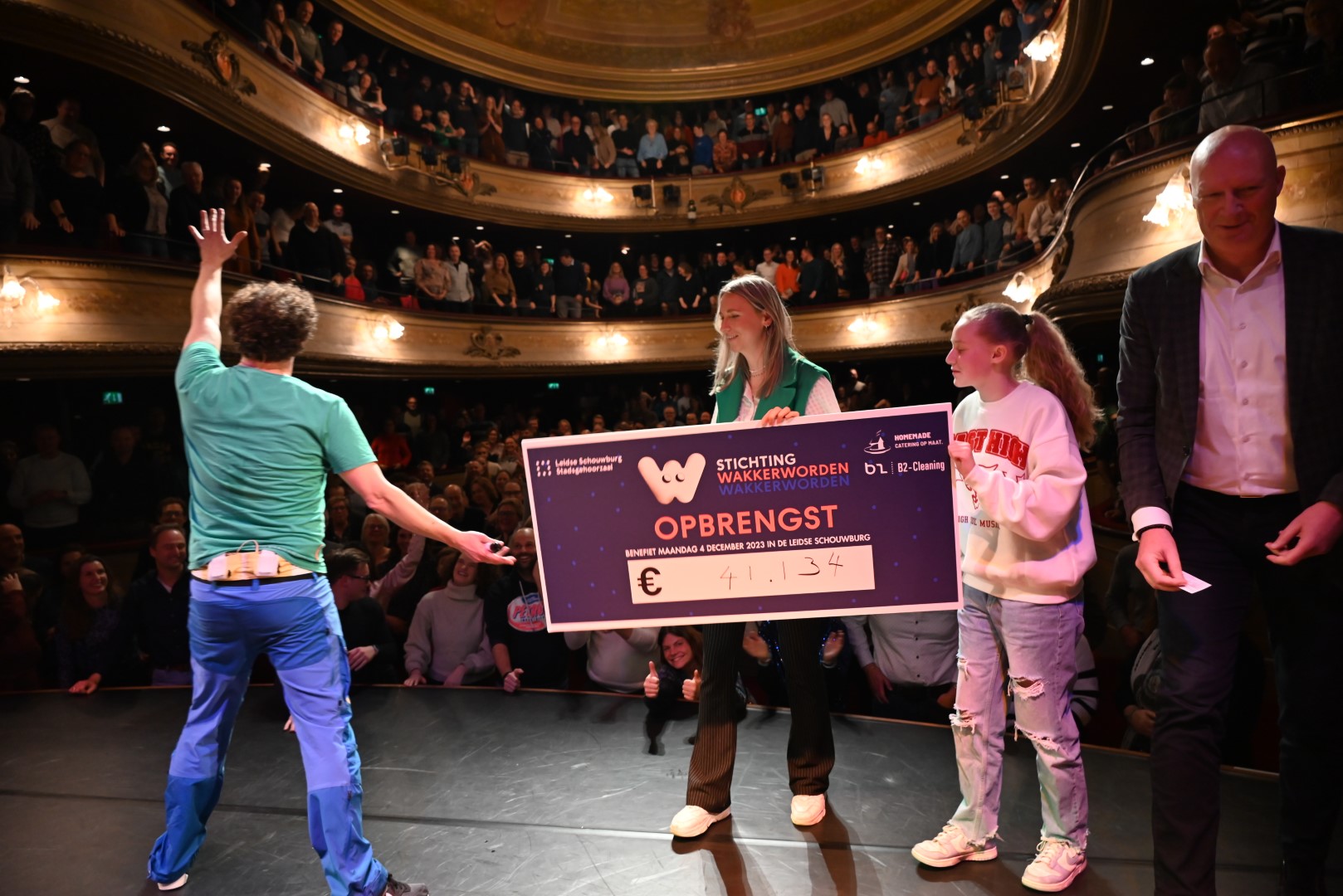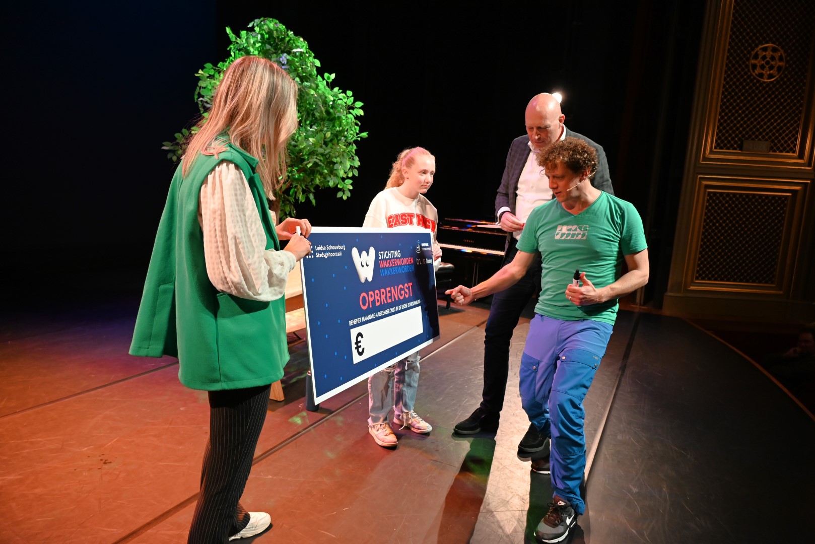 Na afloop van de voorstelling kwamen Sandra Pipping en Limoni Myjer, ambassadrices van de Stichting ‘Wakker Worden Wakker Worden‘, met een cheque het podium op. Die was op dat moment nog blanco en de cabaretier mocht zelf het bedrag invullen. Het totaalbedrag was 41.134 euro.