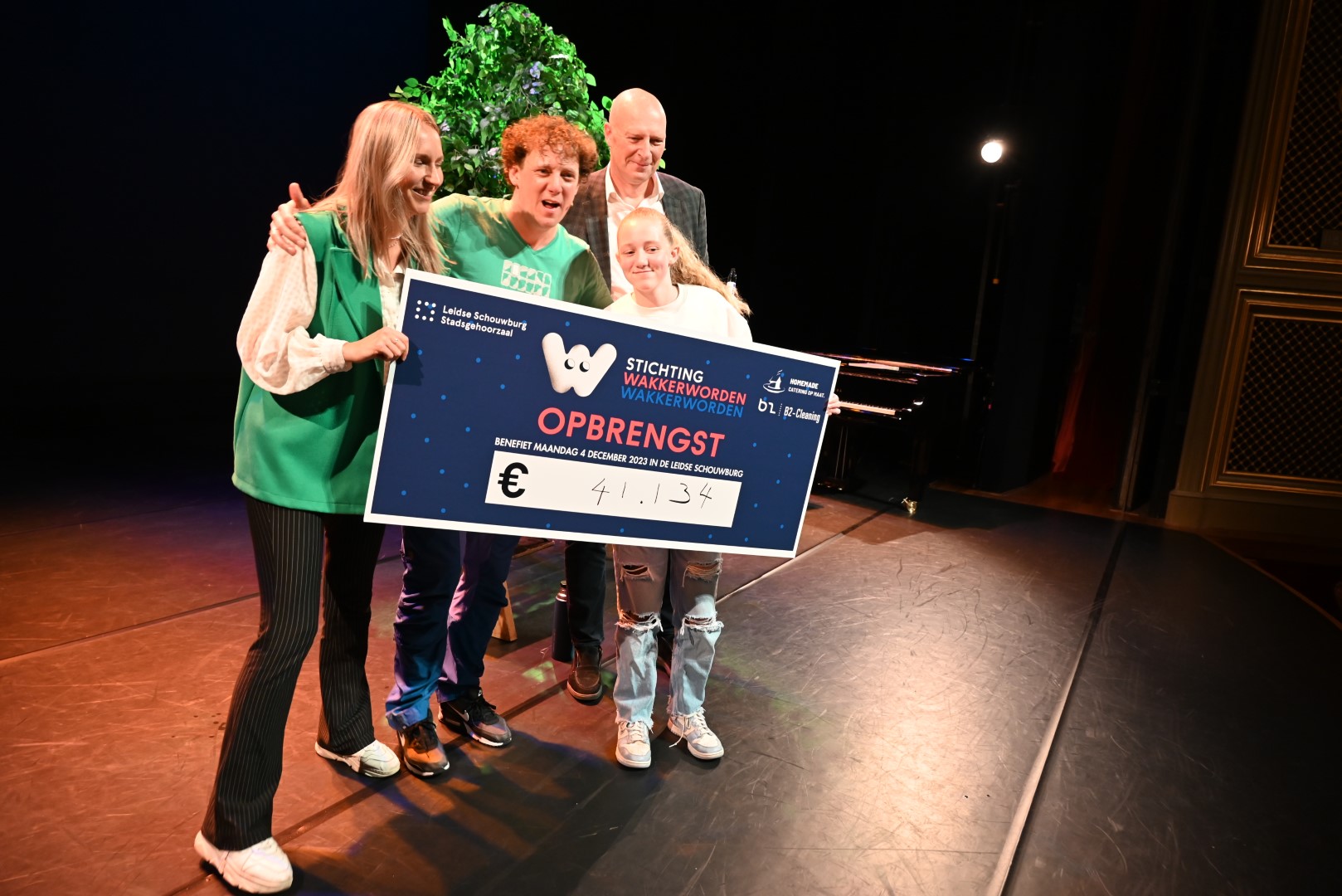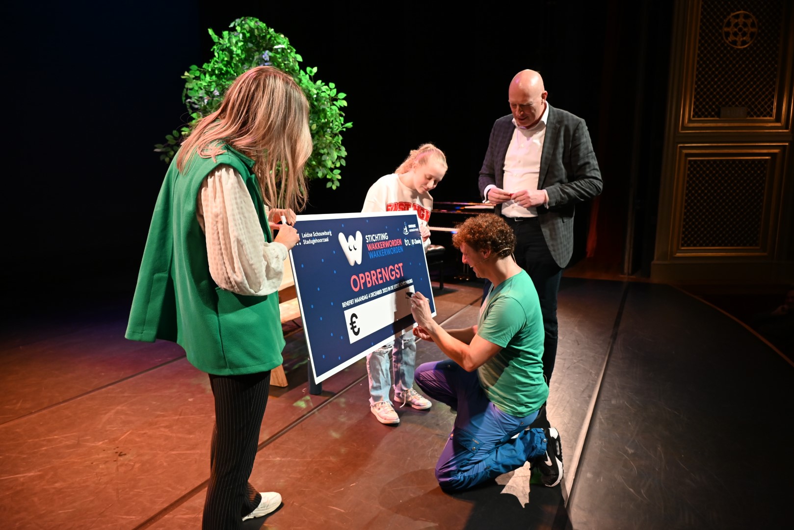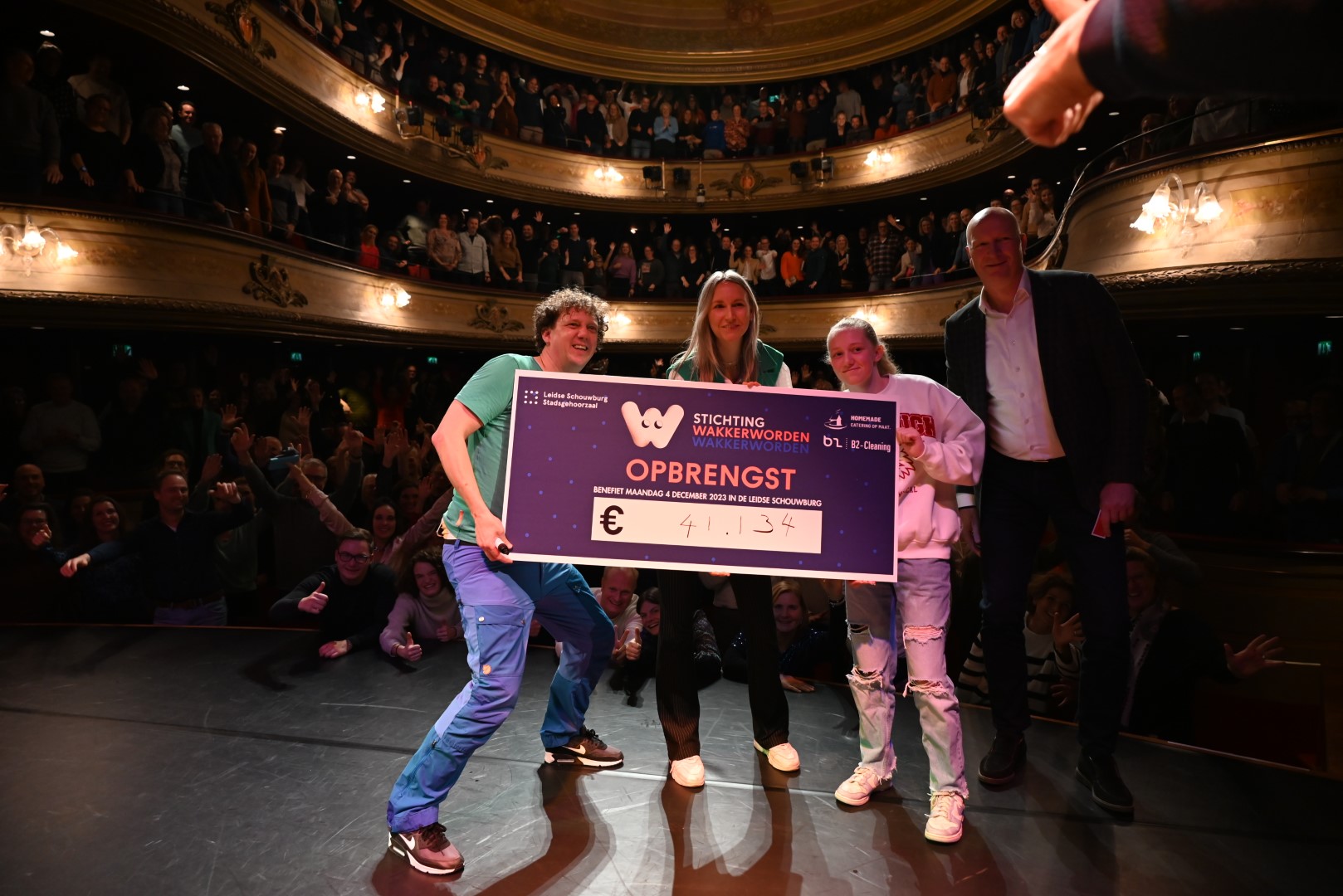 Na afloop van de voorstelling kwamen Sandra Pipping en Limoni Myjer, ambassadrices van de Stichting ‘Wakker Worden Wakker Worden‘, met een cheque het podium op. Die was op dat moment nog blanco en de cabaretier mocht zelf het bedrag invullen. Het totaalbedrag was 41.134 euro.