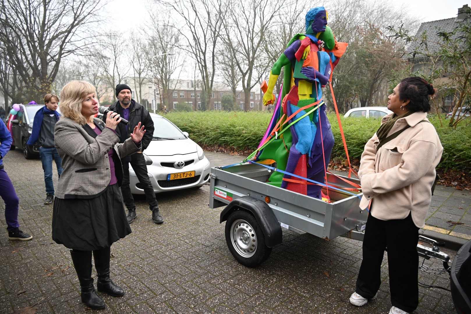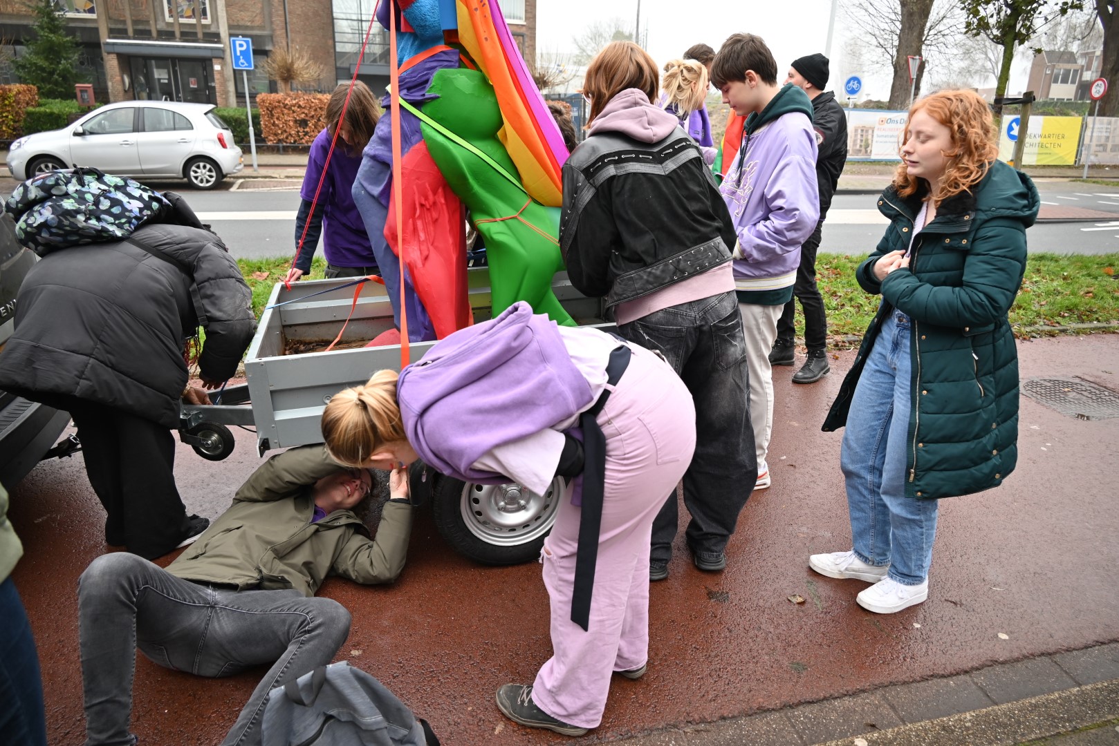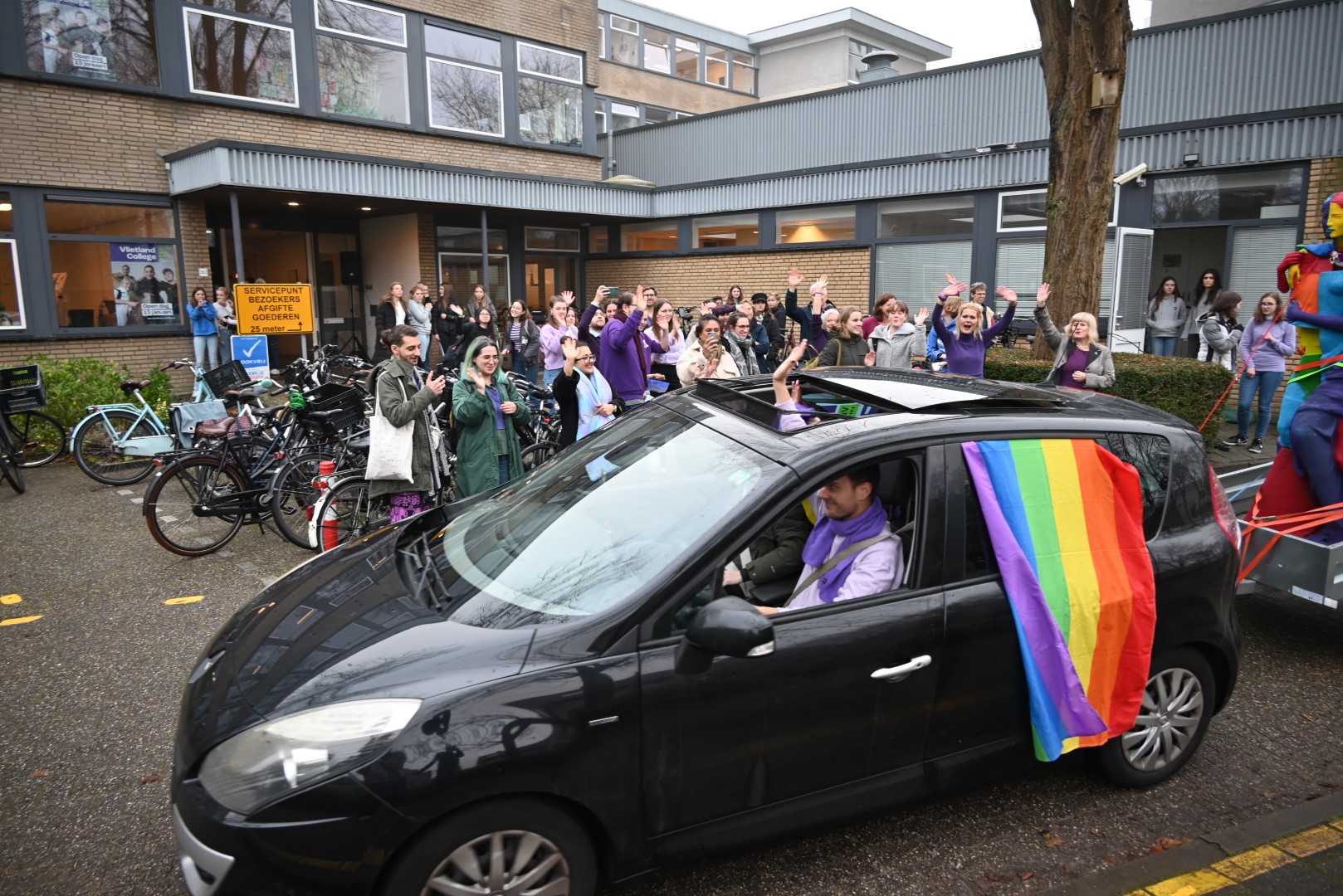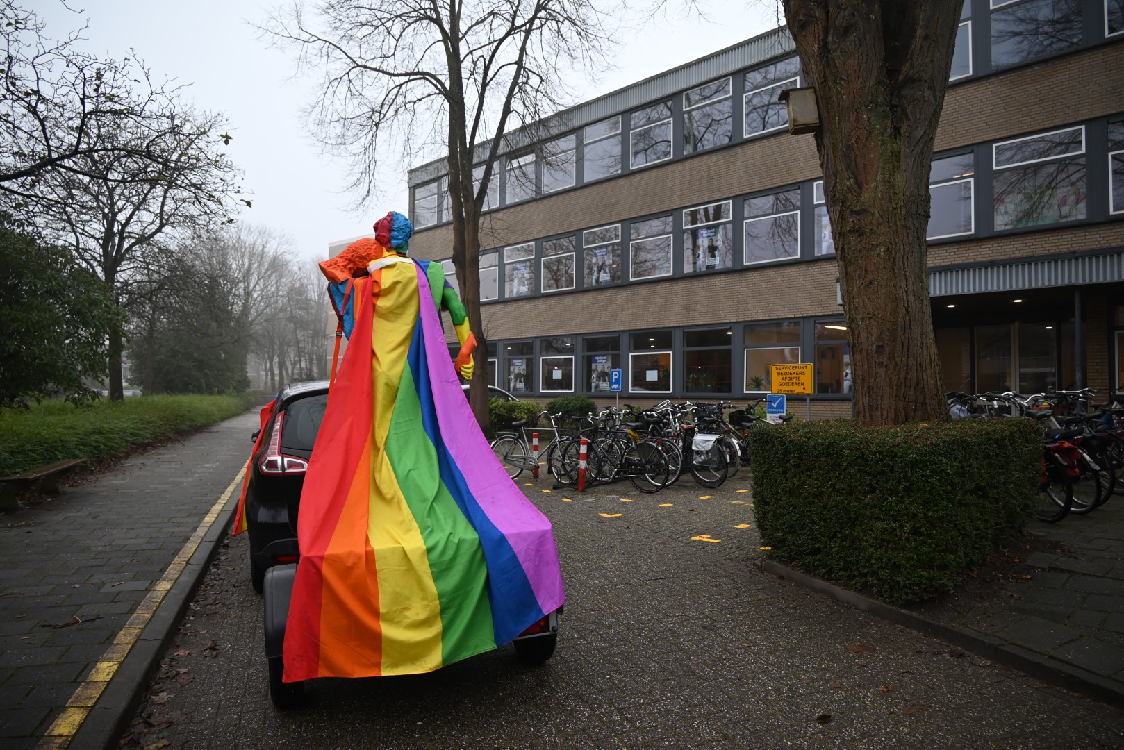 Een replica van het Regenboogkunstwerk op de Haarlemmerstraat staat de komende tijd in het Marecollege in Leiden. Het beeld vertrok vrijdag in een processie van met regenboogvlaggen beklede auto’s vanaf het Vlietland College, waar het het afgelopen jaar heeft gestaan. Het is de bedoeling dat het beeld ieder jaar doorreist naar een andere school in Leiden of de Leidse regio.