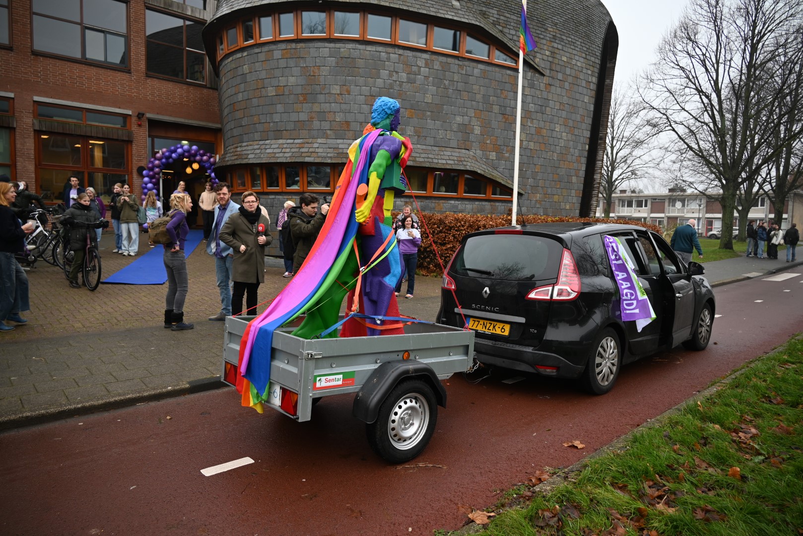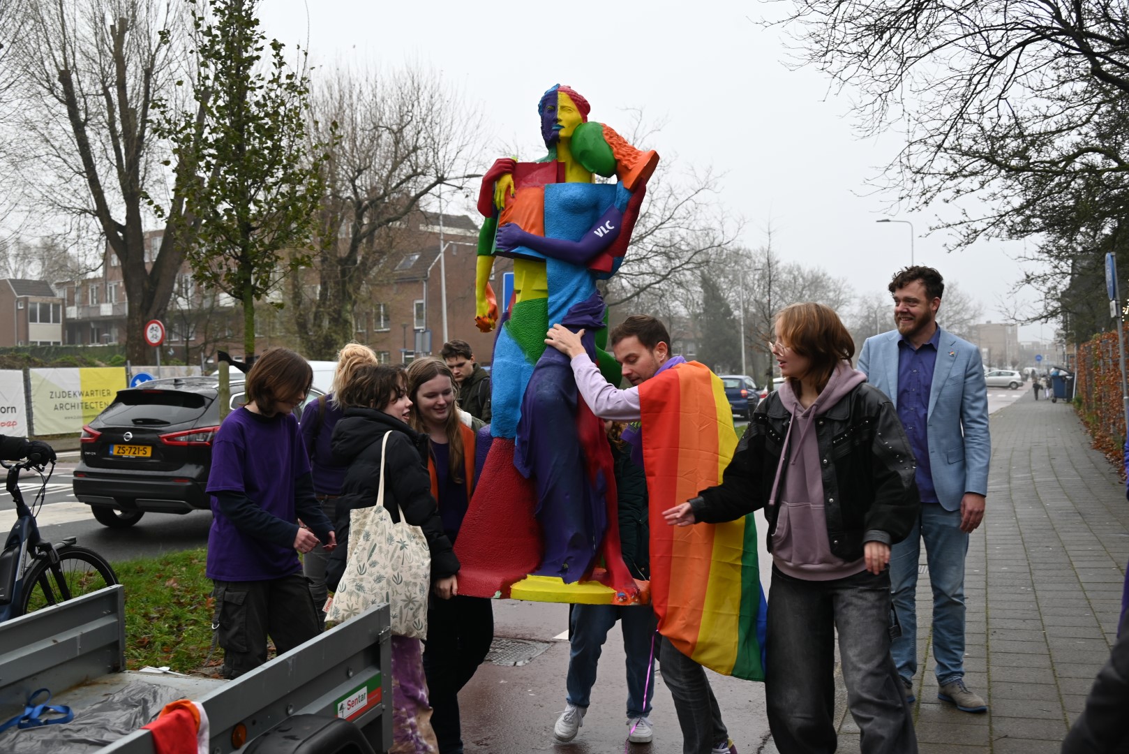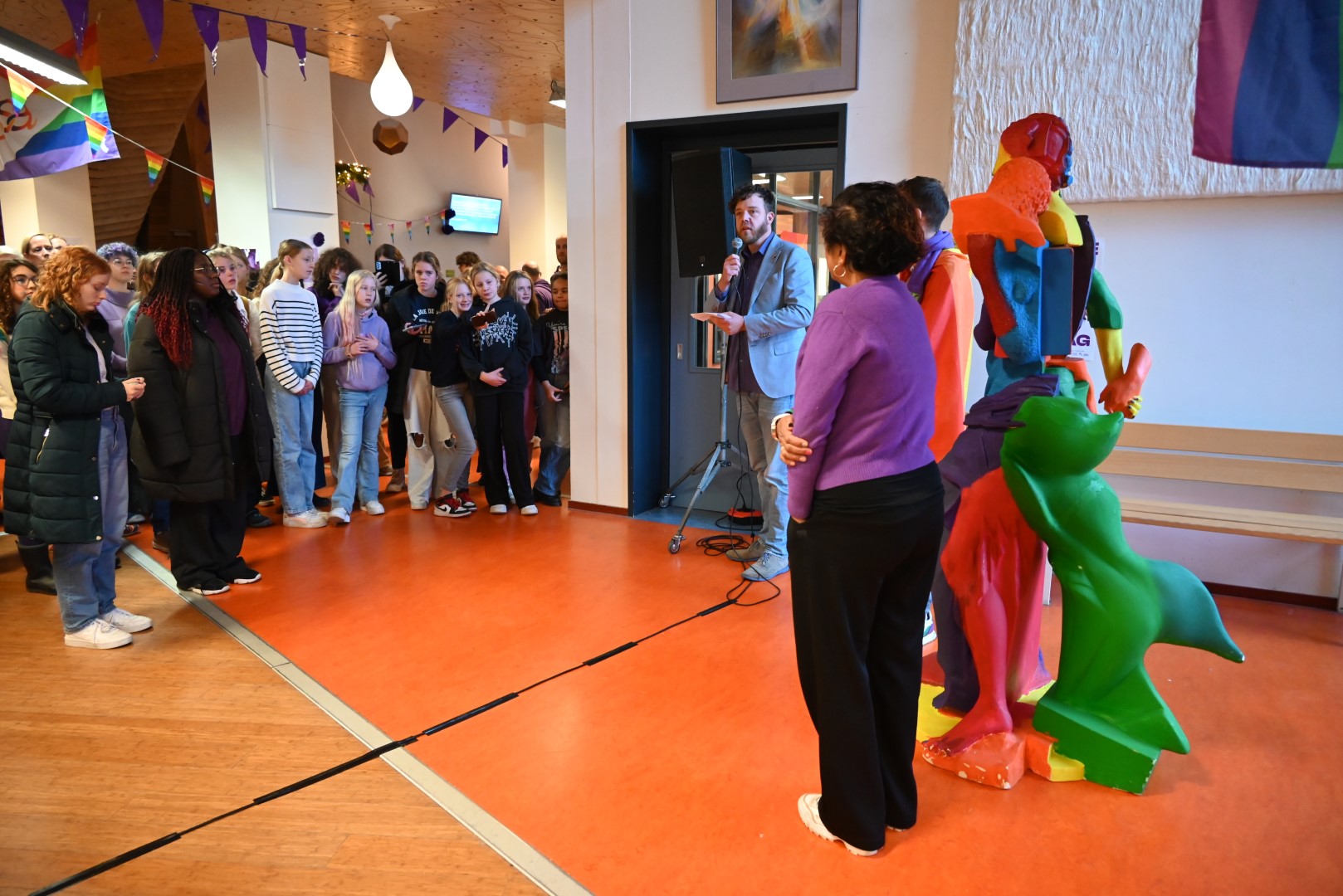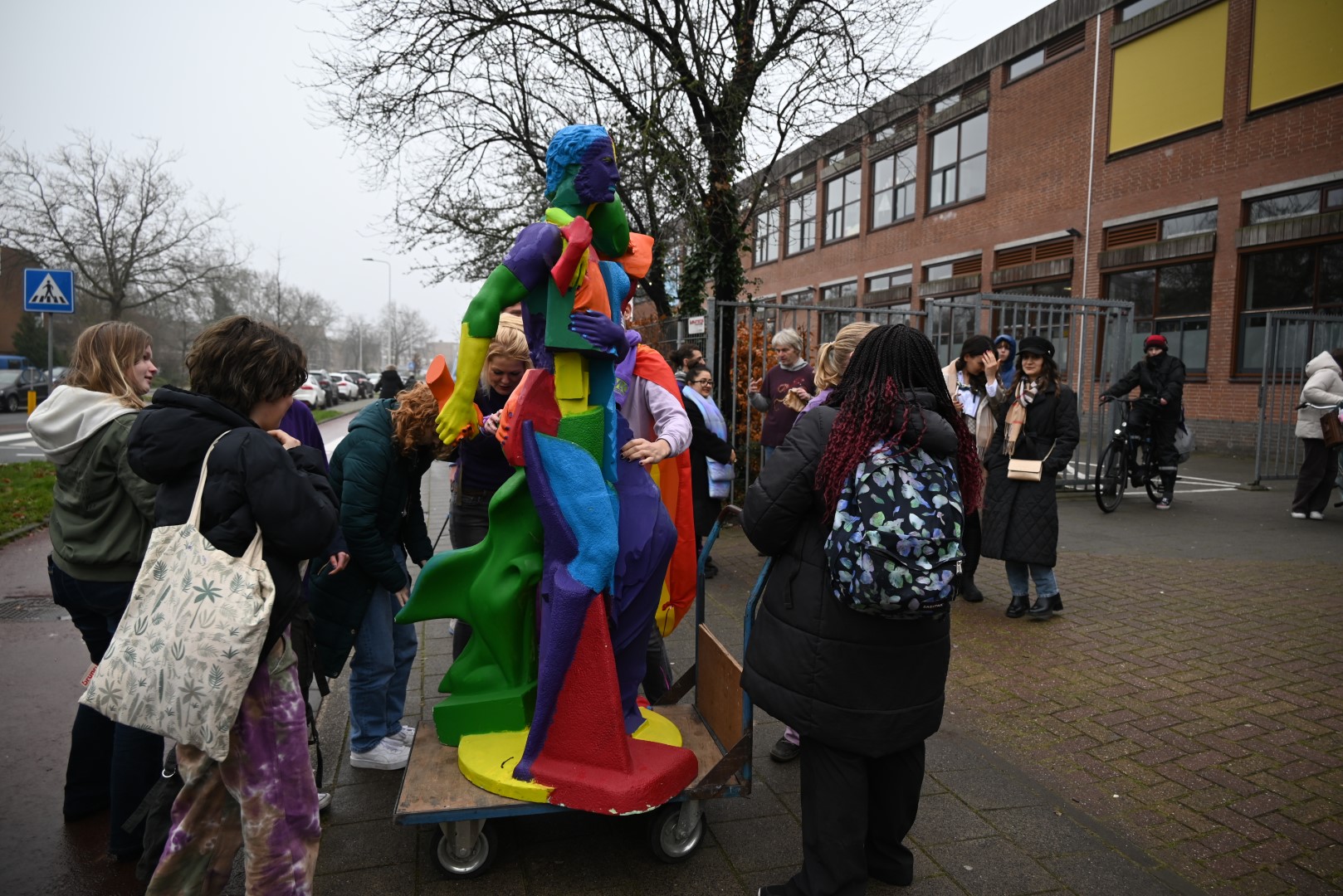 Dat is dan ook hoe het beeld vrijdag op het Marecollege terecht is gekomen. De datum is niet willekeurig gekozen. Deze dag is het Paarse Vrijdag, waar mensen solidariteit tonen met de lhbtiq+-gemeenschap door het dragen van paarse kleding. Sander Roodink, de rector van het Marecollege is blij dat het beeld het komende jaar te zien is op zijn school. “Onze GSA is altijd al een actieve club geweest binnen de school maar het is fijn om te zien dat dit beeld hier nog meer aandacht voor genereert.”