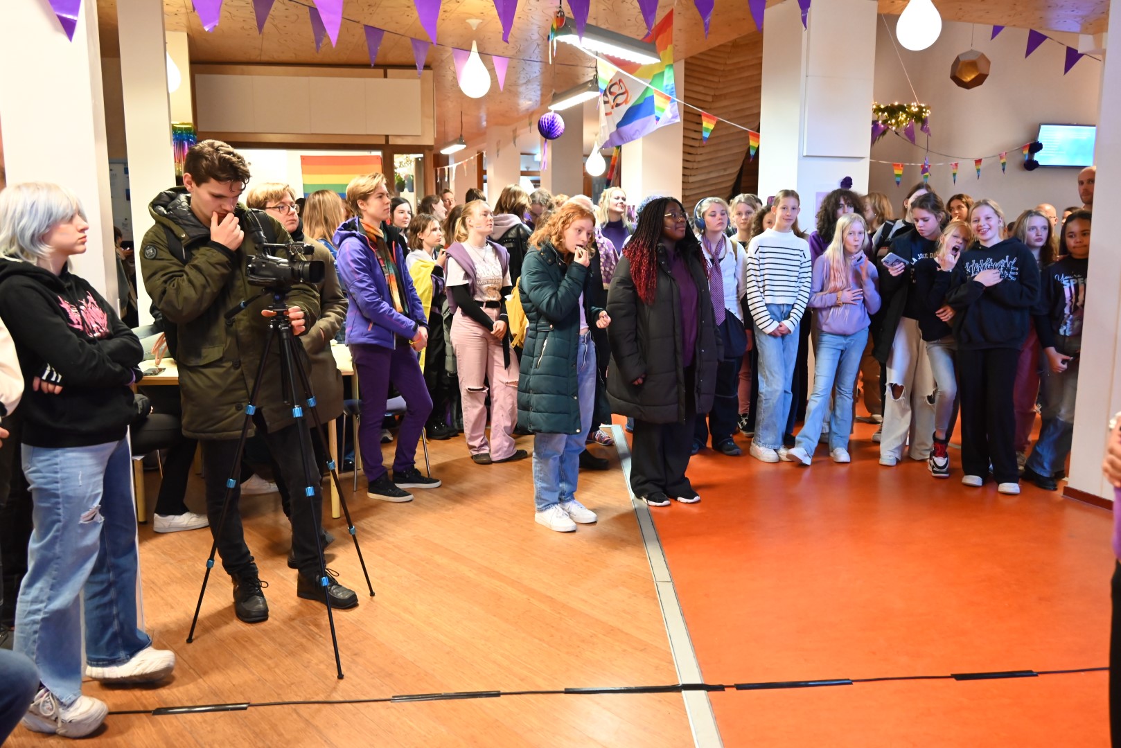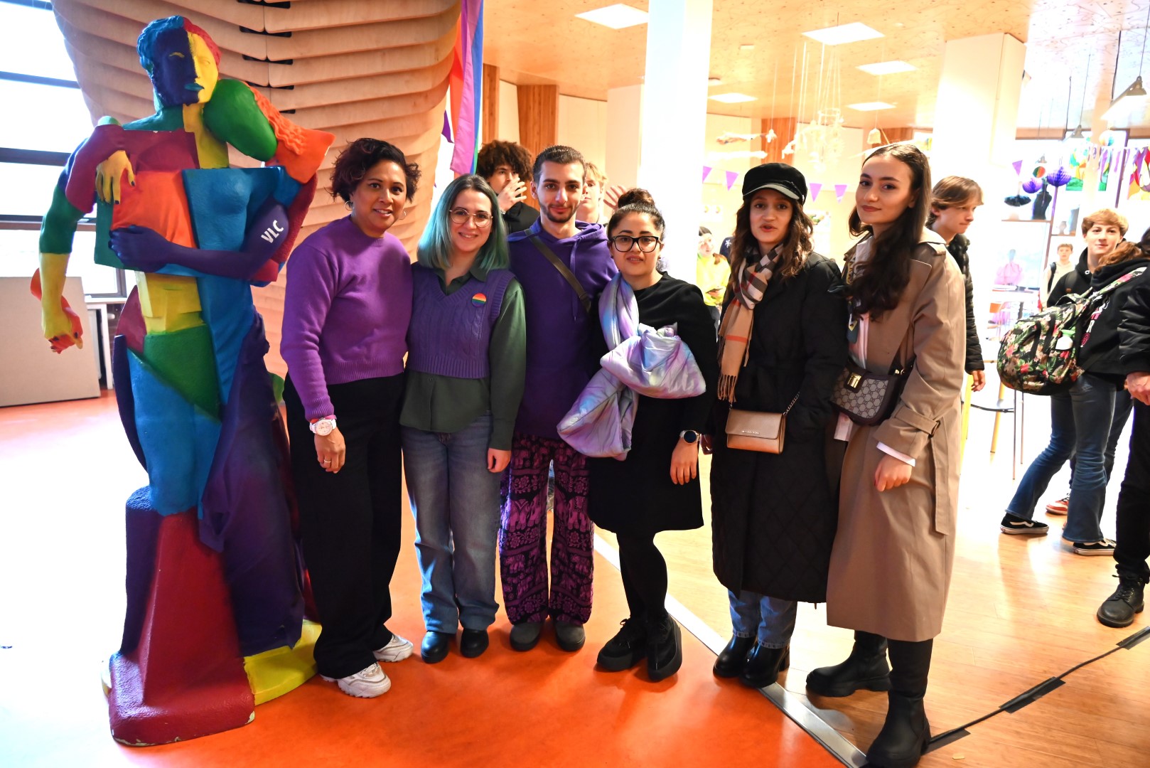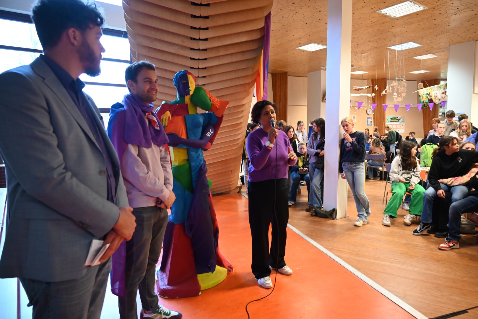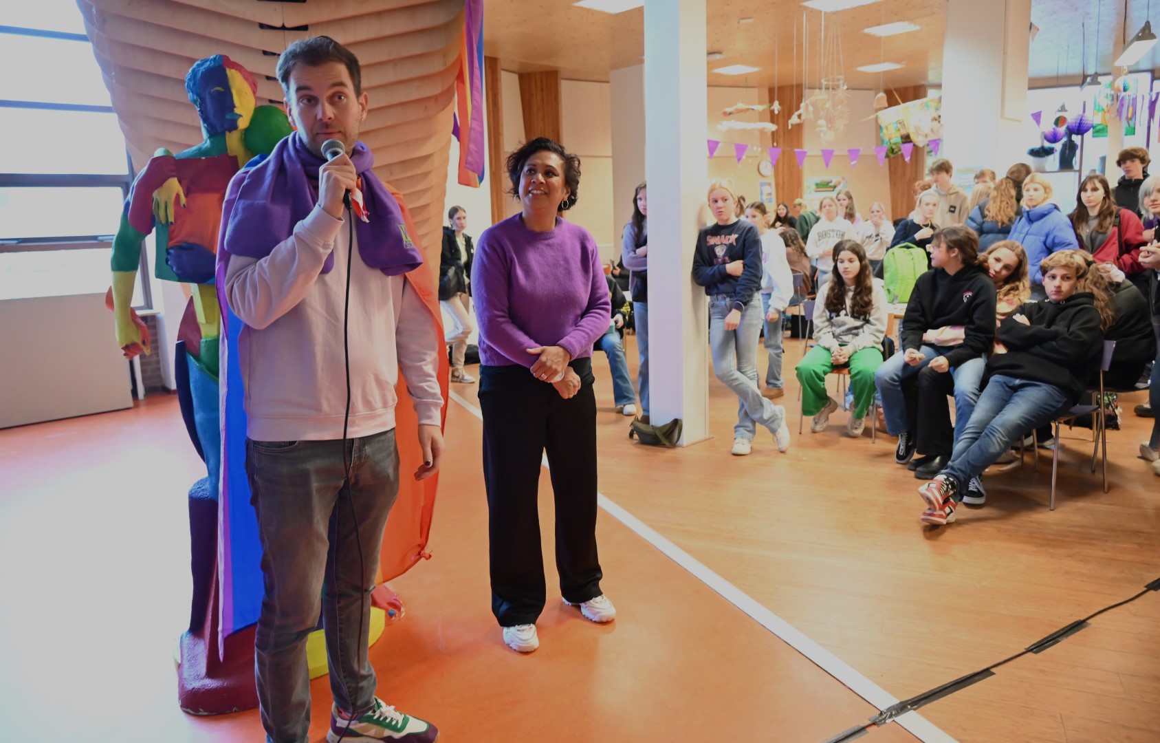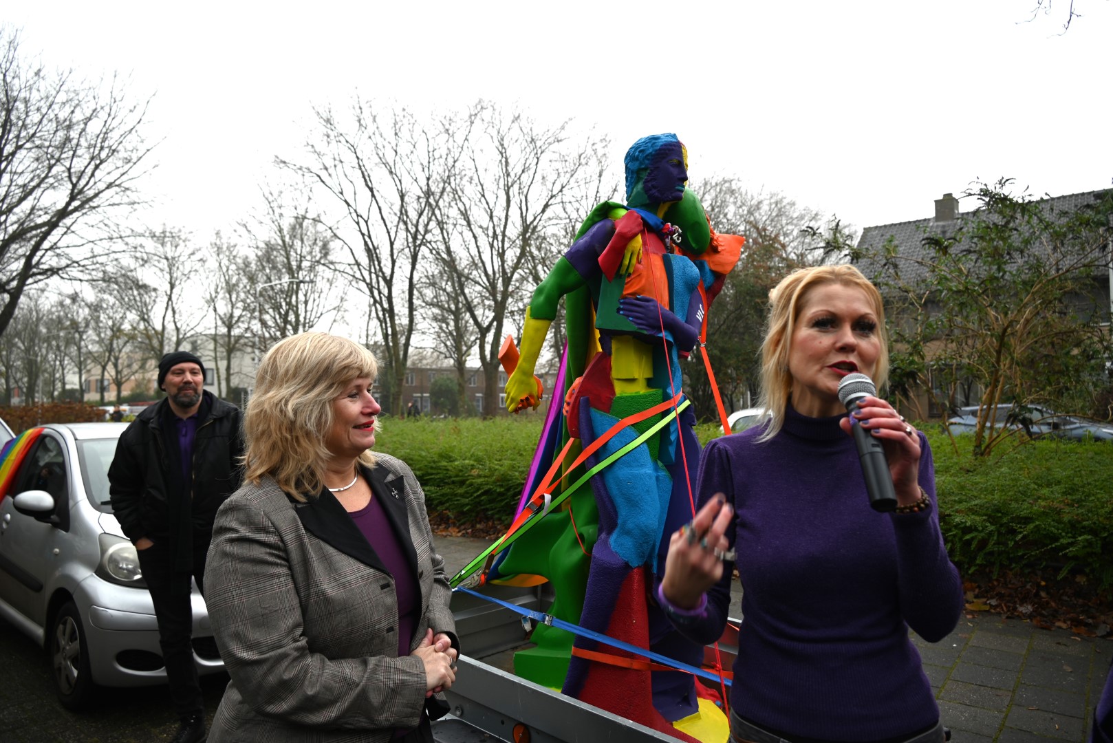 Dat is dan ook hoe het beeld vrijdag op het Marecollege terecht is gekomen. De datum is niet willekeurig gekozen. Deze dag is het Paarse Vrijdag, waar mensen solidariteit tonen met de lhbtiq+-gemeenschap door het dragen van paarse kleding. Sander Roodink, de rector van het Marecollege is blij dat het beeld het komende jaar te zien is op zijn school. “Onze GSA is altijd al een actieve club geweest binnen de school maar het is fijn om te zien dat dit beeld hier nog meer aandacht voor genereert.”