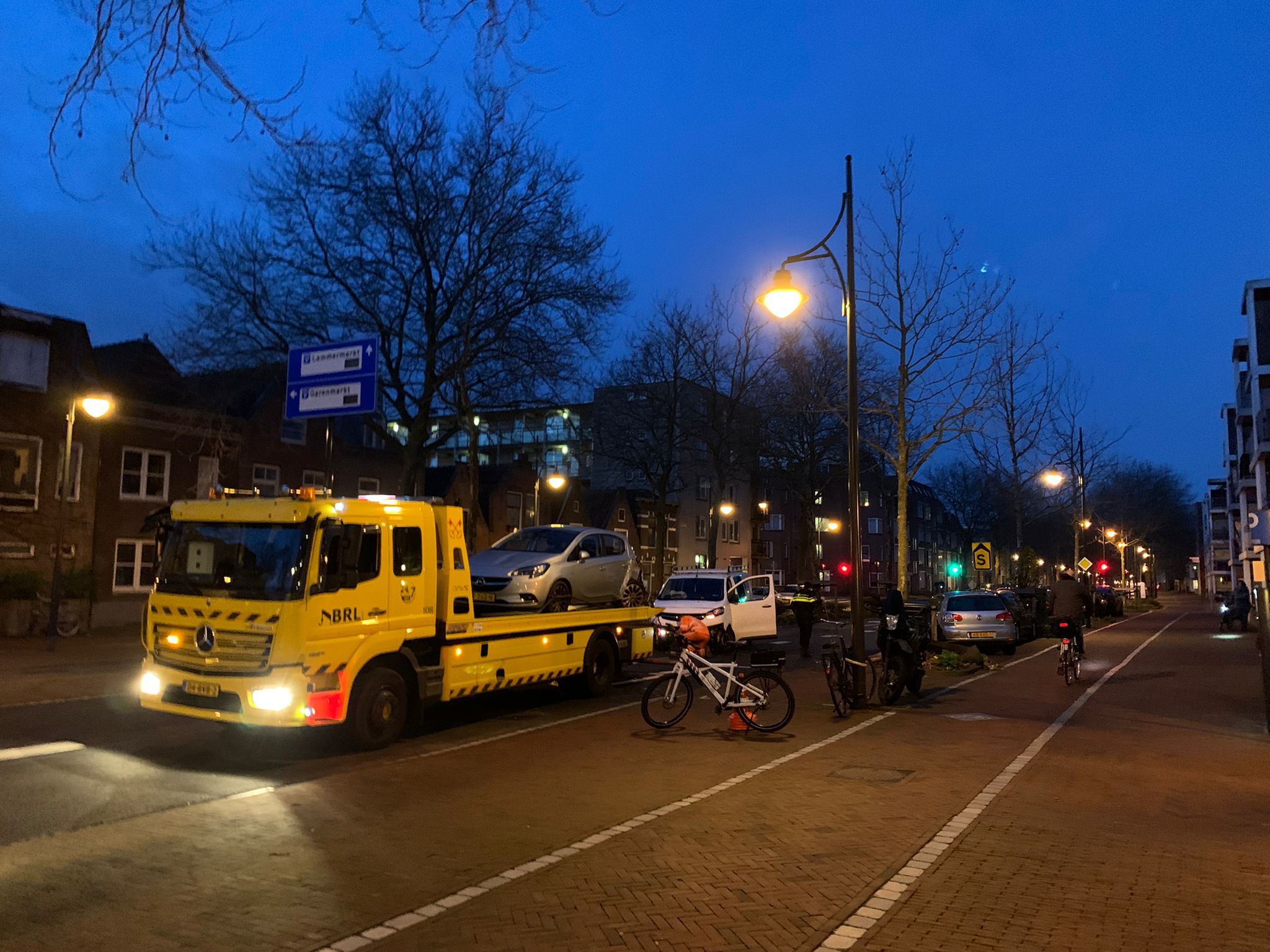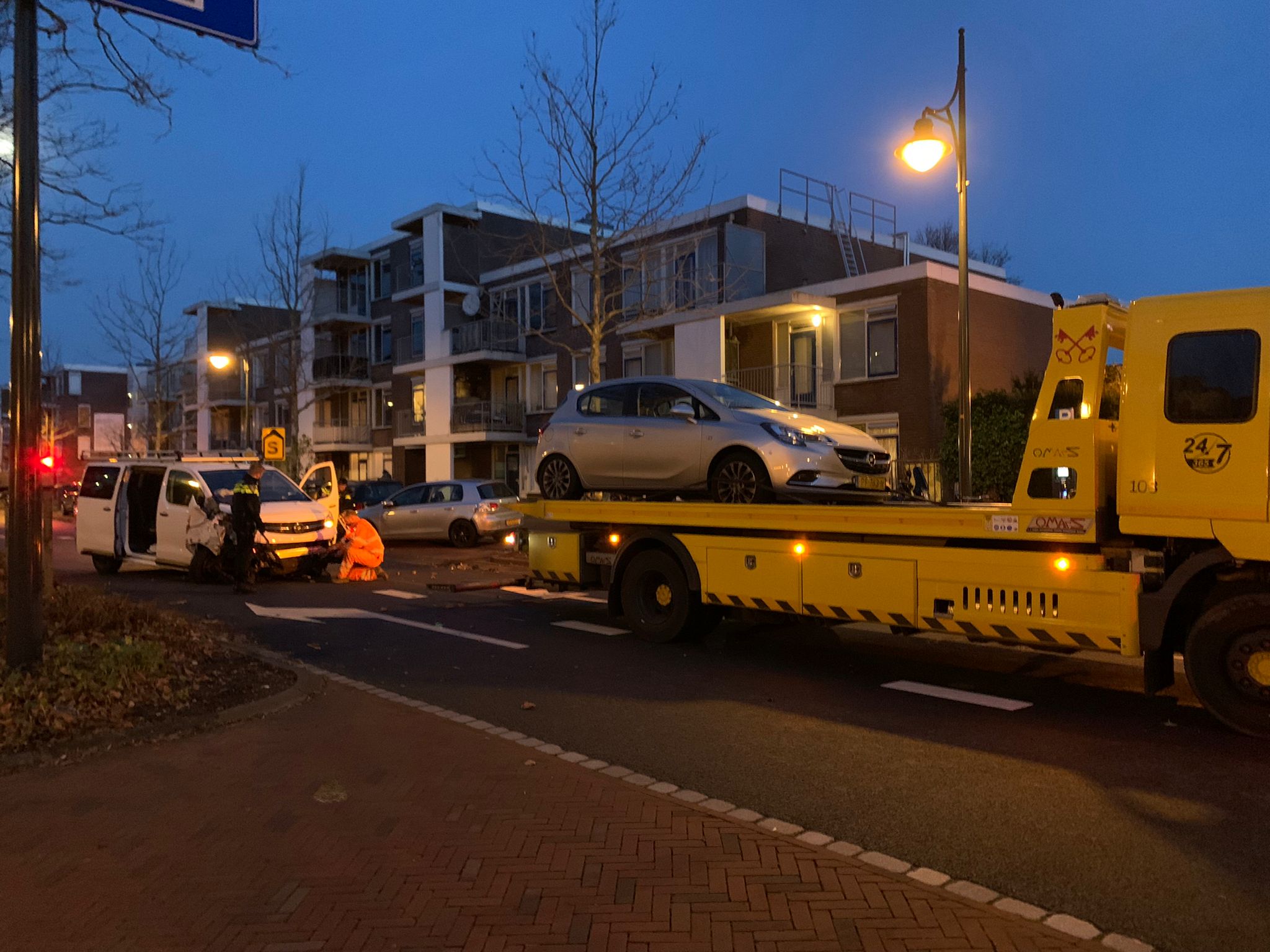 Een bestelbusje is vanmorgen vroeg, rond 5.15 uur, op een personenauto gebotst. Dat gebeurde op de Langegracht in Leiden, bij de kruising met de Klokpoort.